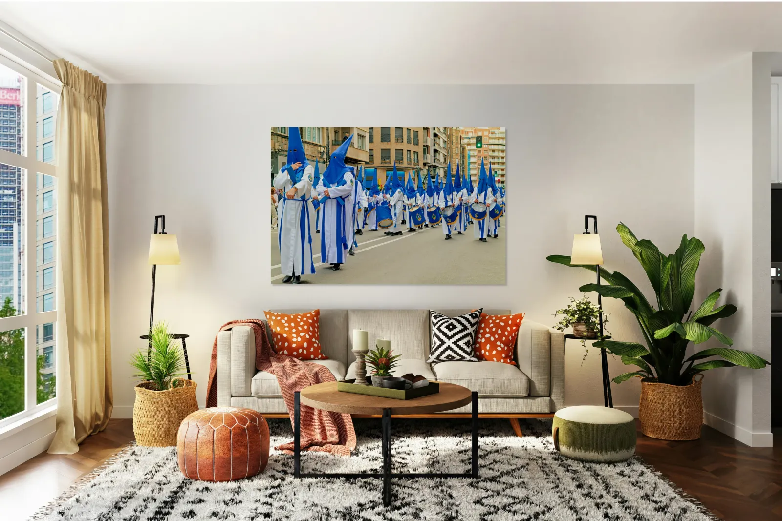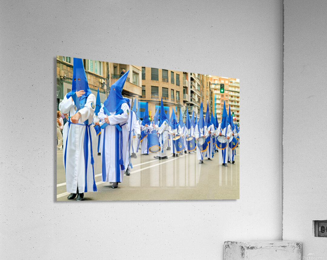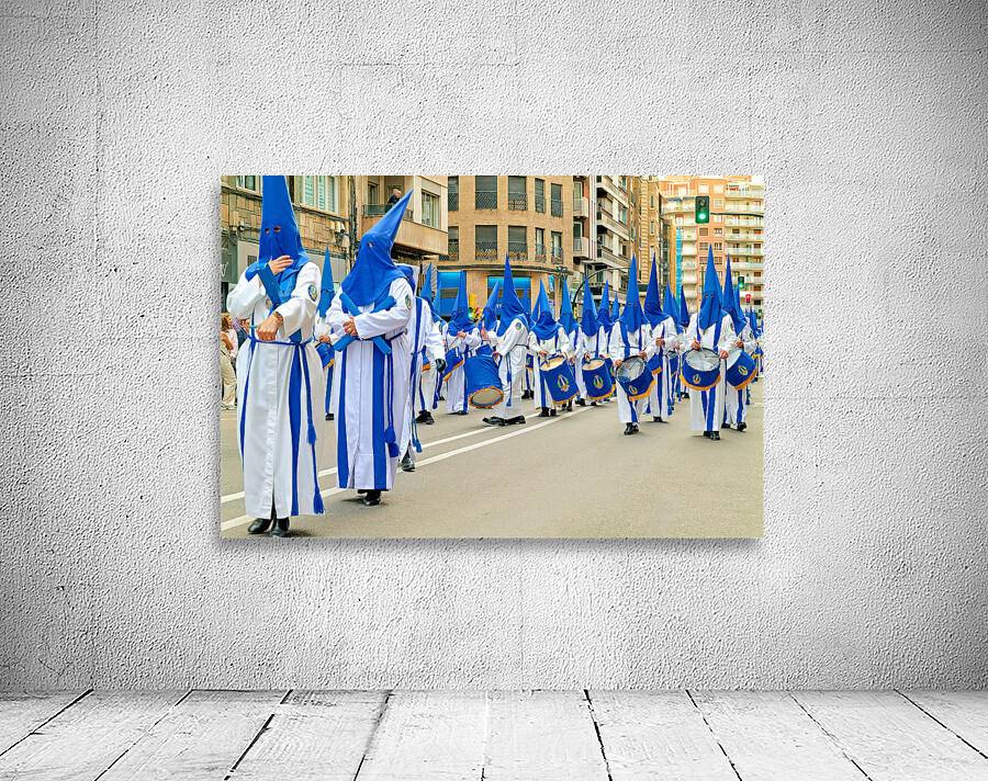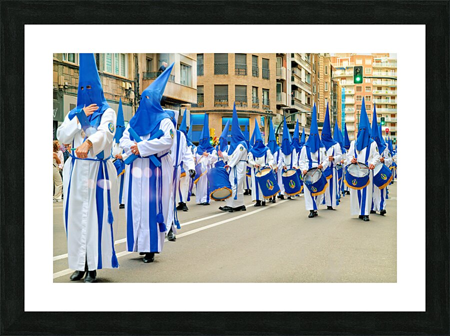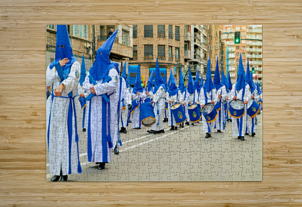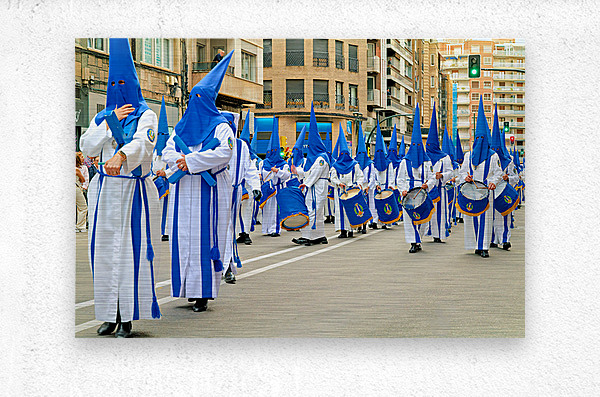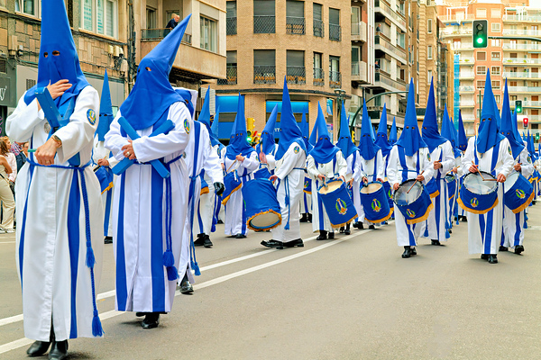 People in blue robes and pointed hats walk through the streets of Zaragoza during Easter Holy Week. Drums are played as part of the event.