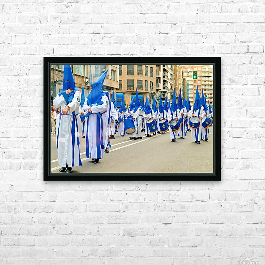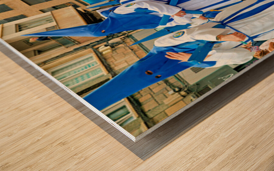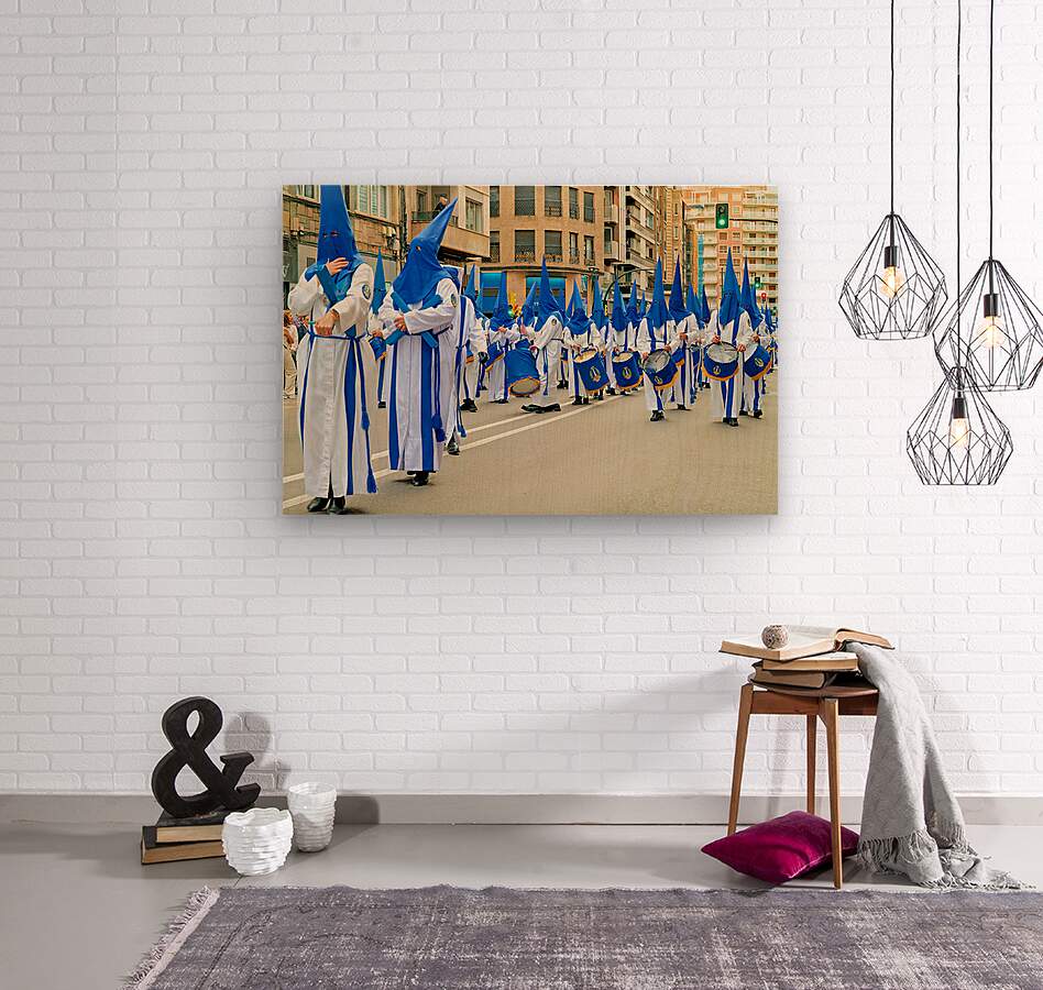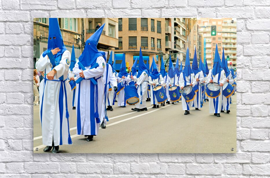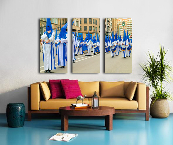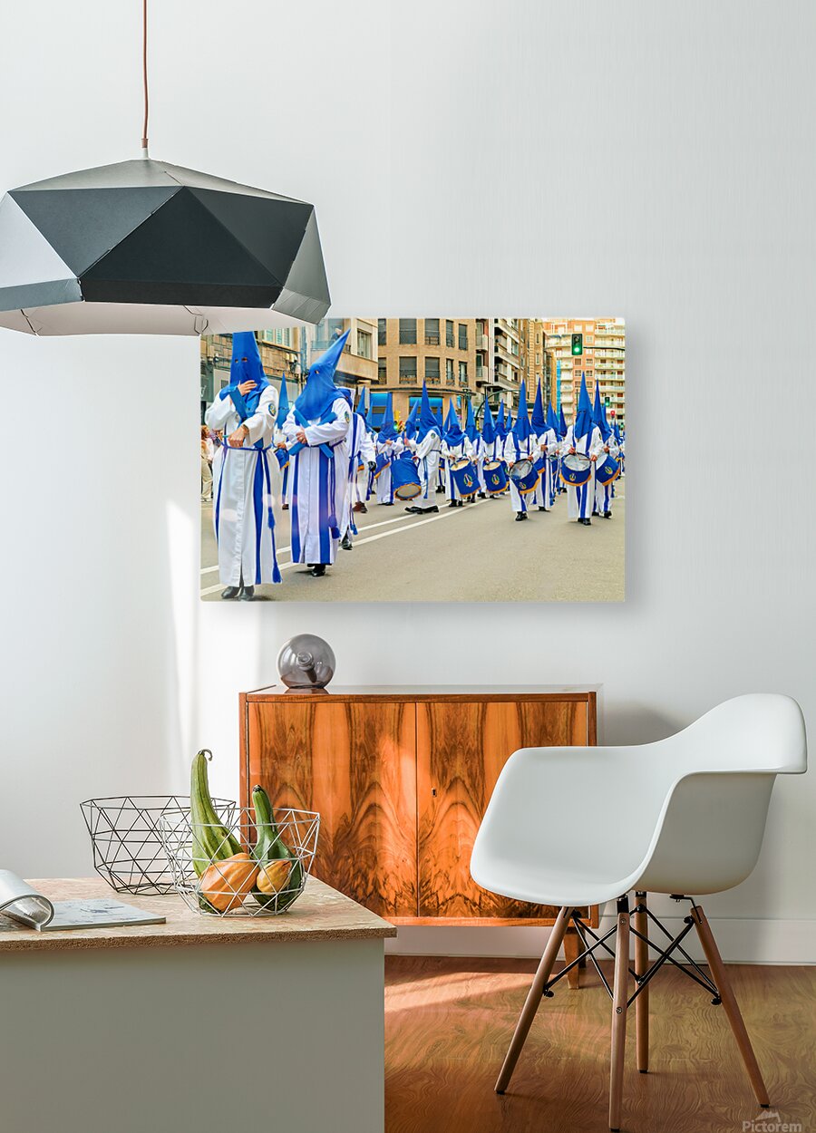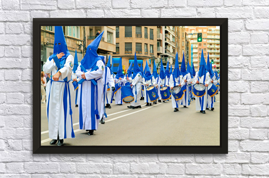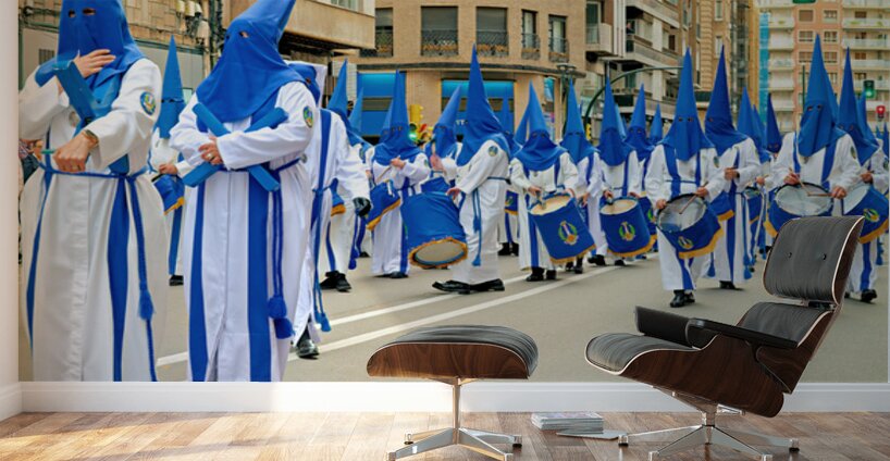 People in blue robes and pointed hats walk through the streets of Zaragoza during Easter Holy Week. Drums are played as part of the event.