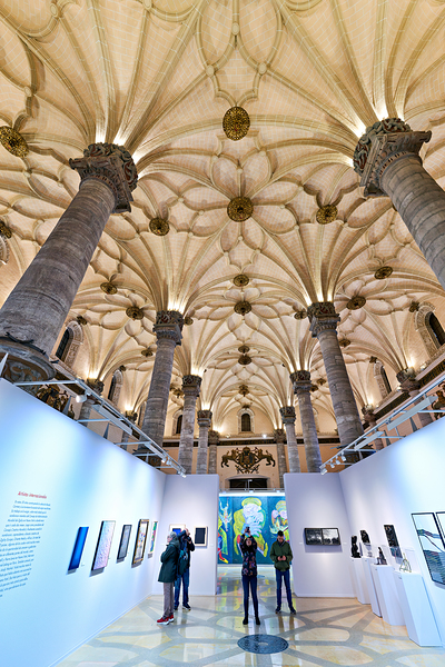People walk through an art exhibition in Sala de Exposiciones La Lonja. The tall ceiling and sculpted pillars create a unique setting.