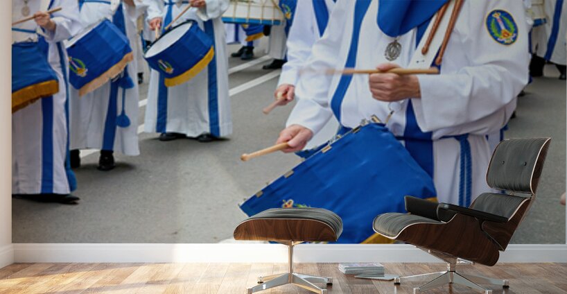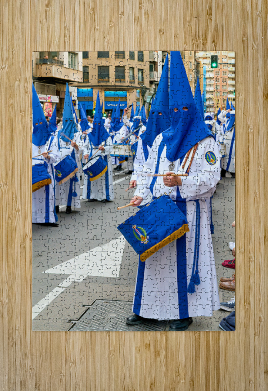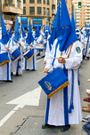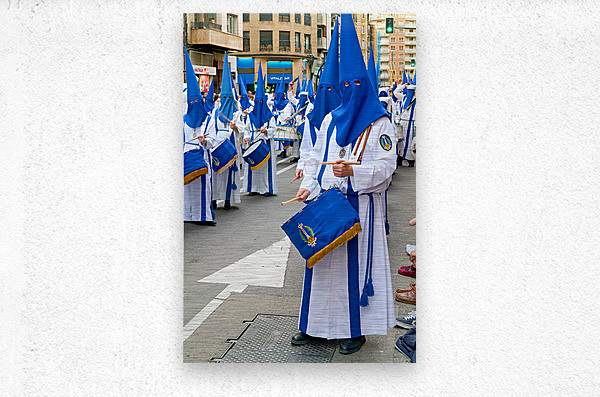 People participate in processions for Easter Holy Week in Zaragoza Spain. They wear traditional clothing and carry drums while marching.