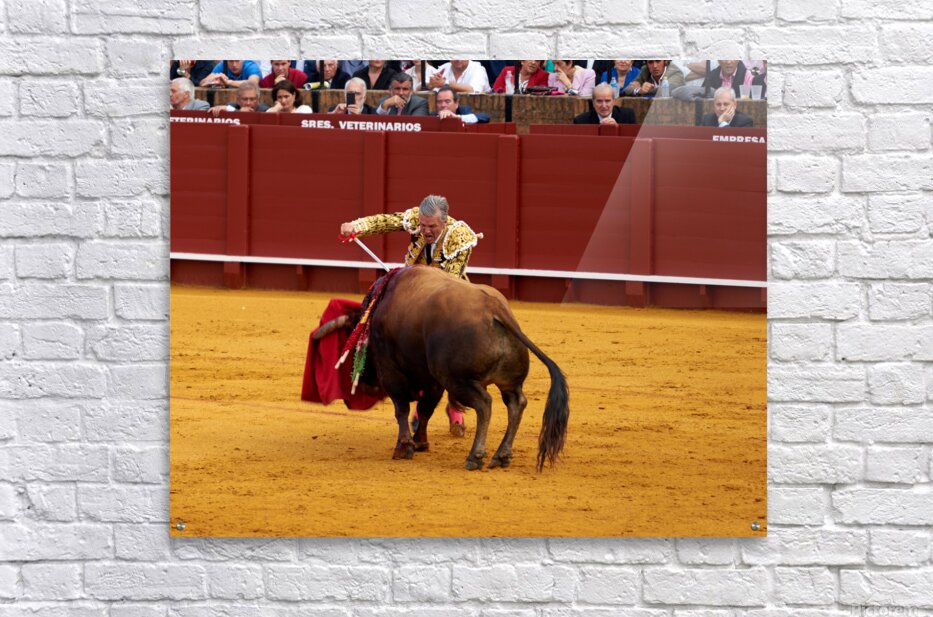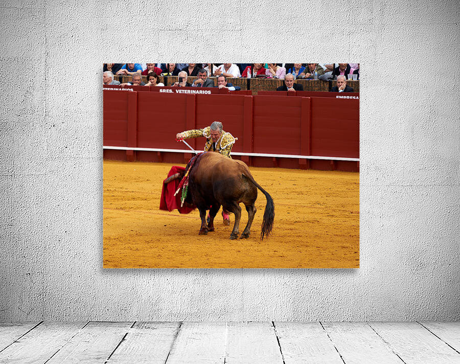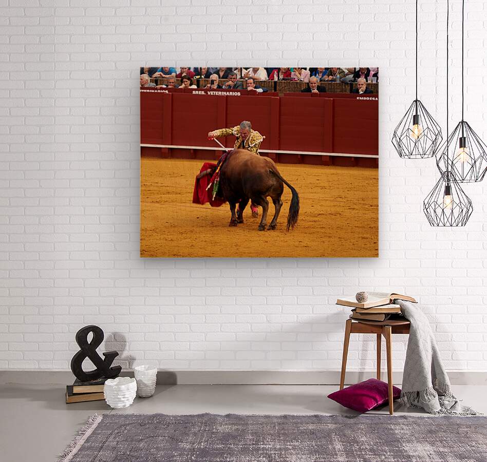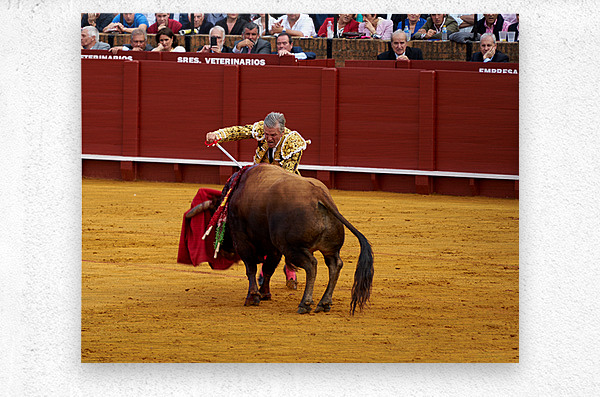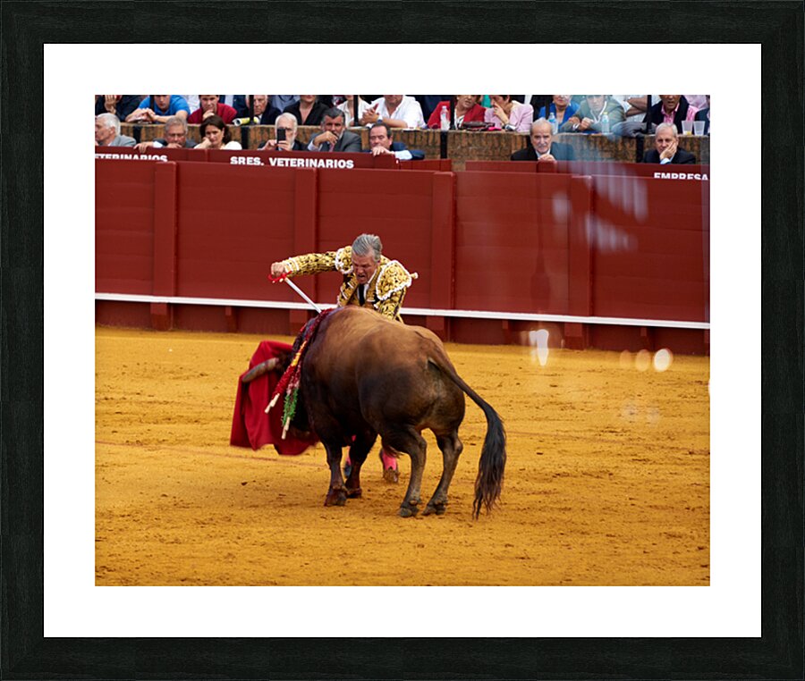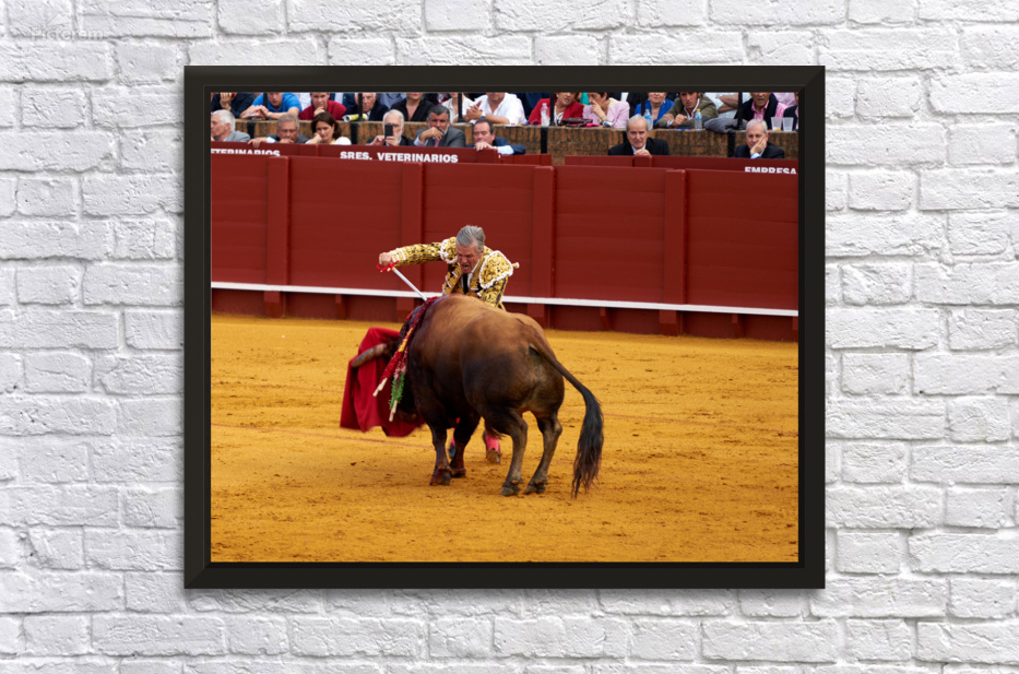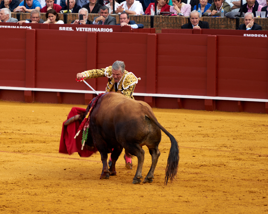 A bullfighter engages with a bull during a traditional bullfight in Seville Arena in Andalusia Spain. Many spectators watch.