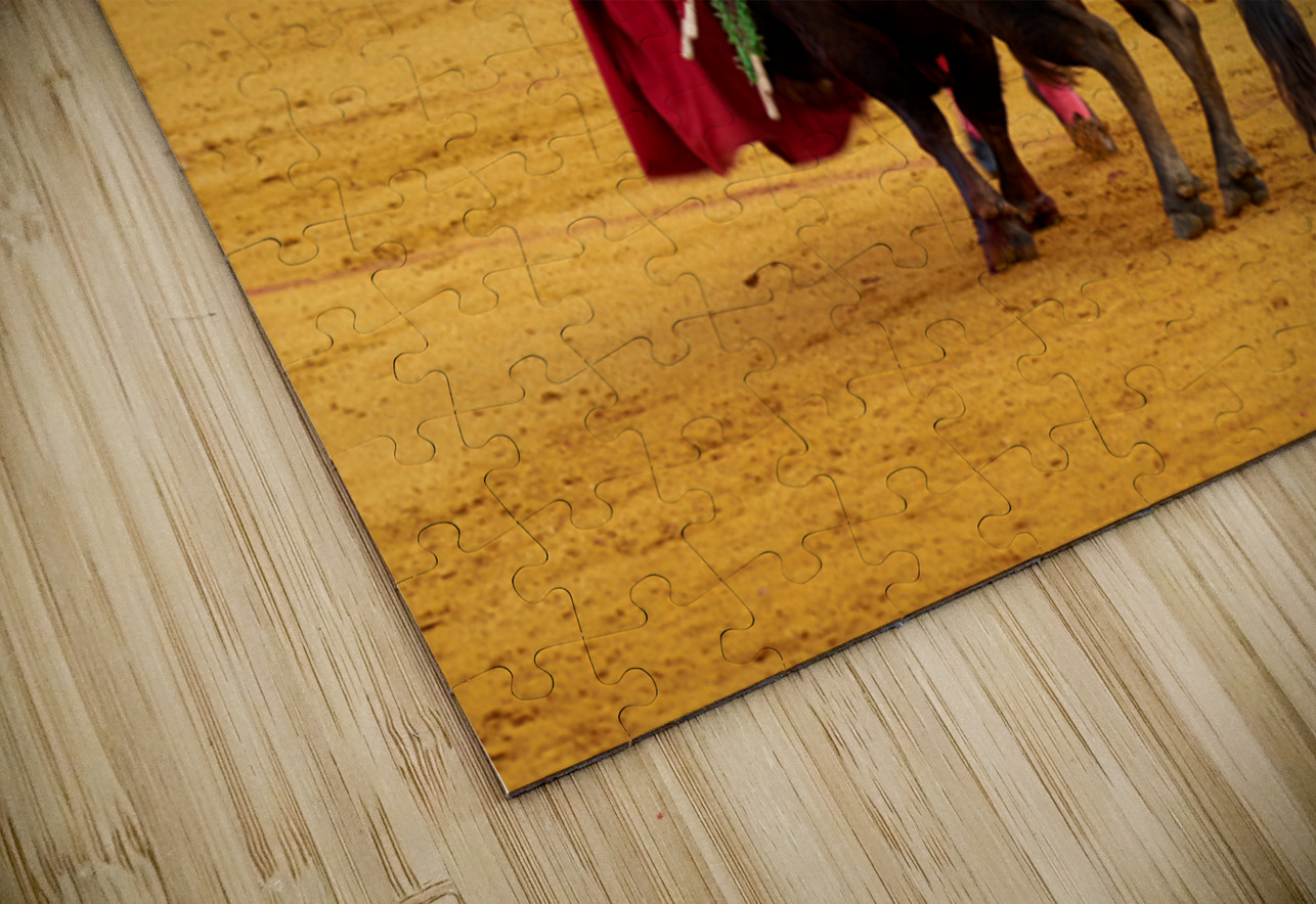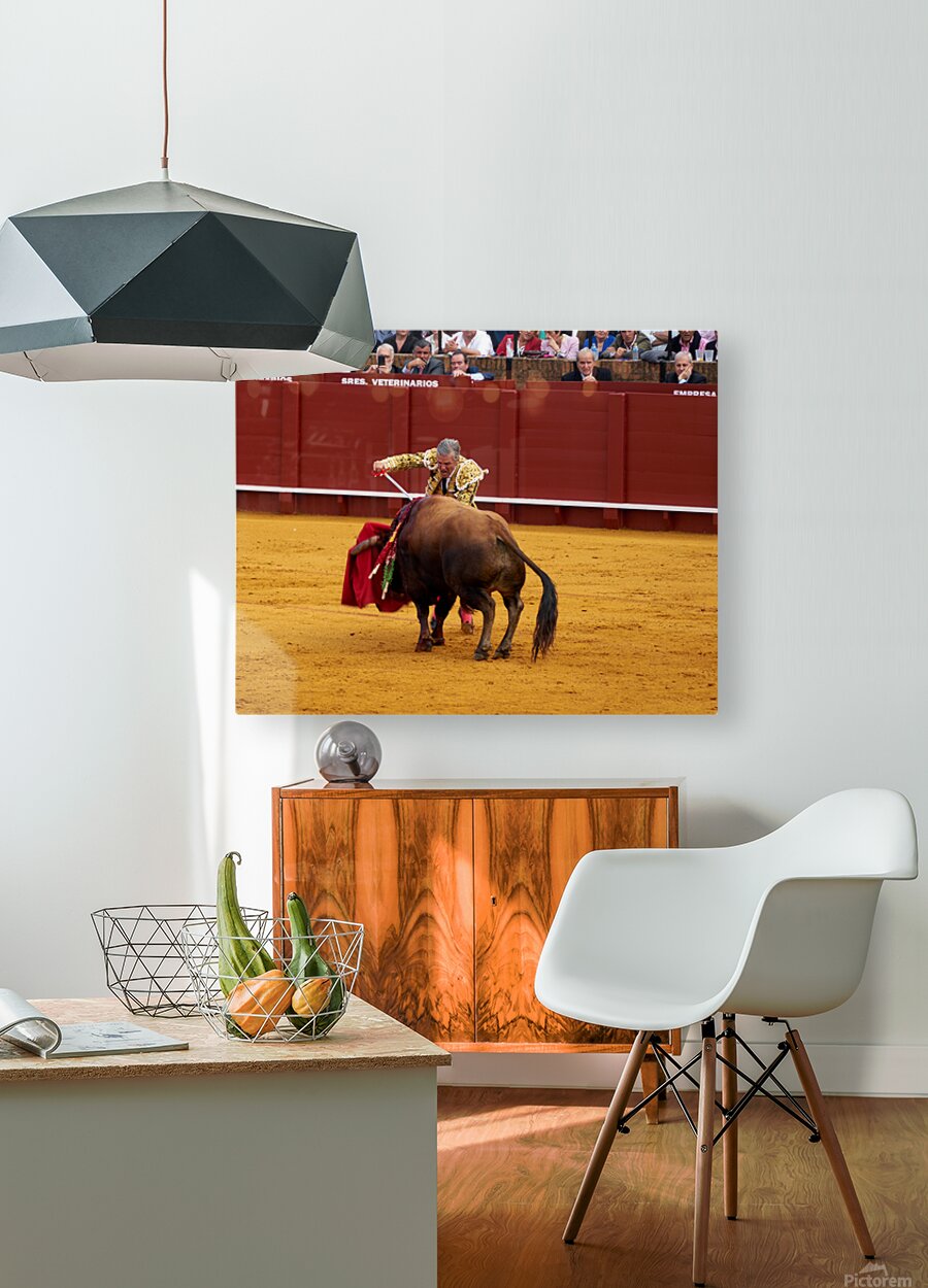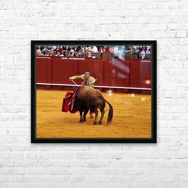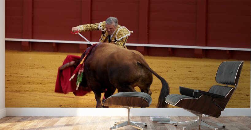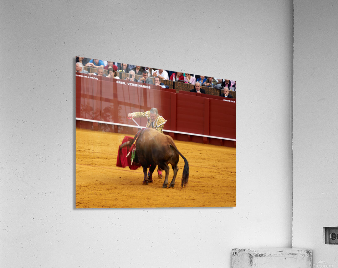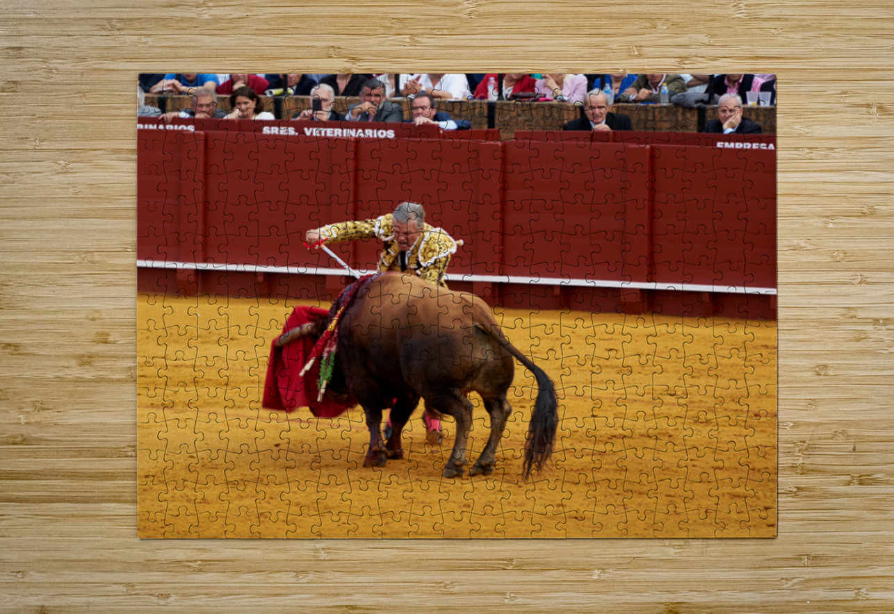 A bullfighter engages with a bull during a traditional bullfight in Seville Arena in Andalusia Spain. Many spectators watch.