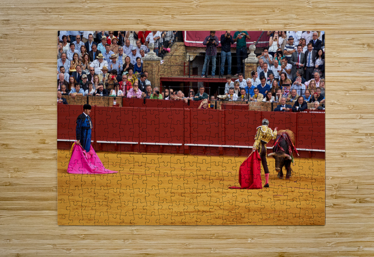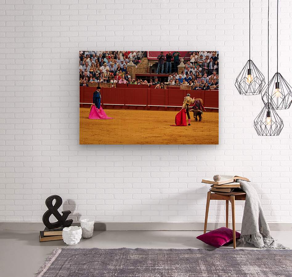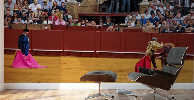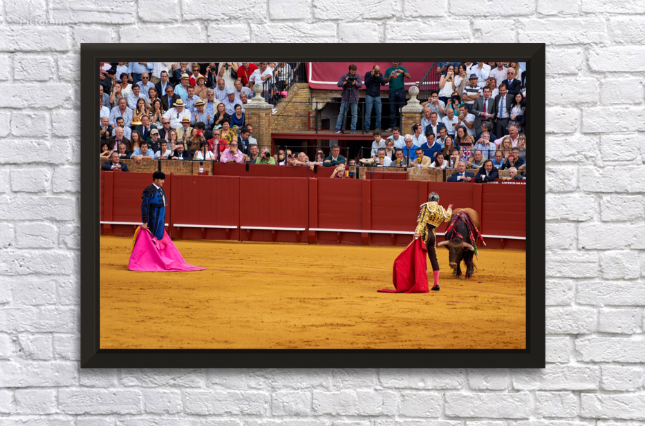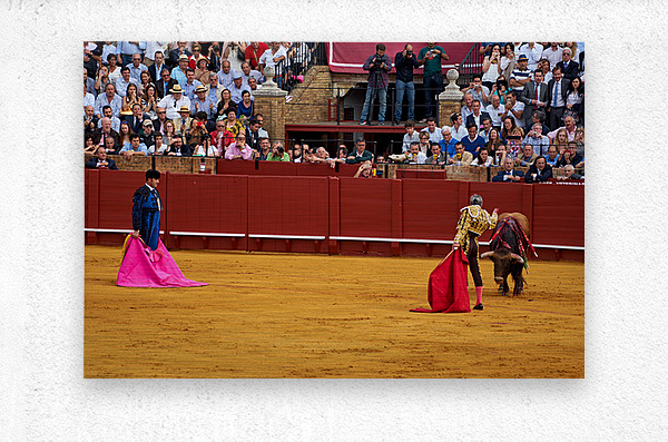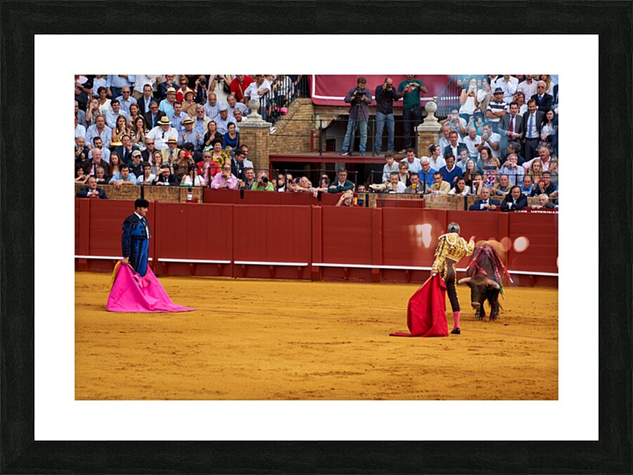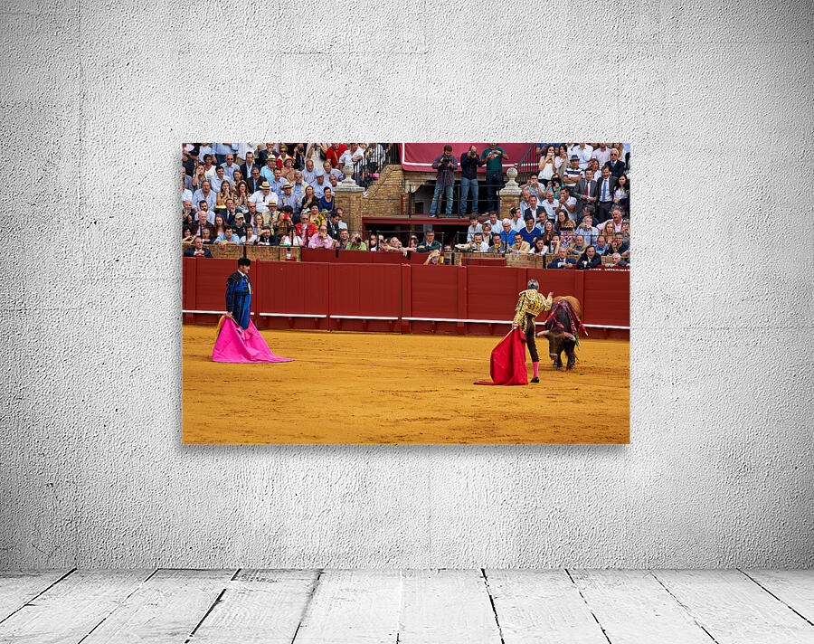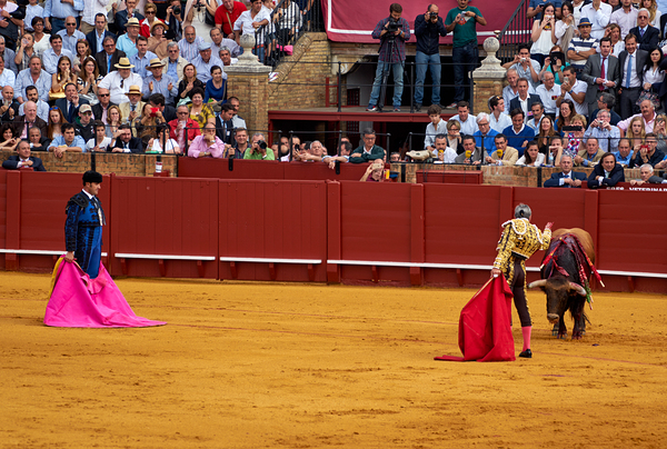 Two matadors face a bull in Seville Arena as spectators watch the action unfold during a bullfight. The crowd shows excitement and engagement.
