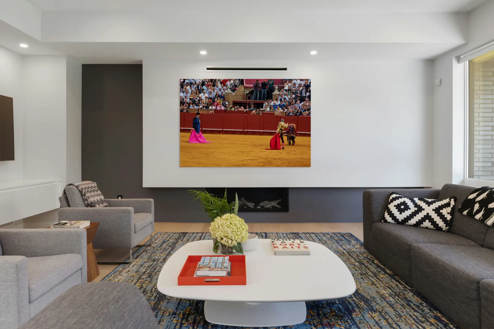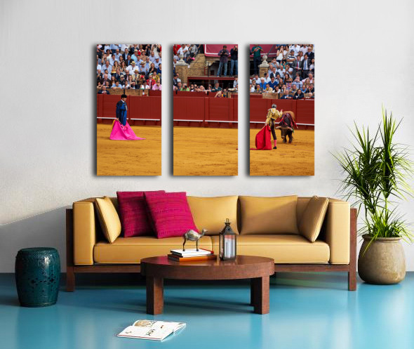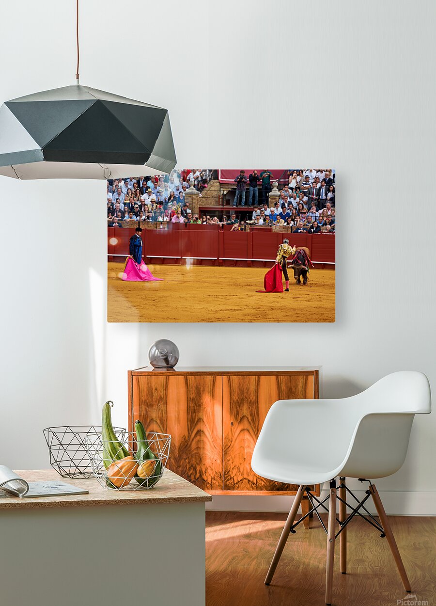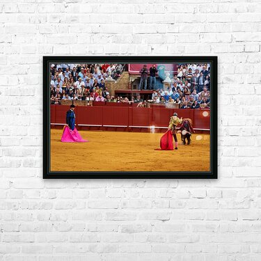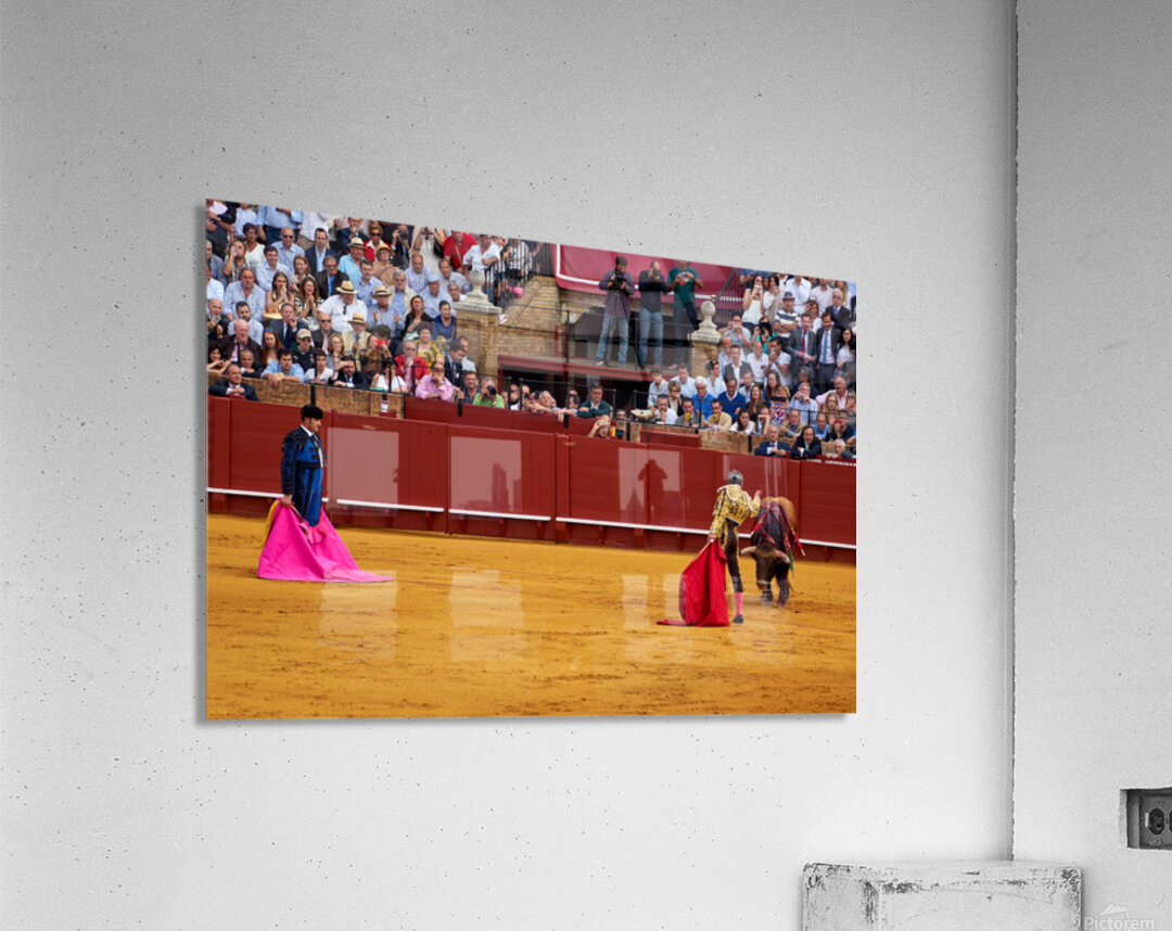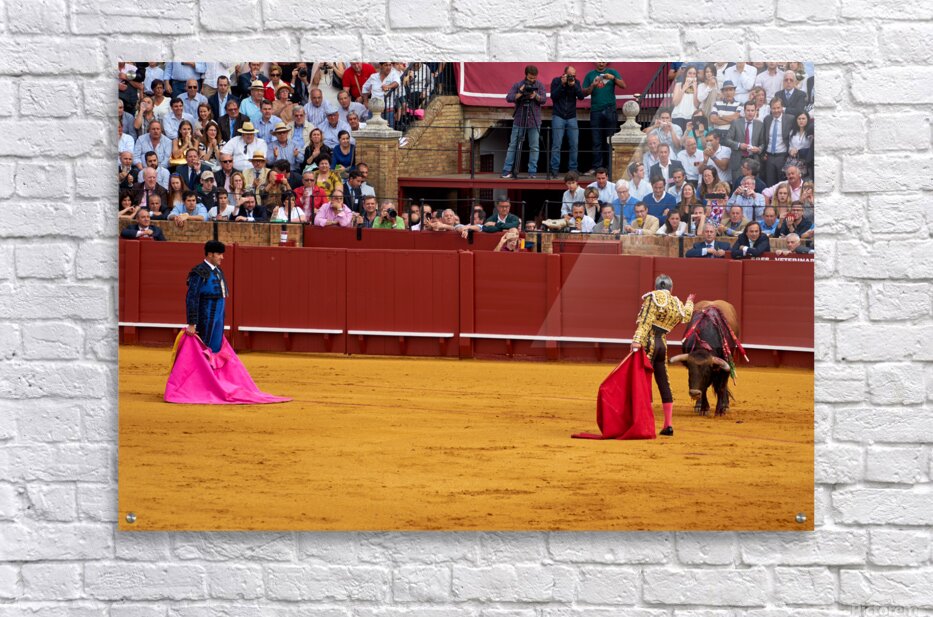 Two matadors face a bull in Seville Arena as spectators watch the action unfold during a bullfight. The crowd shows excitement and engagement.