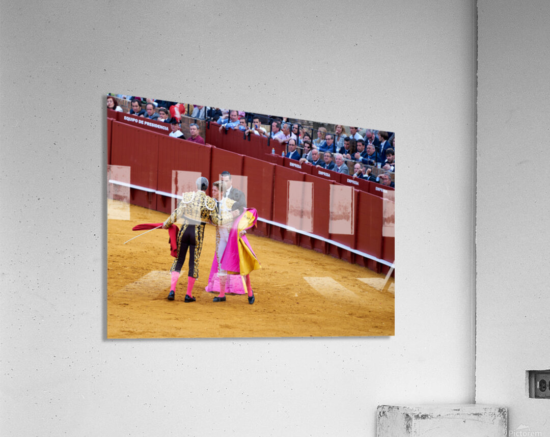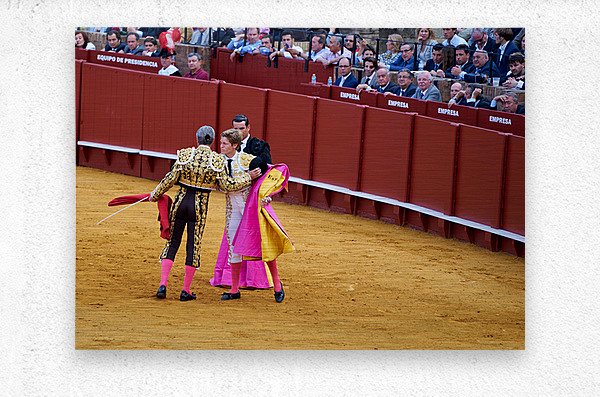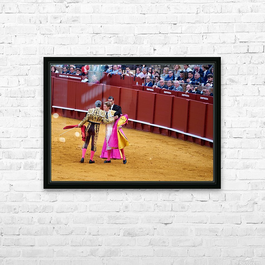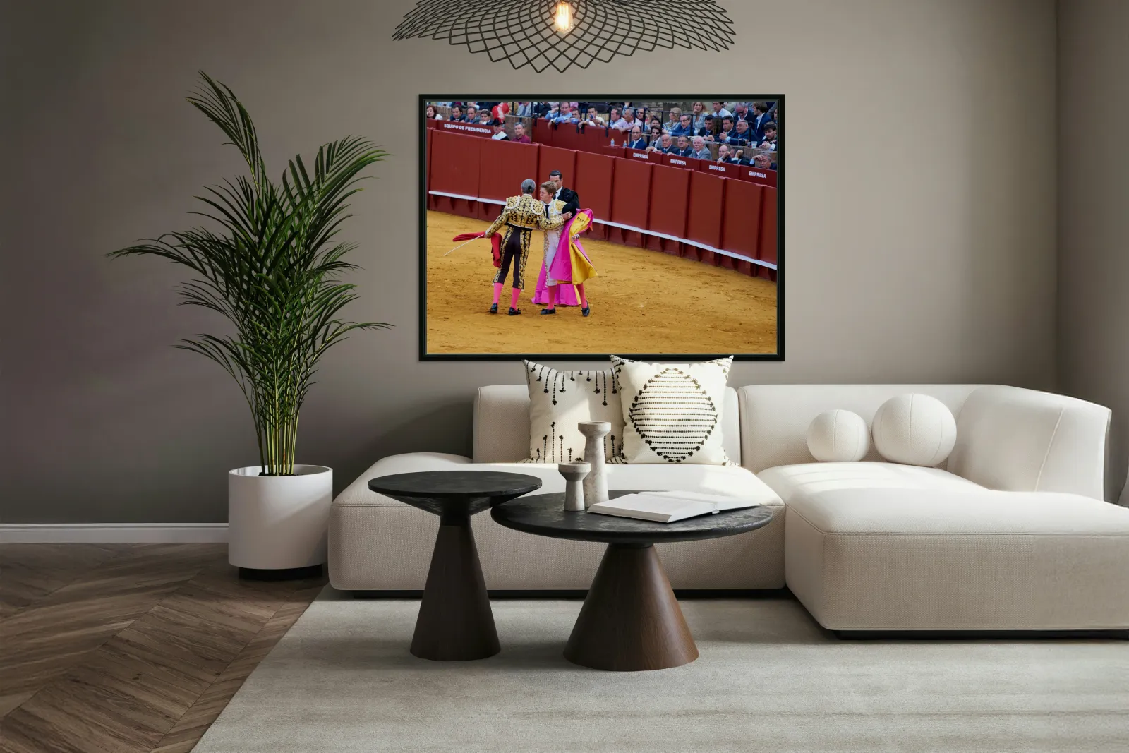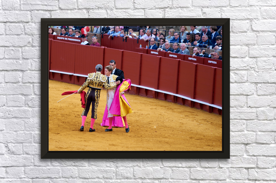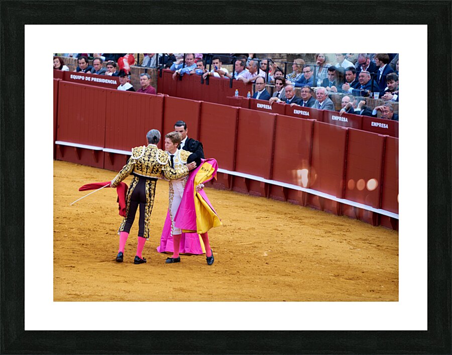 "Bullfight takes place in Seville Arena Andalusia Spain" in a framed print.