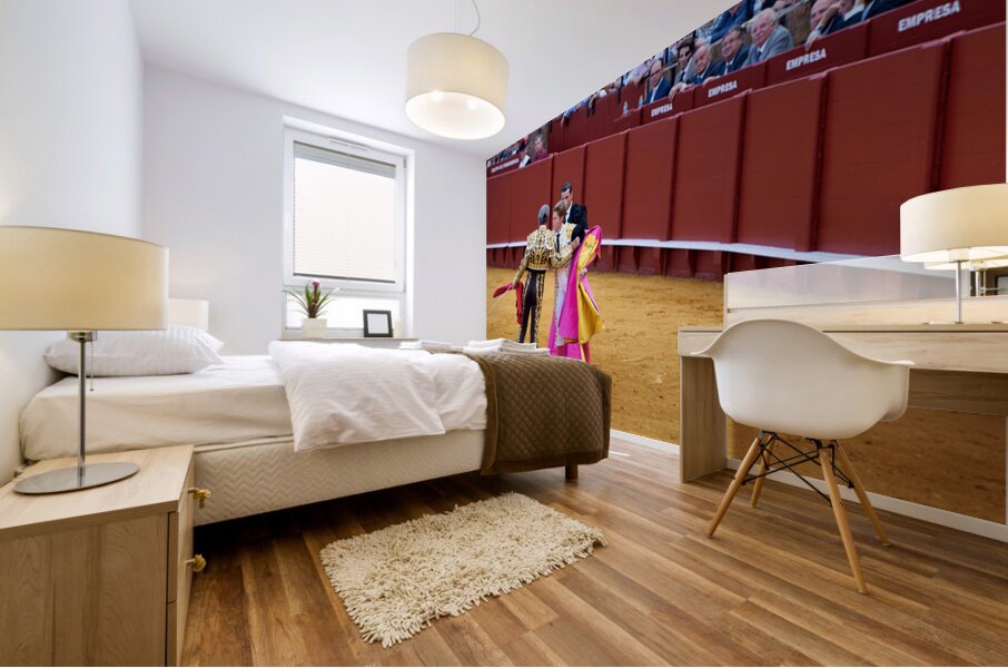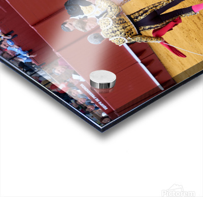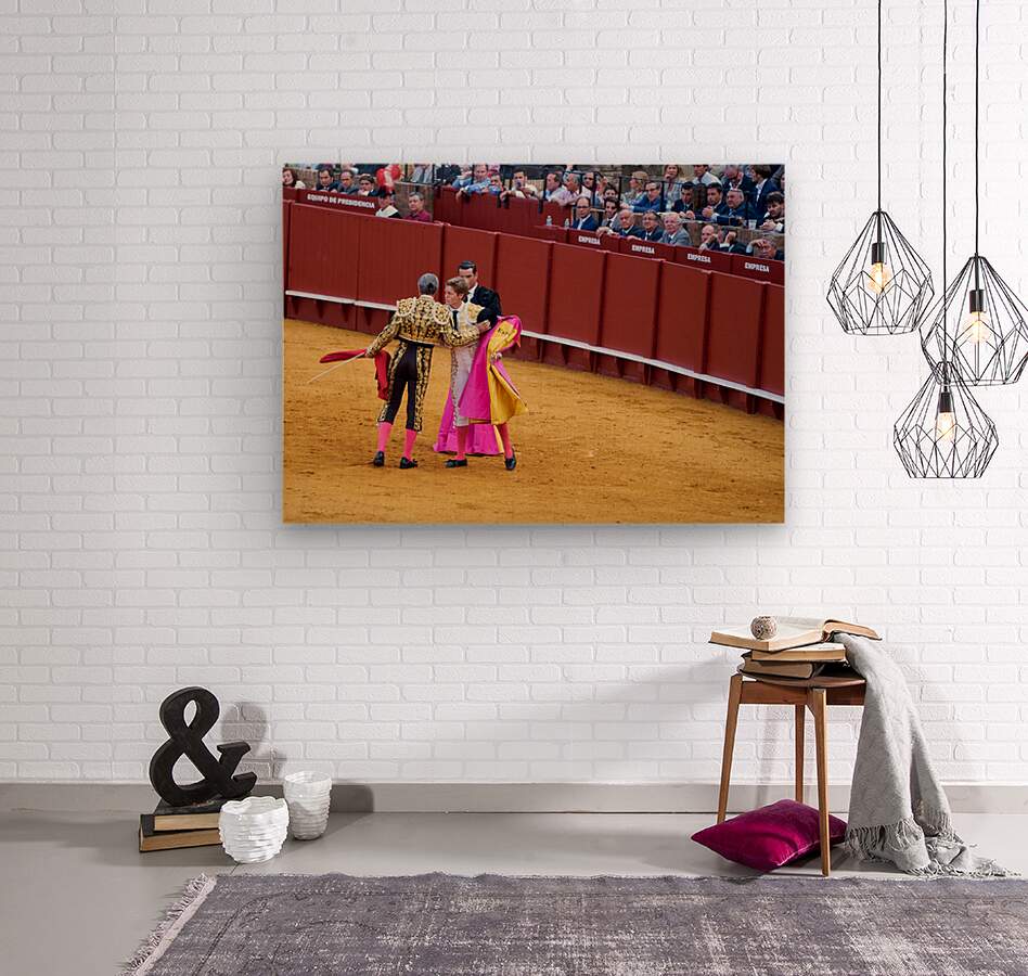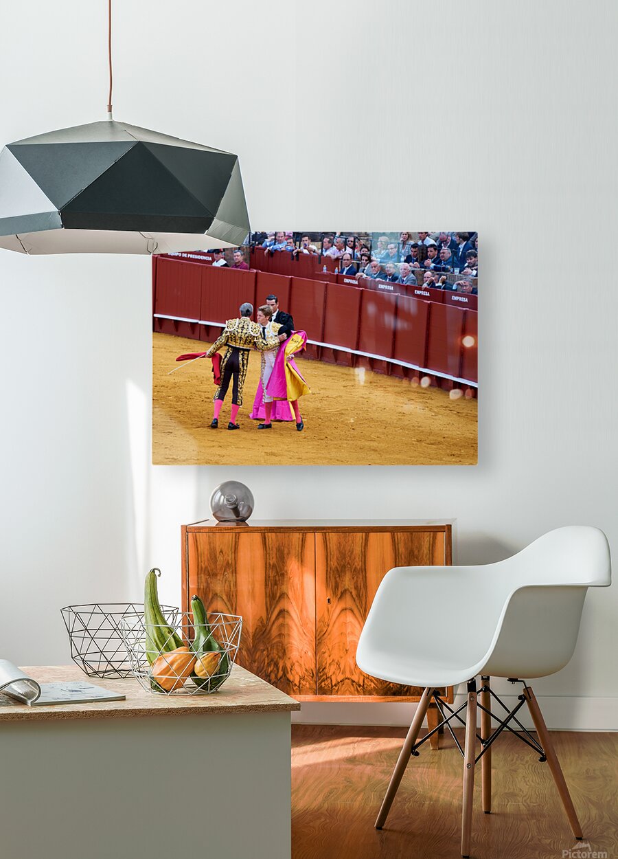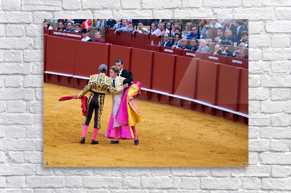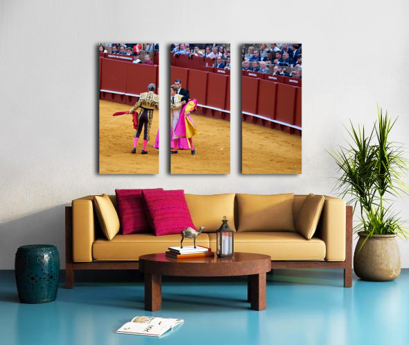 "Bullfight takes place in Seville Arena Andalusia Spain" in a framed print.