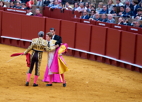 Two bullfighters prepare in the ring while a crowd watches from the stands in Seville. The event shows a vibrant tradition in Andalusia.