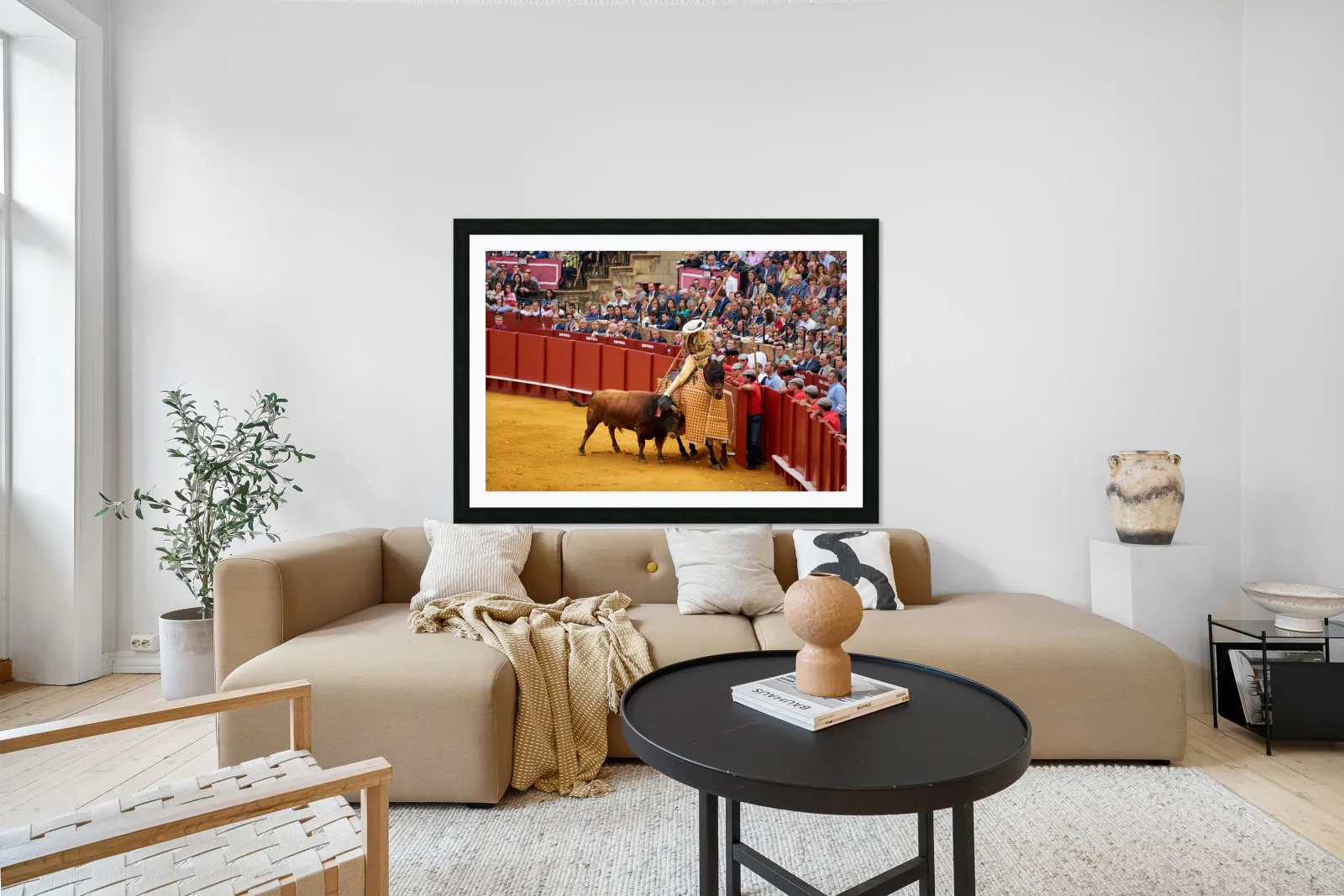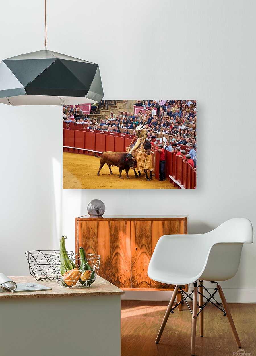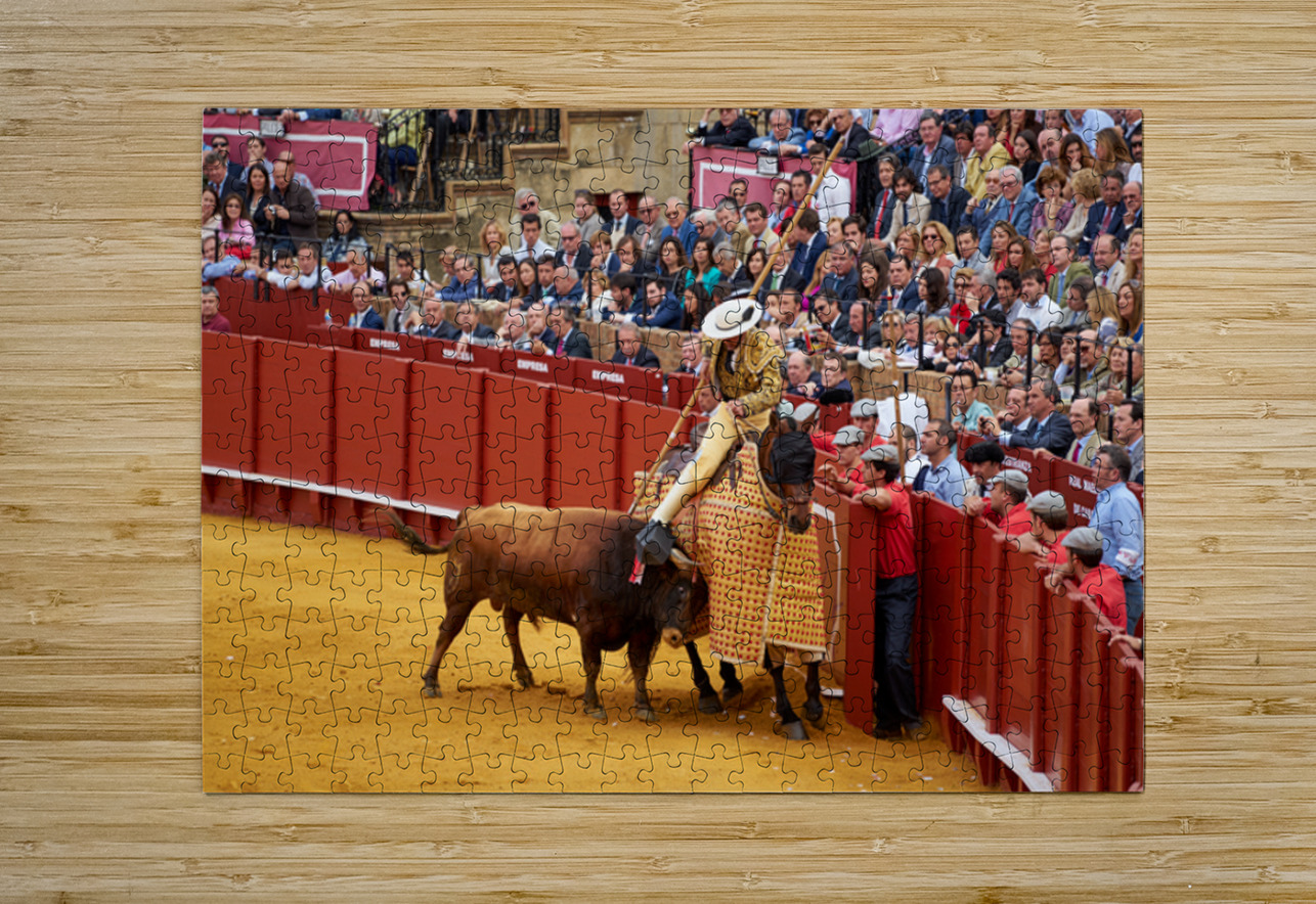 "Bullfight event in Seville Arena takes center stage in Andalucia" in a framed print.