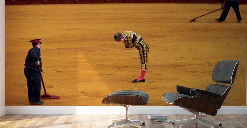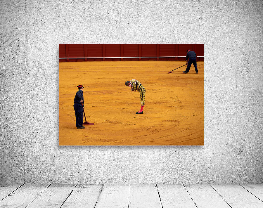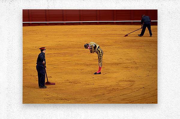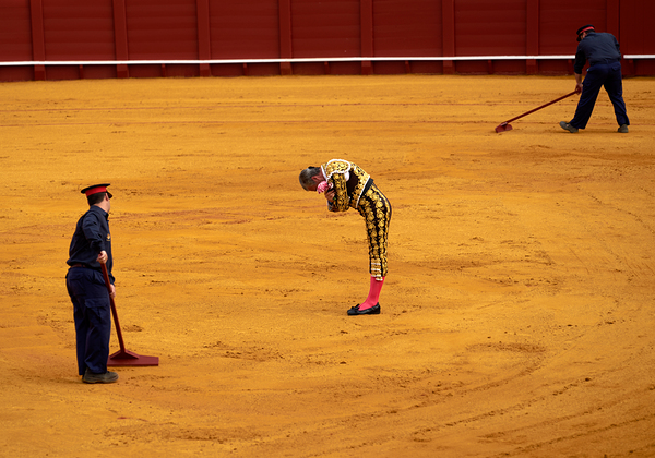 In Seville Arena a bullfighter bows before the crowd while assistants prepare the ring. The event showcases an important cultural tradition.