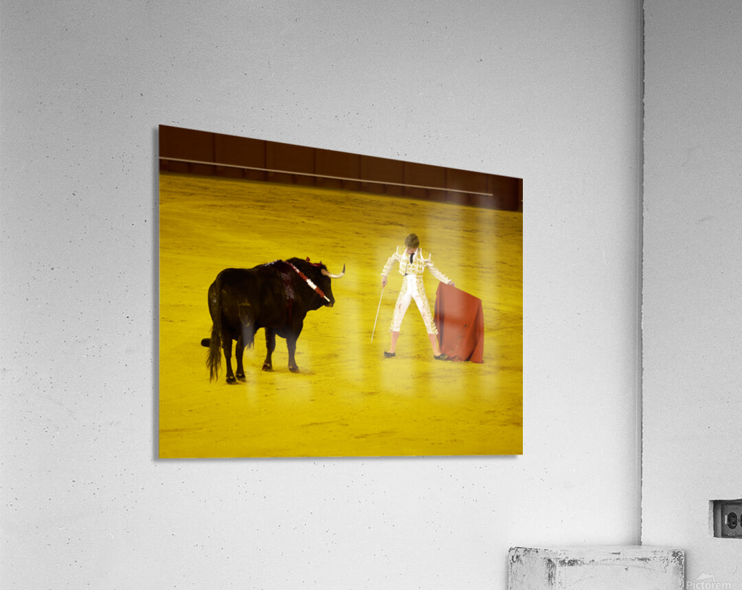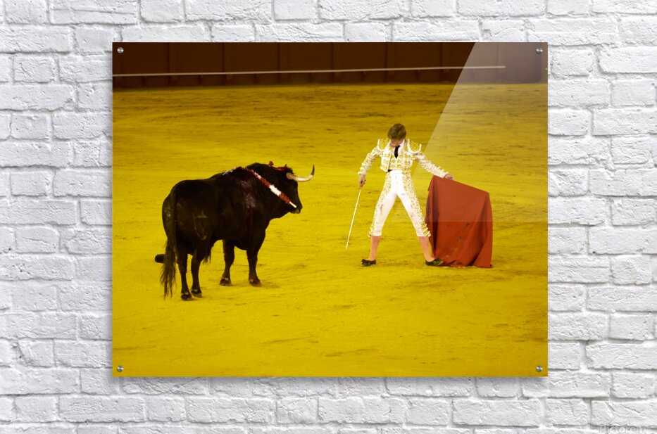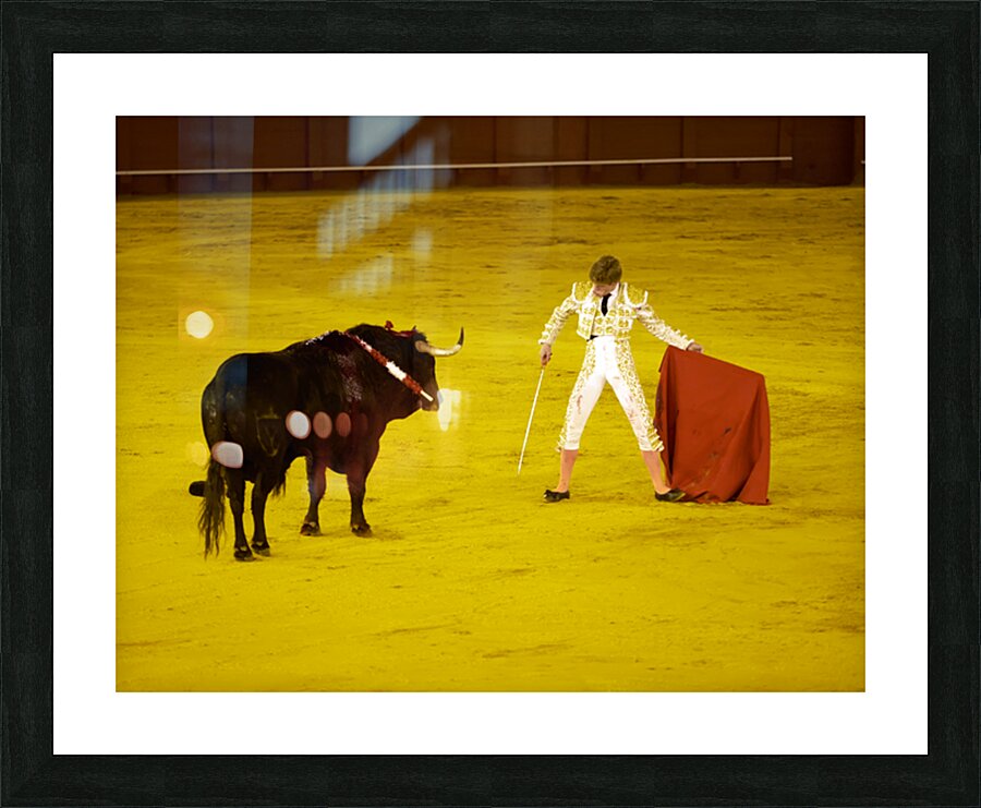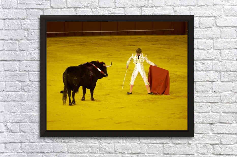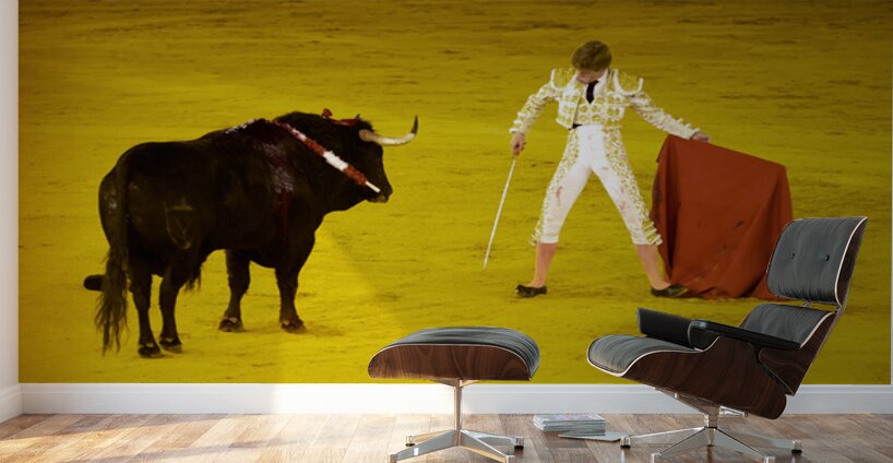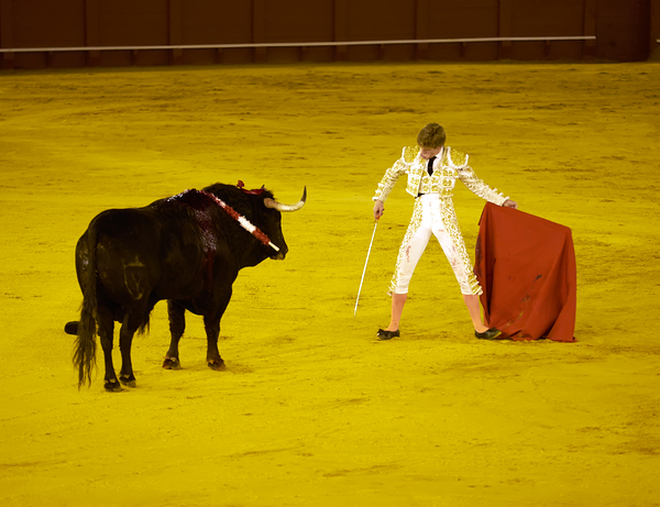 A bullfighter faces a bull in the Seville Arena in Andalusia Spain. Crowd watches eagerly as the event unfolds.