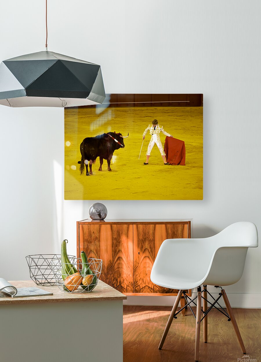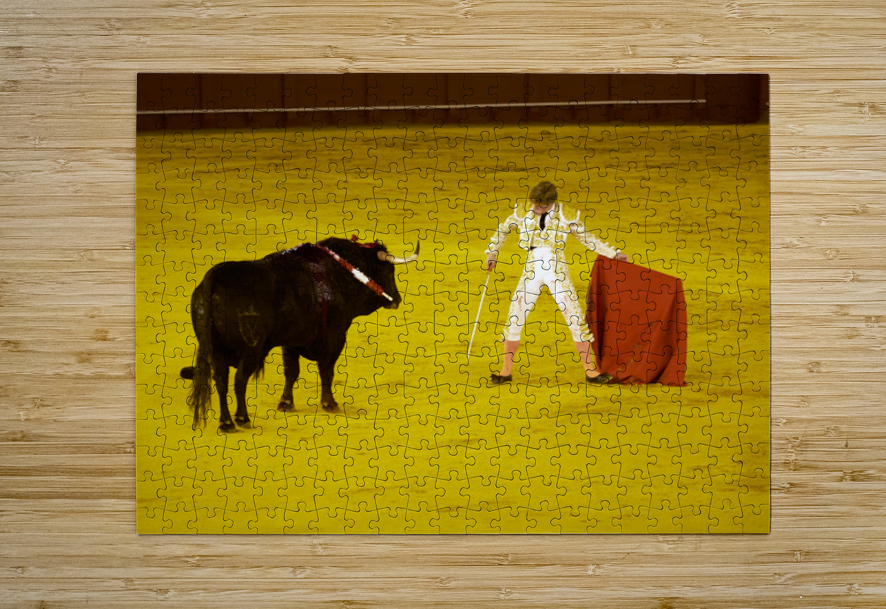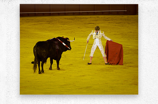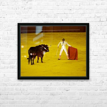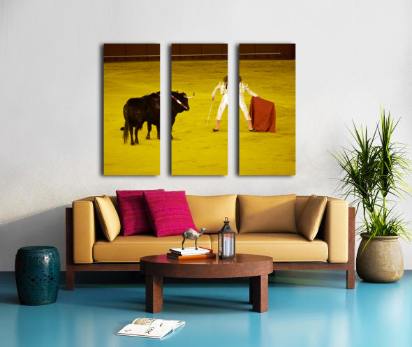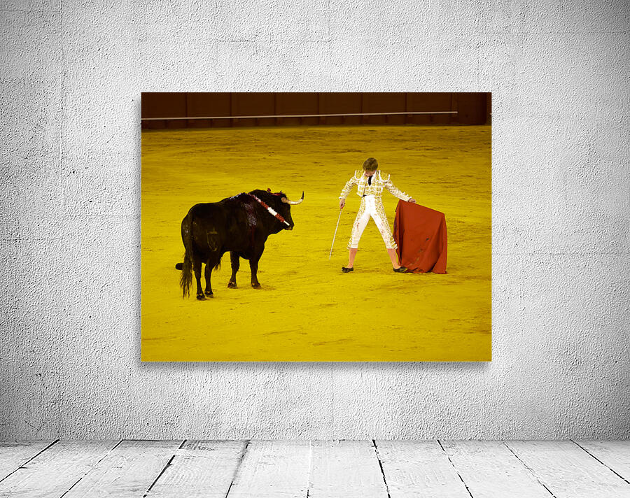 A bullfighter faces a bull in the Seville Arena in Andalusia Spain. Crowd watches eagerly as the event unfolds.