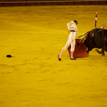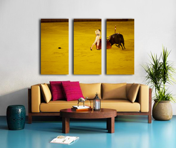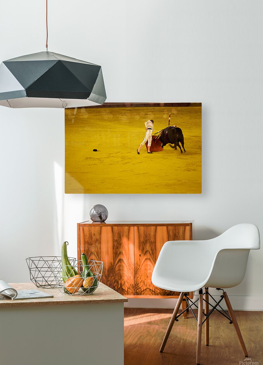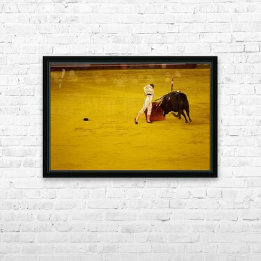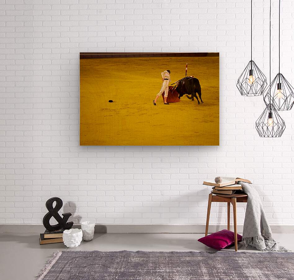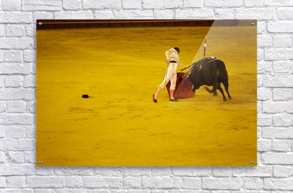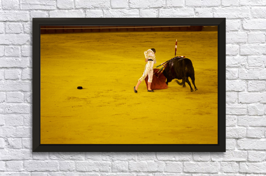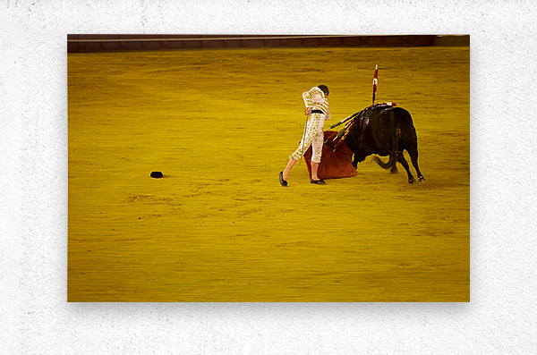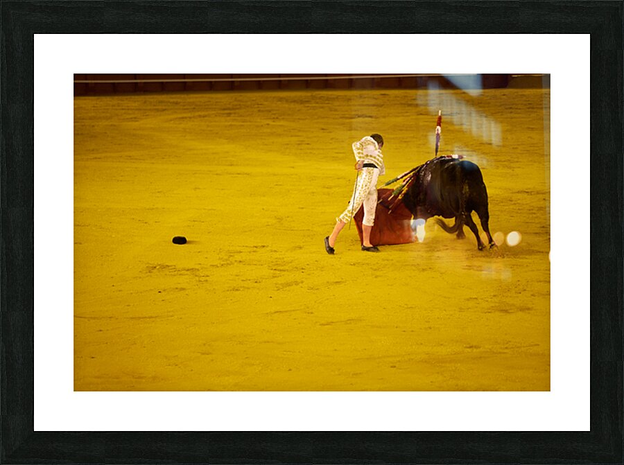 A bullfighter engages with a bull in the Seville Arena in Andalusia Spain during a bullfighting event.