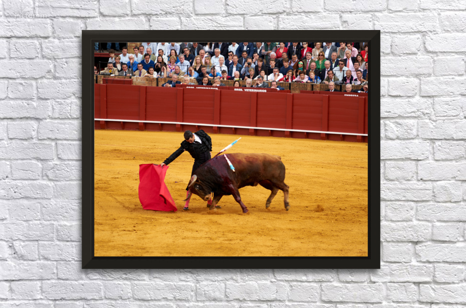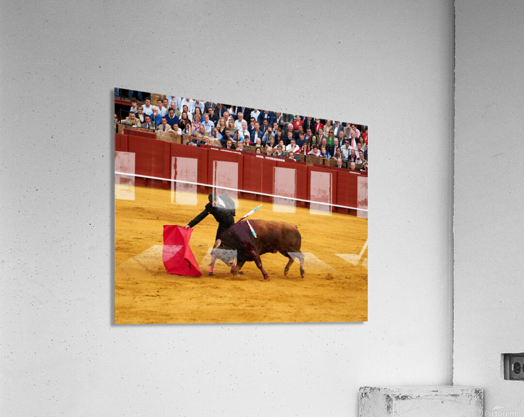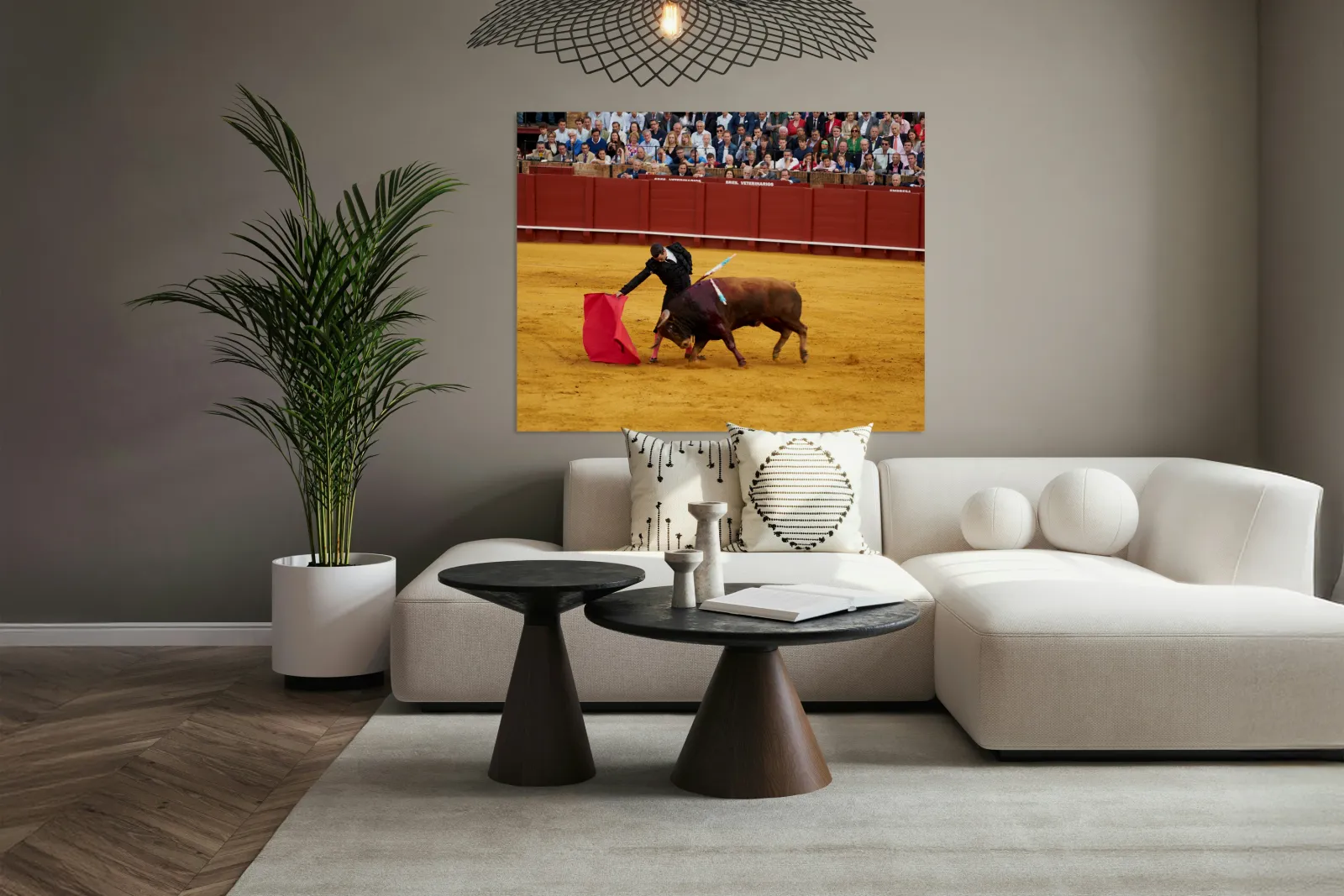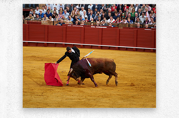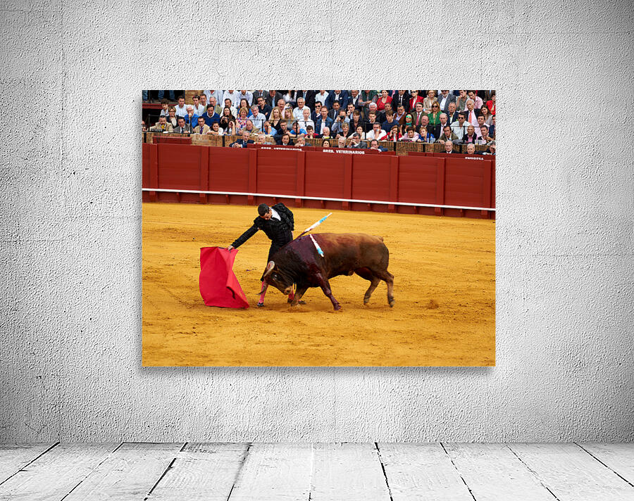 A bullfighter engages with a bull in the ring of Seville Arena in Andalusia capturing the crowds attention during the event.