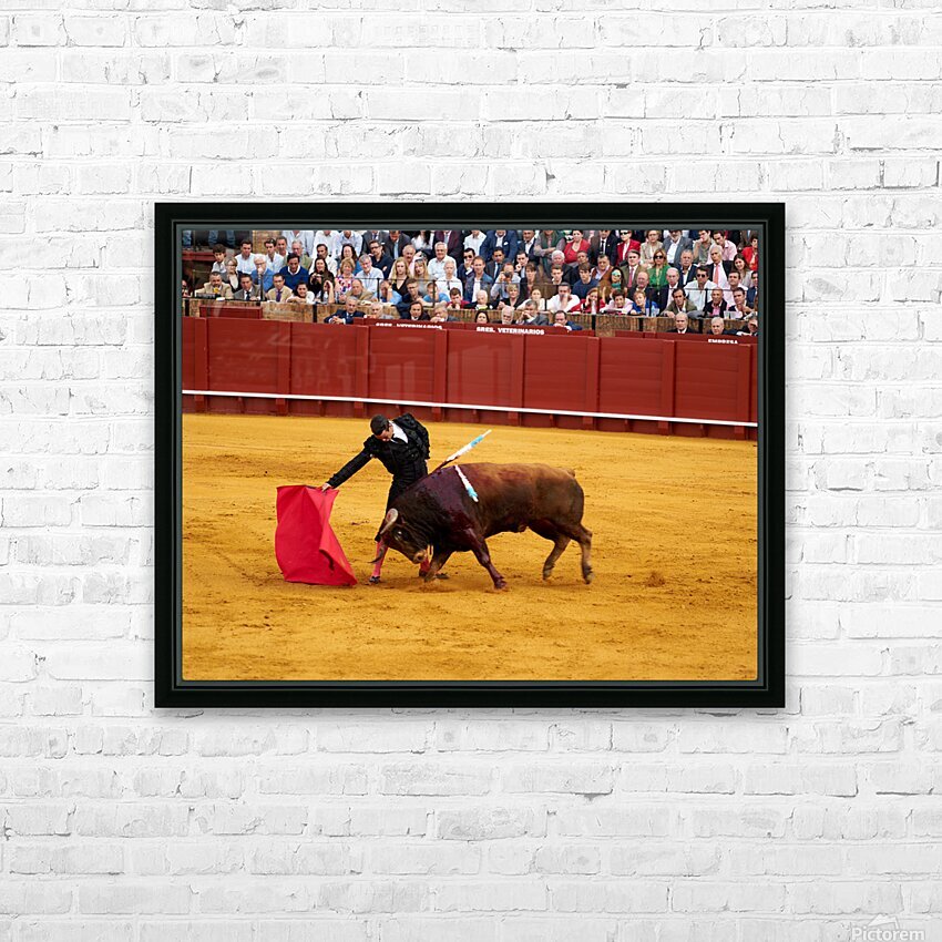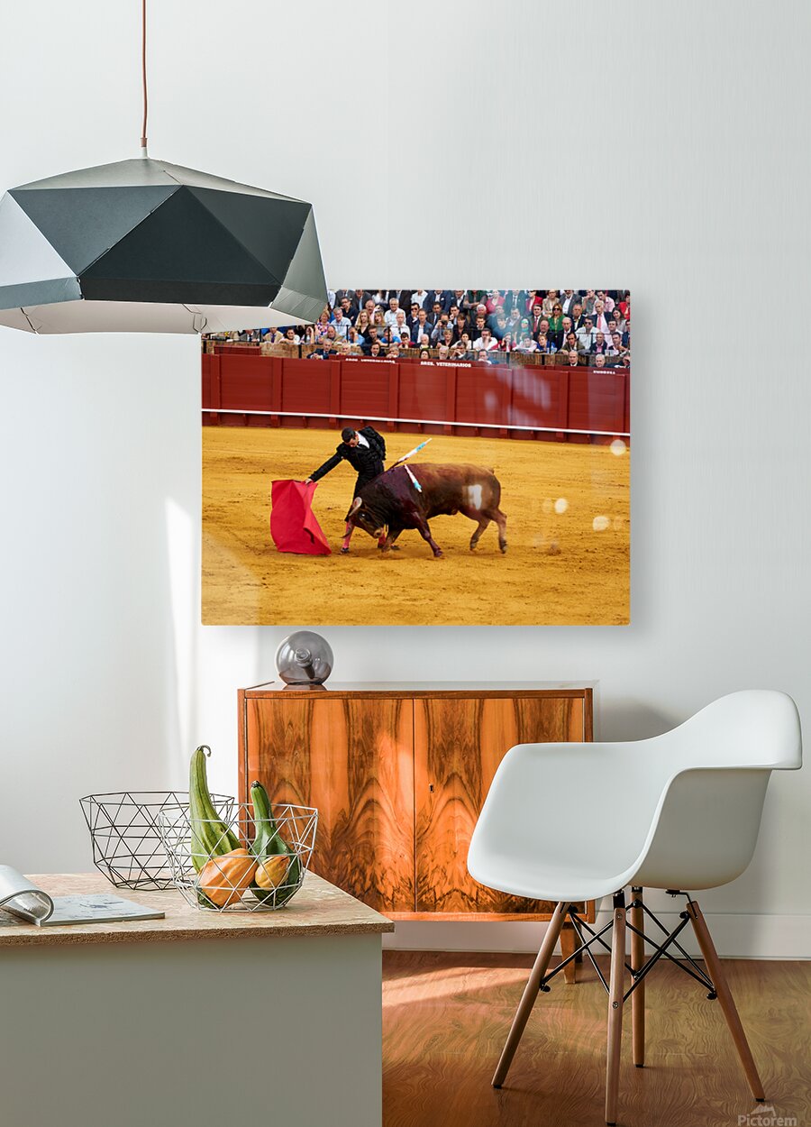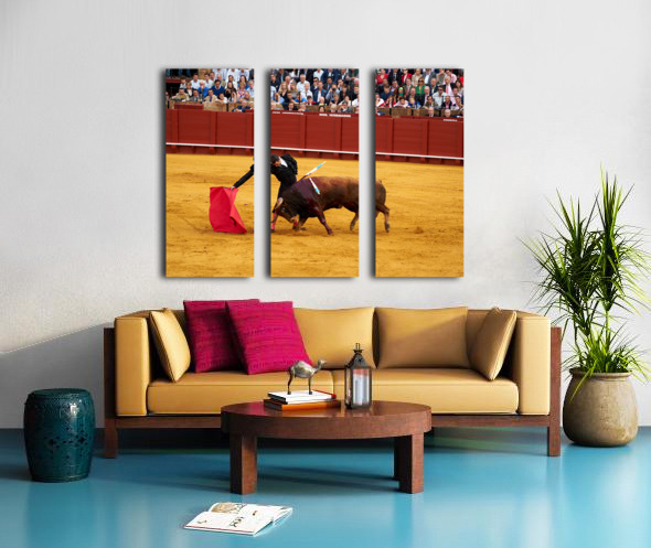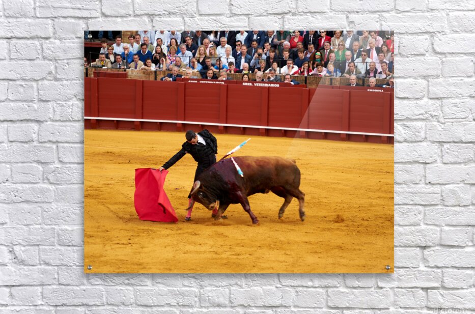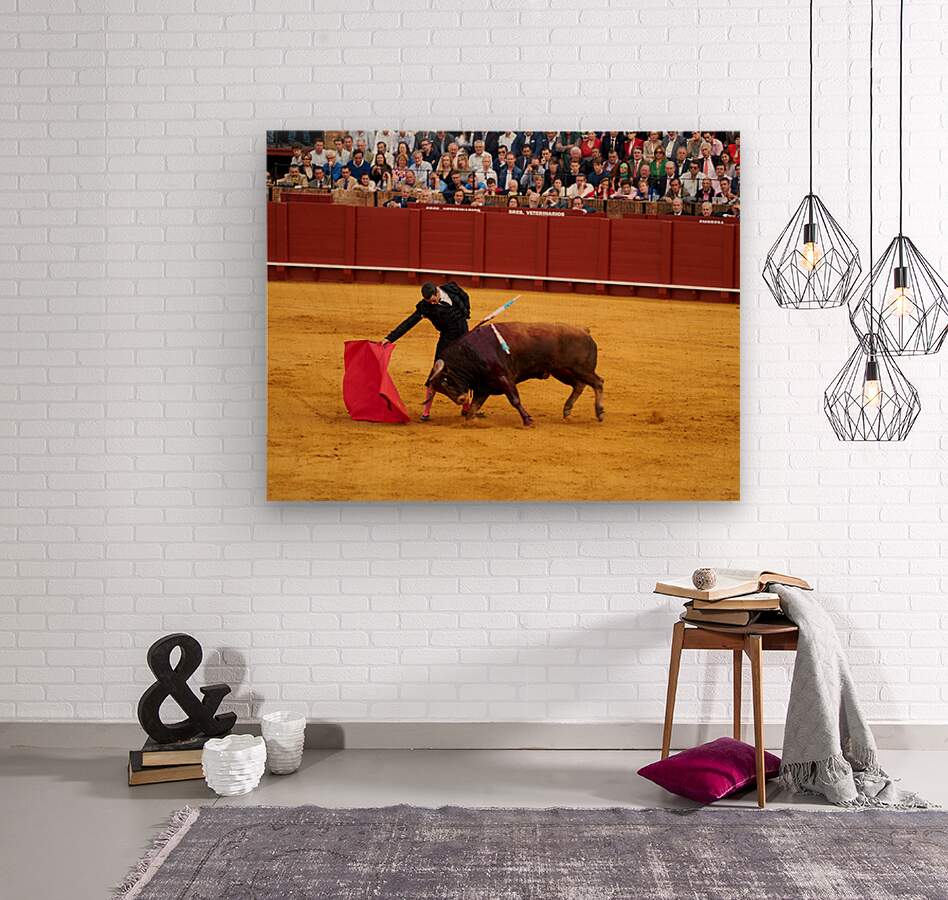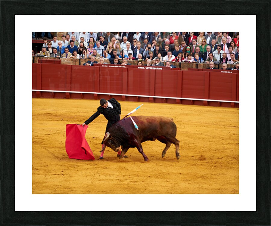 A bullfighter engages with a bull in the ring of Seville Arena in Andalusia capturing the crowds attention during the event.