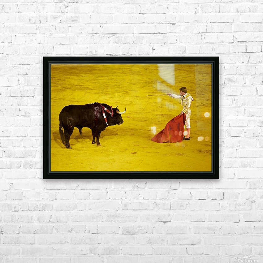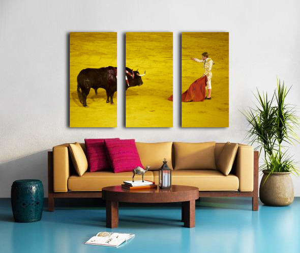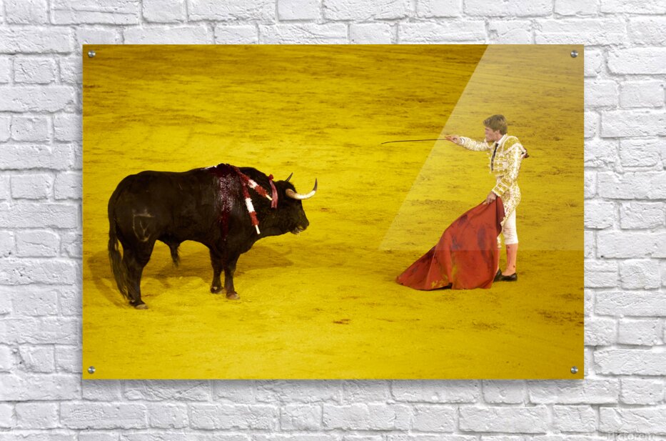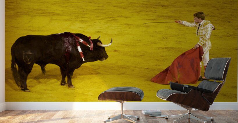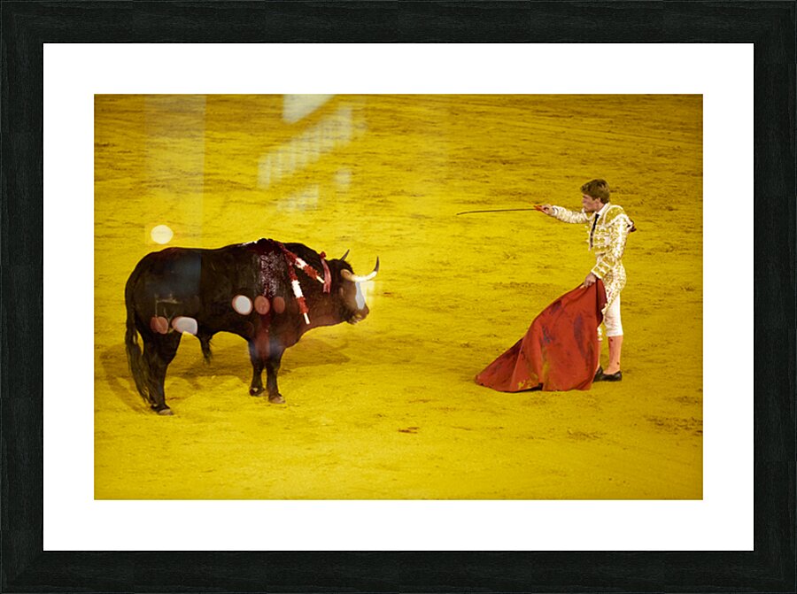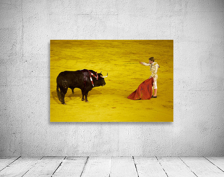 A bullfighter stands in the arena facing a bull in Seville Spain. The bullfight occurs in a lively setting under bright lights.