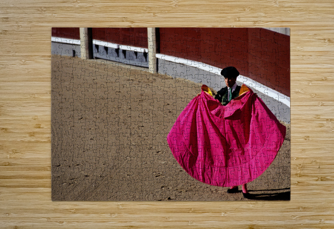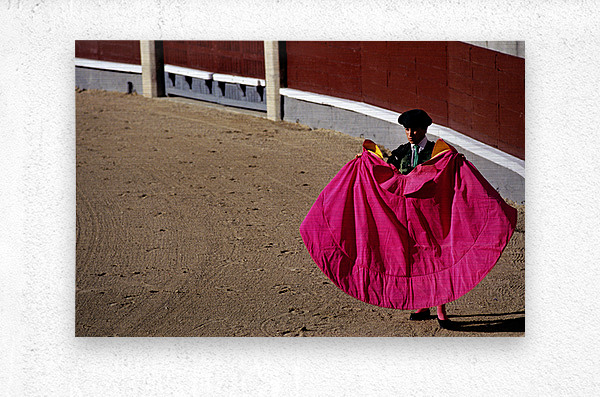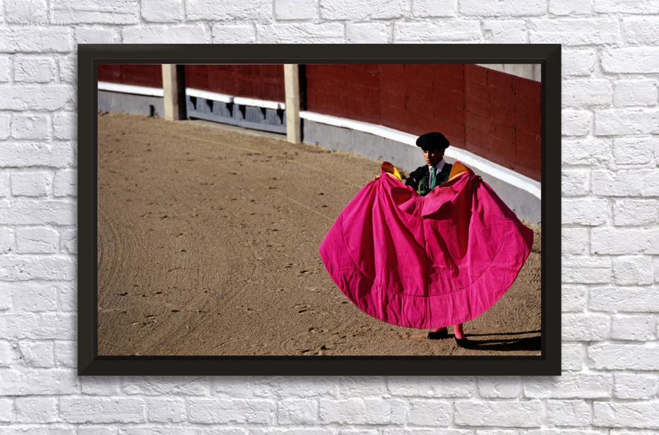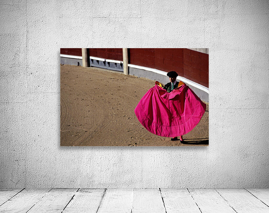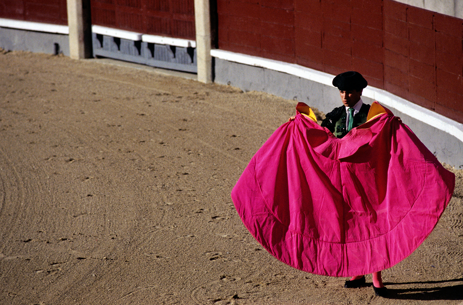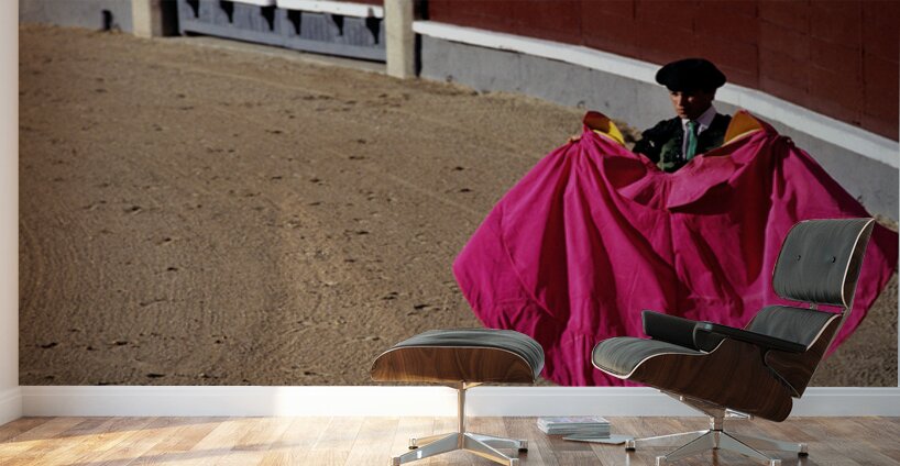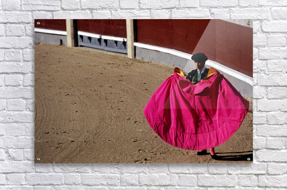 A bullfighter stands in the ring holding a pink cape ready for the corrida de rejones event. Spectators fill the stands in Madrid.