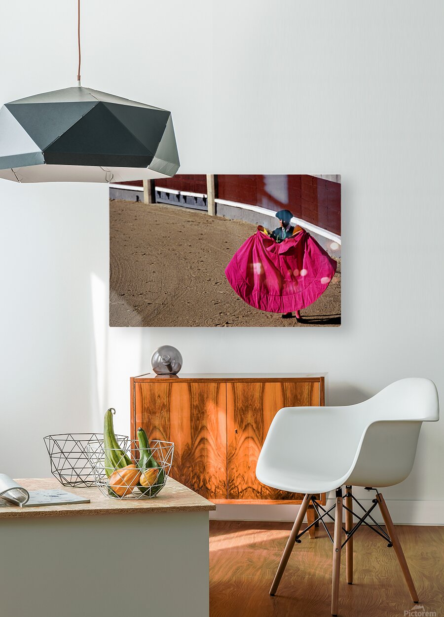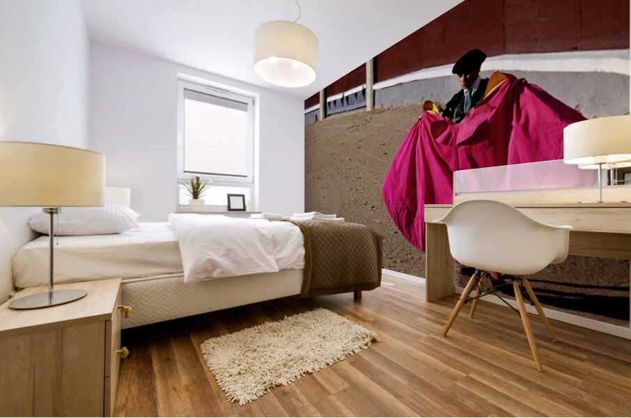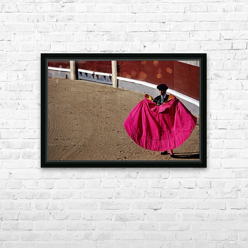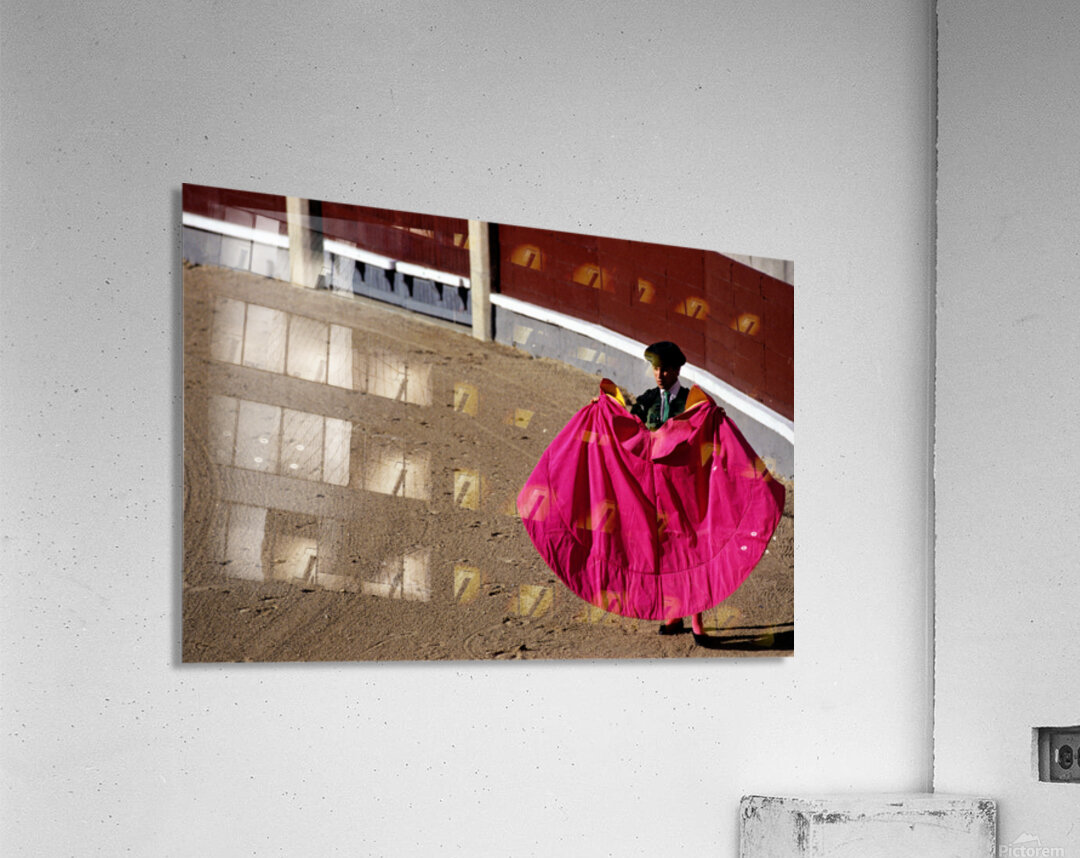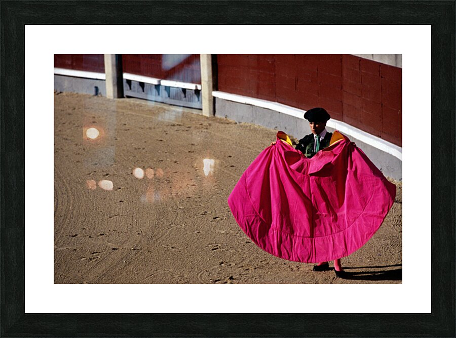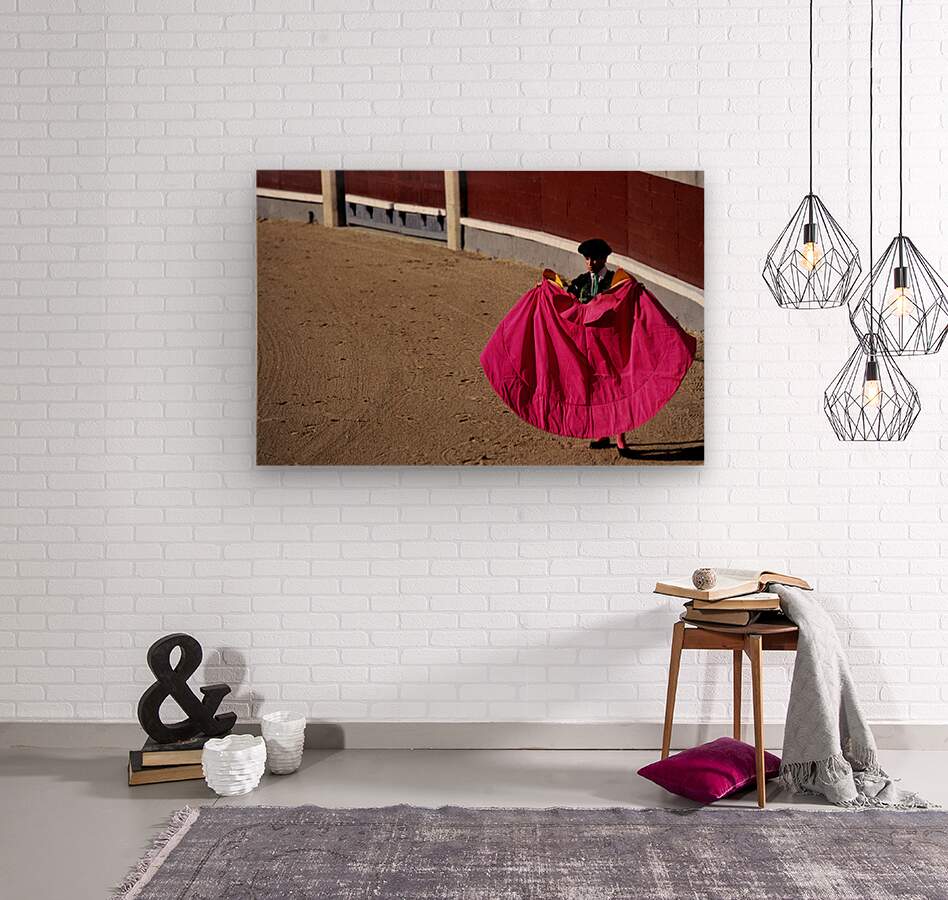 A bullfighter stands in the ring holding a pink cape ready for the corrida de rejones event. Spectators fill the stands in Madrid.