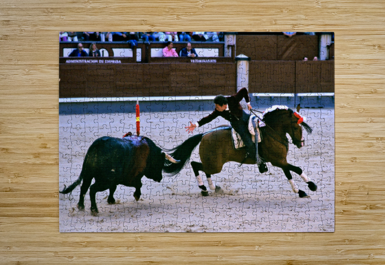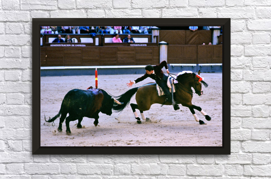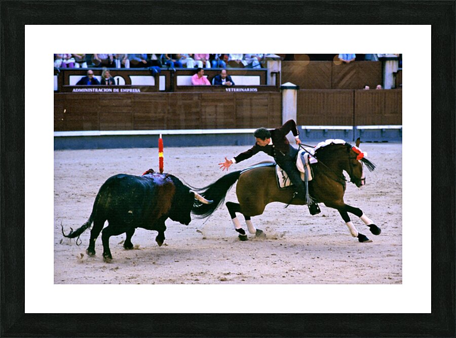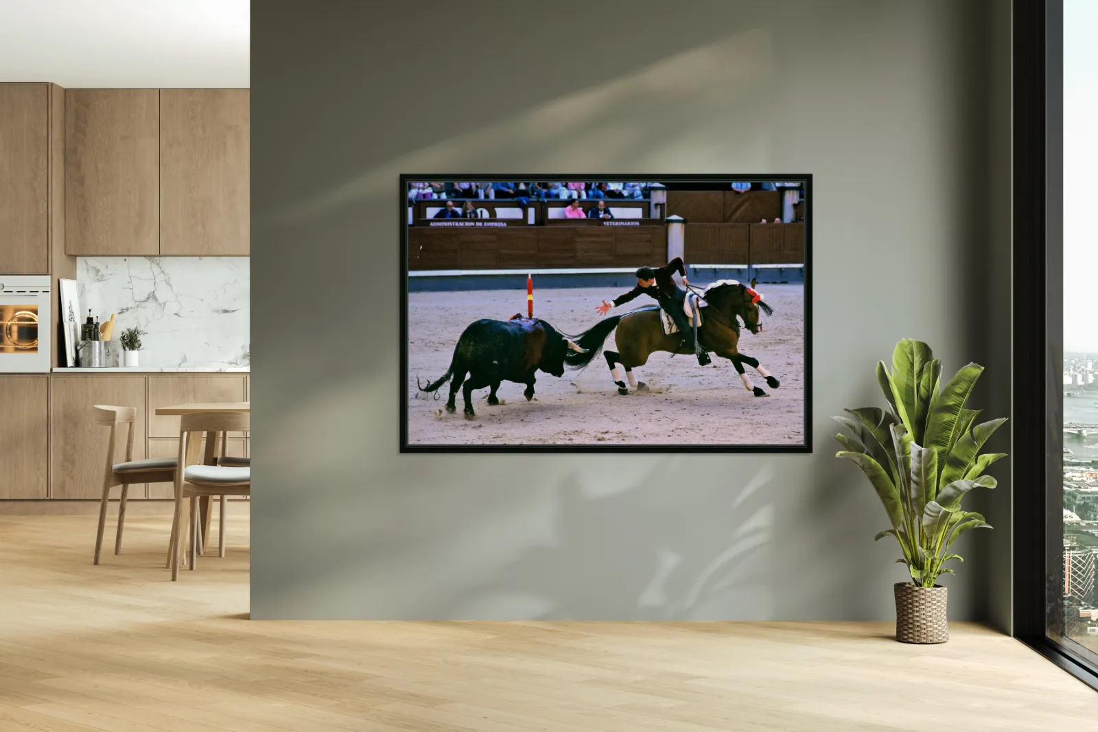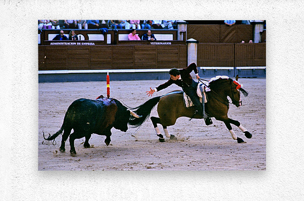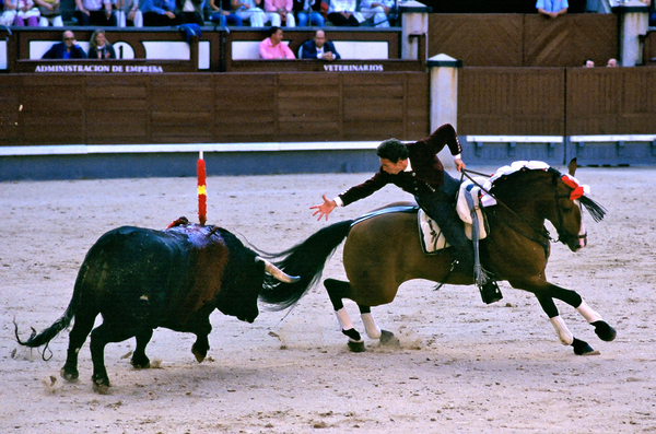A bullfighter on horseback is engaged in a traditional corrida de rejones at Las Ventas in Madrid. The event showcases skill and bravery.
