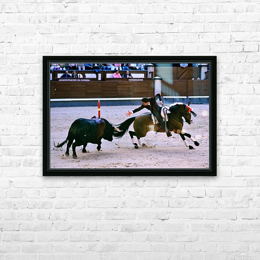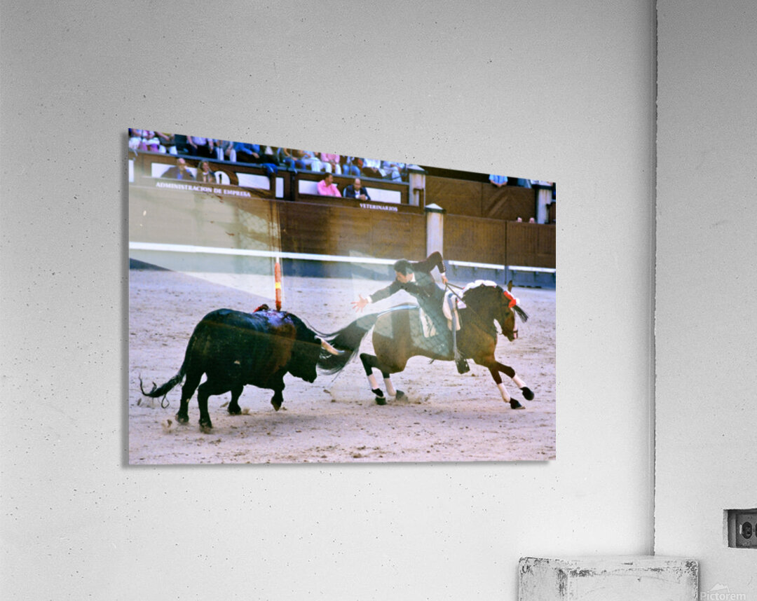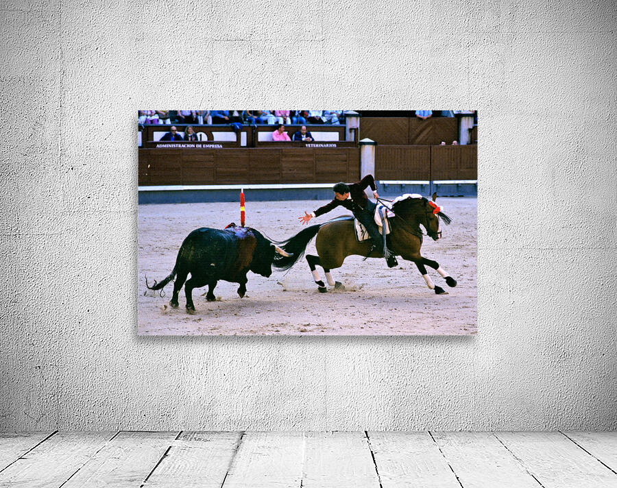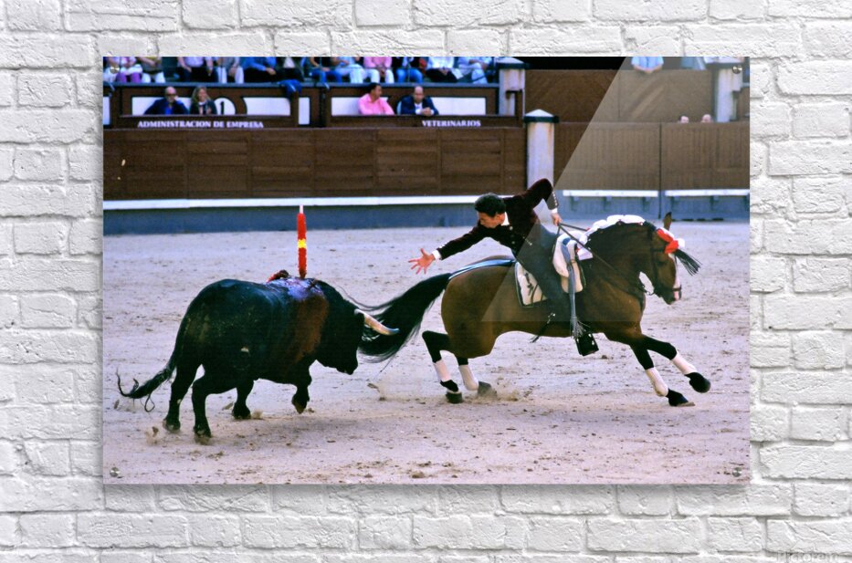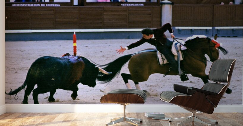 A bullfighter on horseback is engaged in a traditional corrida de rejones at Las Ventas in Madrid. The event showcases skill and bravery.