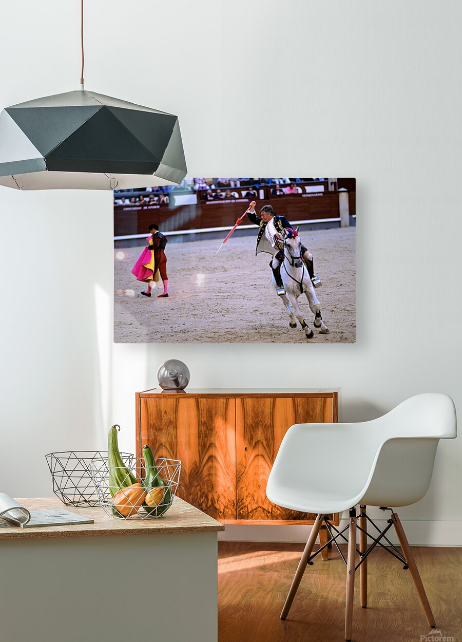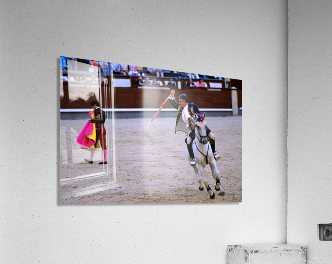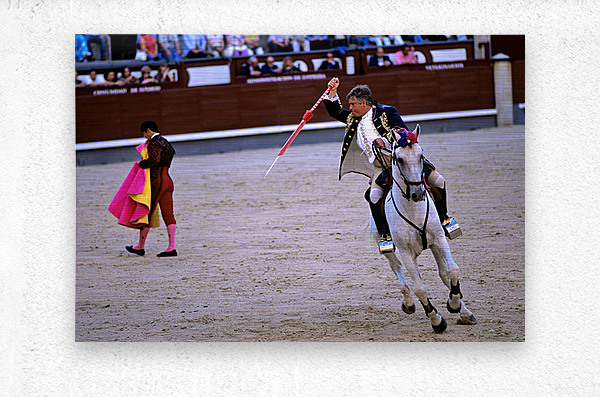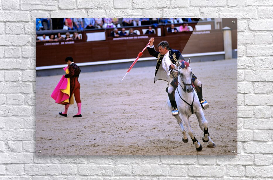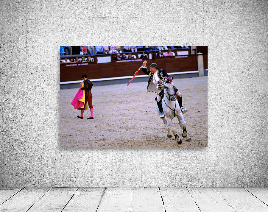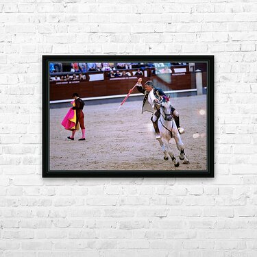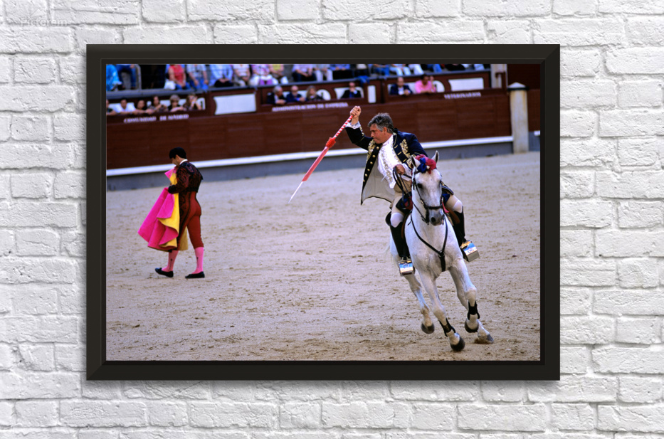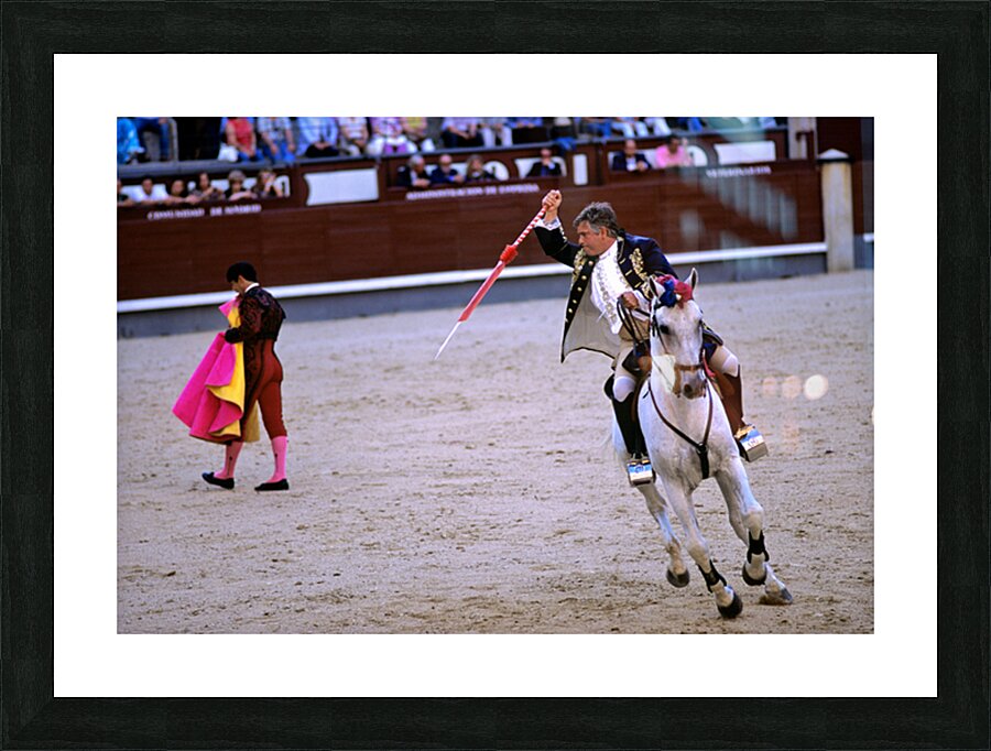 "Bullfight event in Madrid Spain with horse and matador" in a framed print.