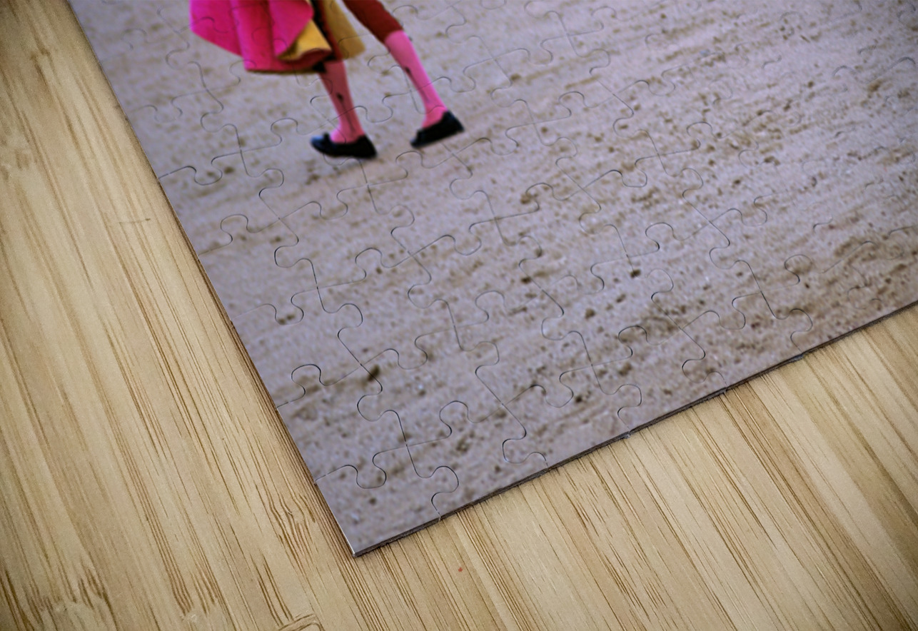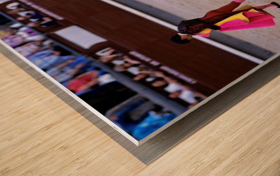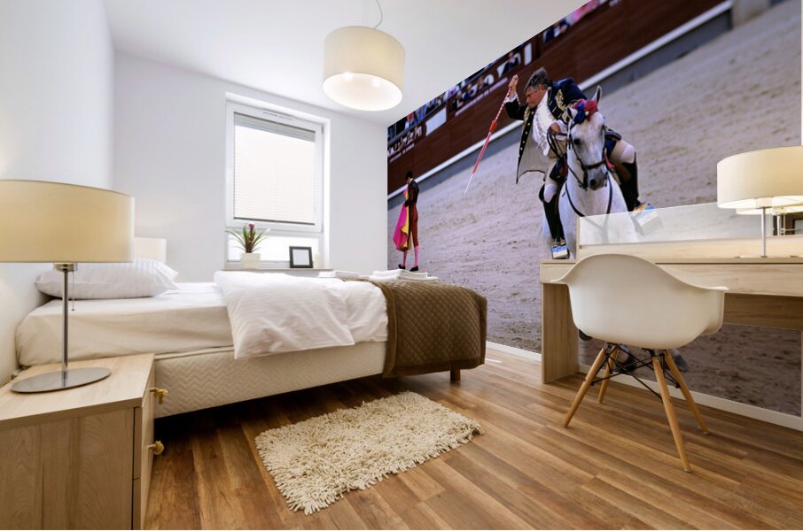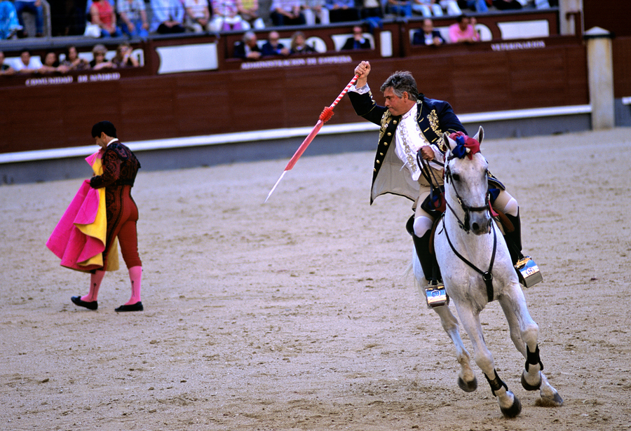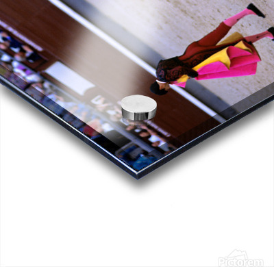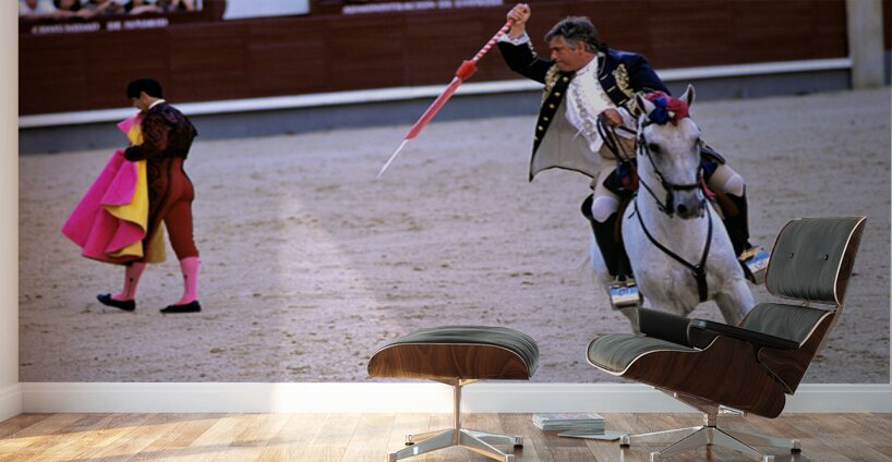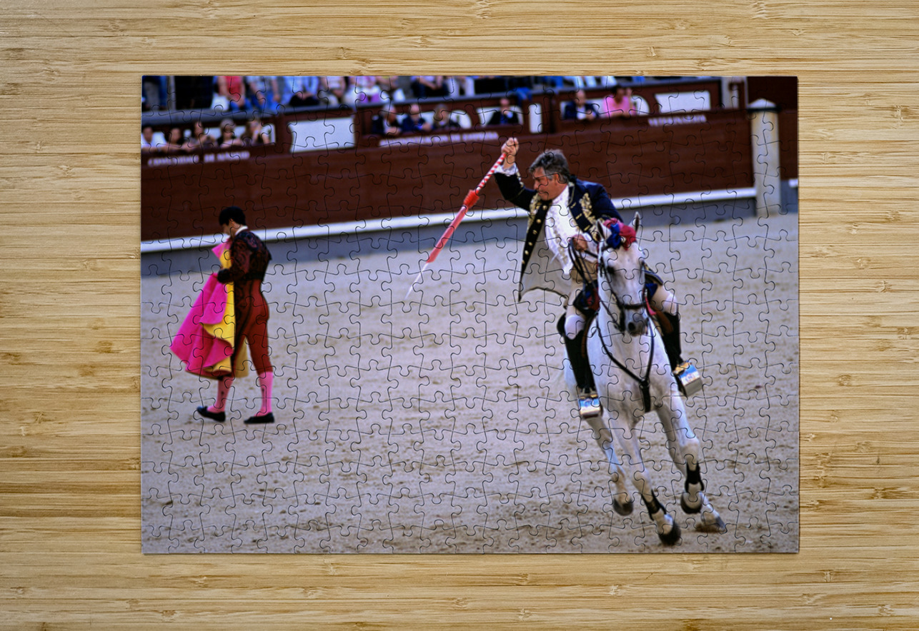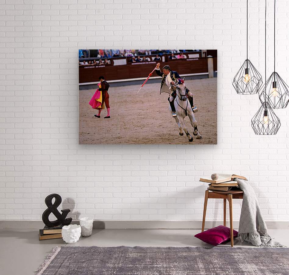 "Bullfight event in Madrid Spain with horse and matador" in a framed print.