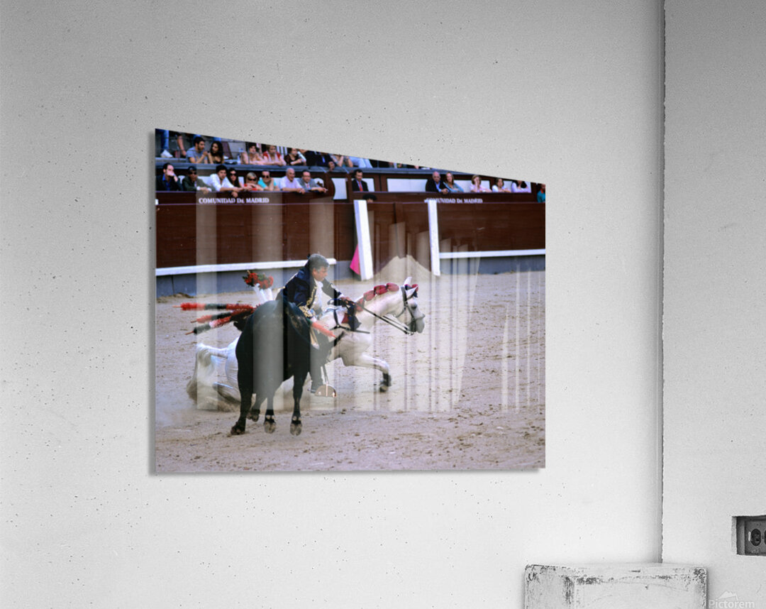 A bullfighter on horseback performs in a bullring in Madrid. The crowd watches as the action unfolds in the arena.
