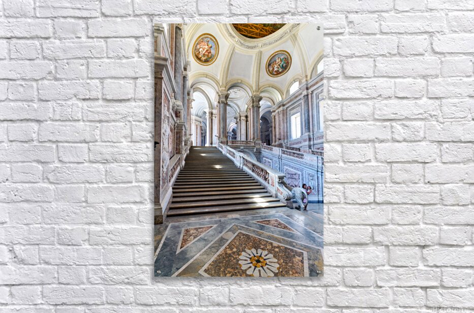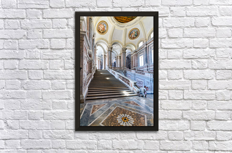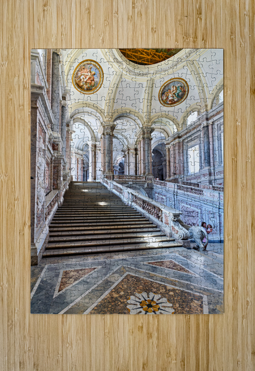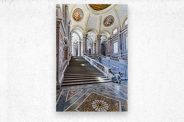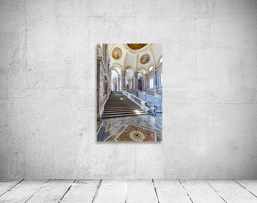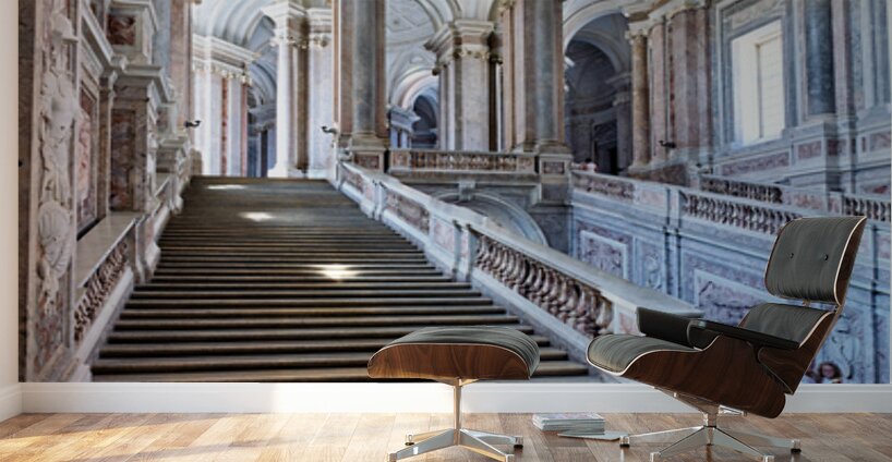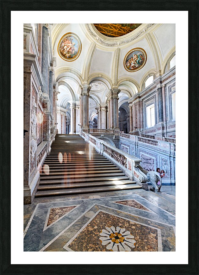 Visitors walk up the grand staircase designed by Luigi Vanvitelli in the Royal Palace of Caserta. The architecture shows historical details.
