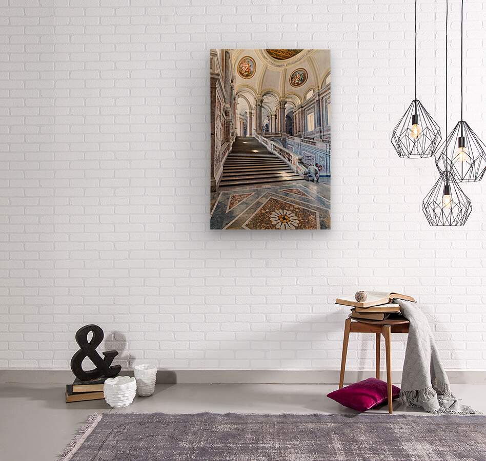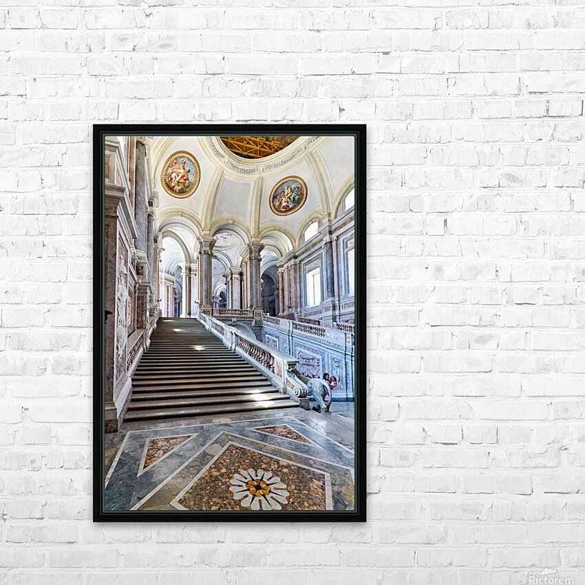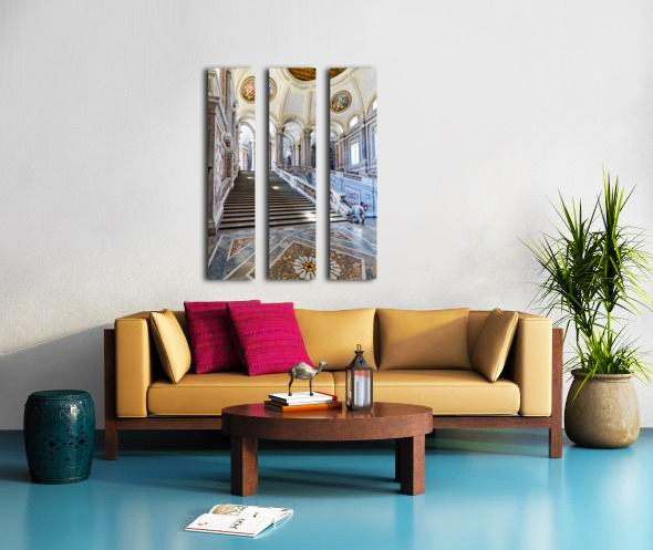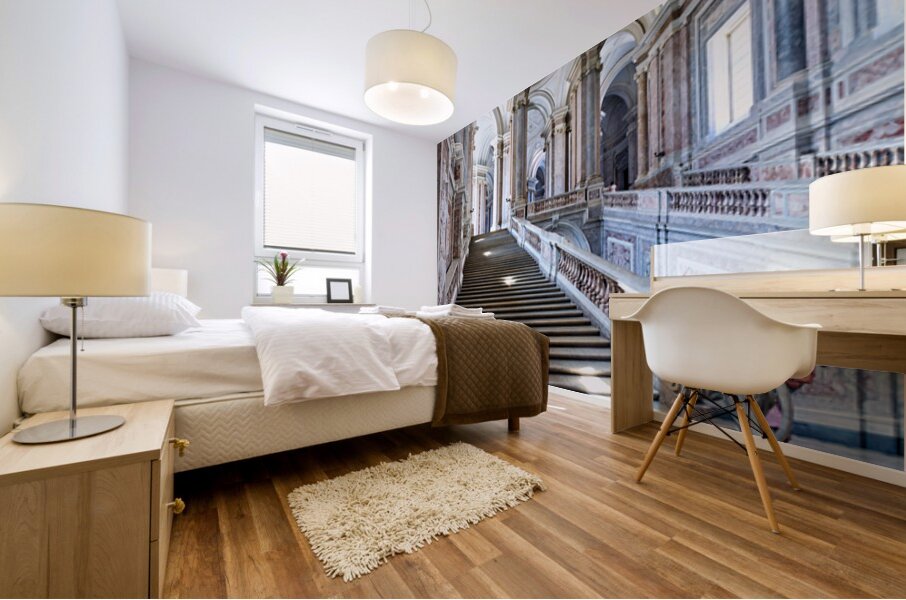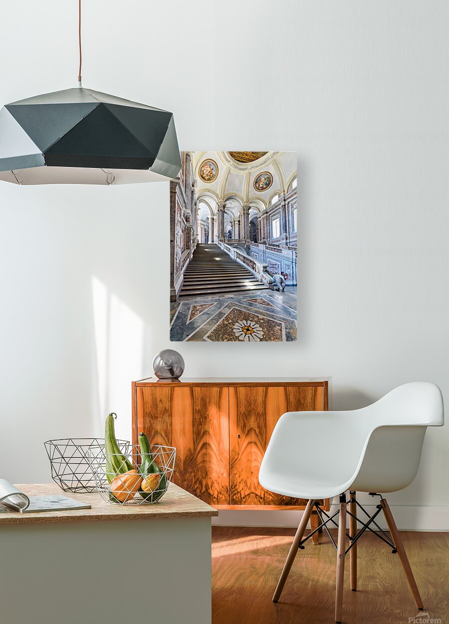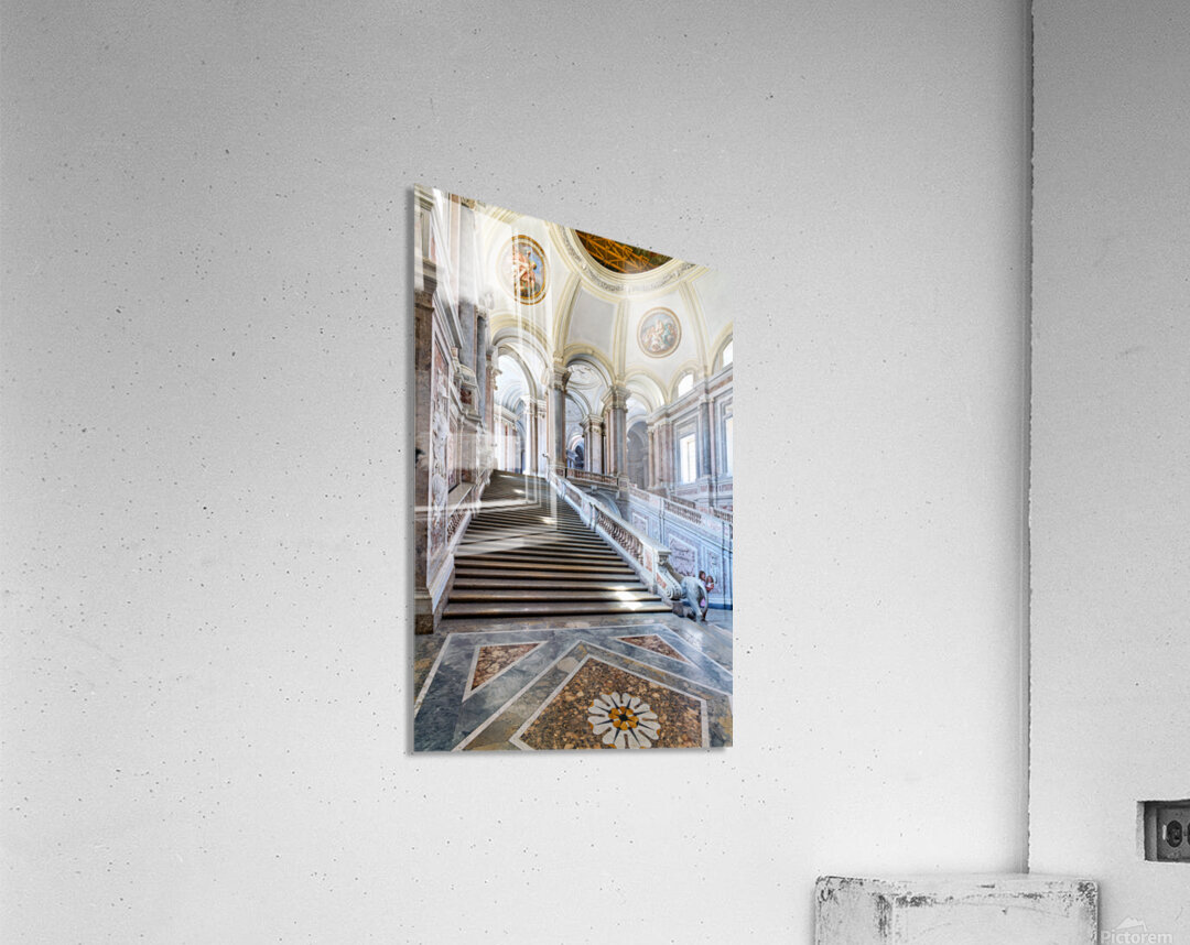 Visitors walk up the grand staircase designed by Luigi Vanvitelli in the Royal Palace of Caserta. The architecture shows historical details.