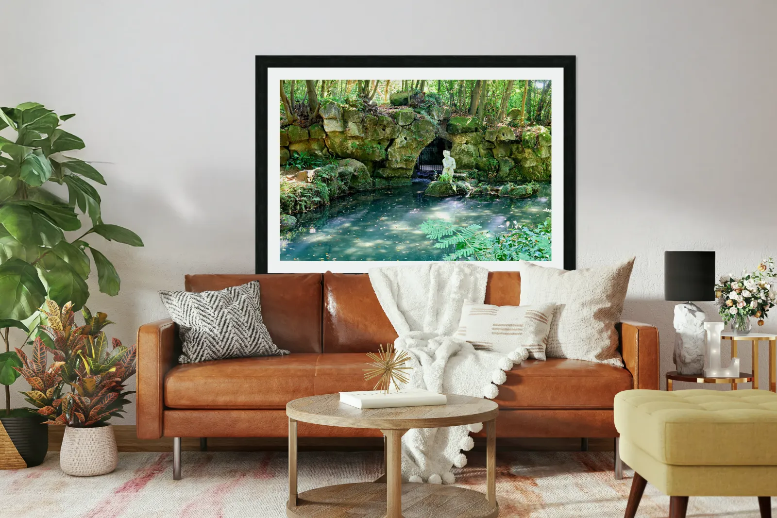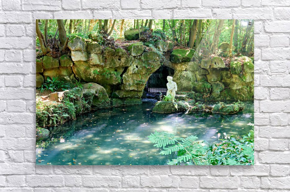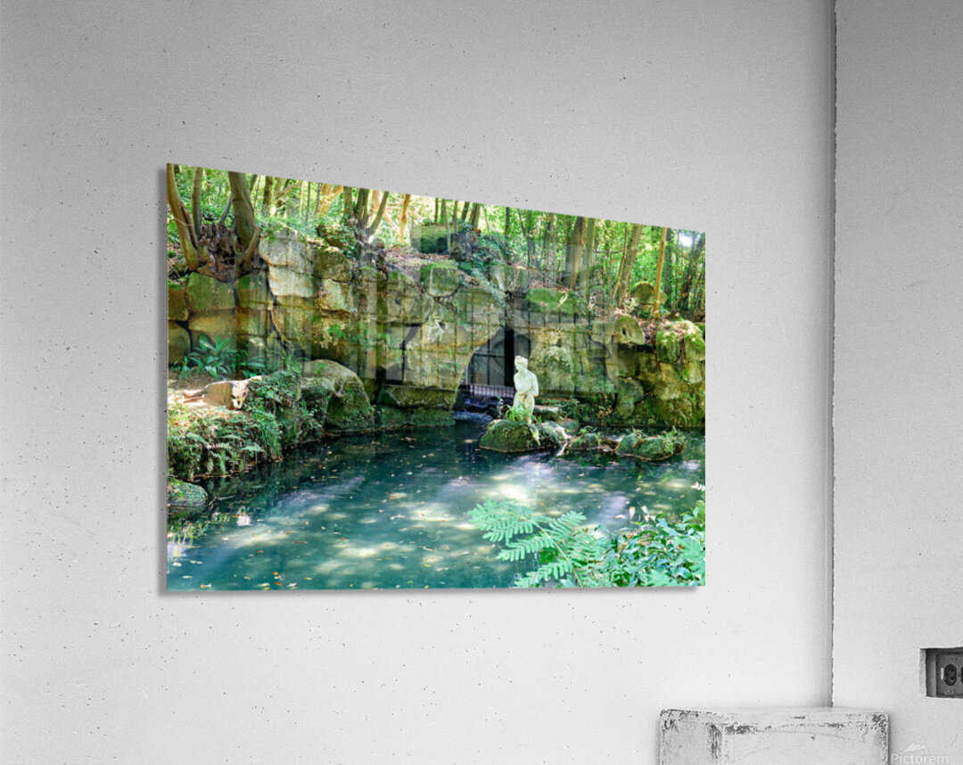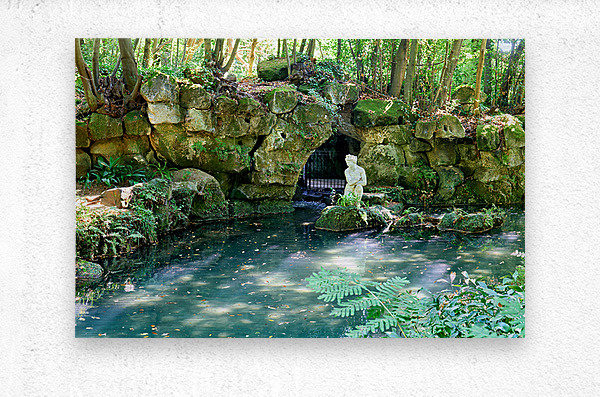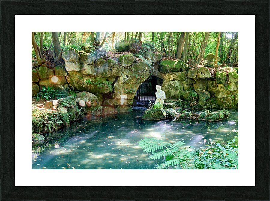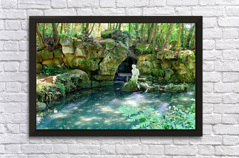 Water flows quietly in the bath of Venus surrounded by green trees in the Royal Palace of Caserta. A statue sits by the water.