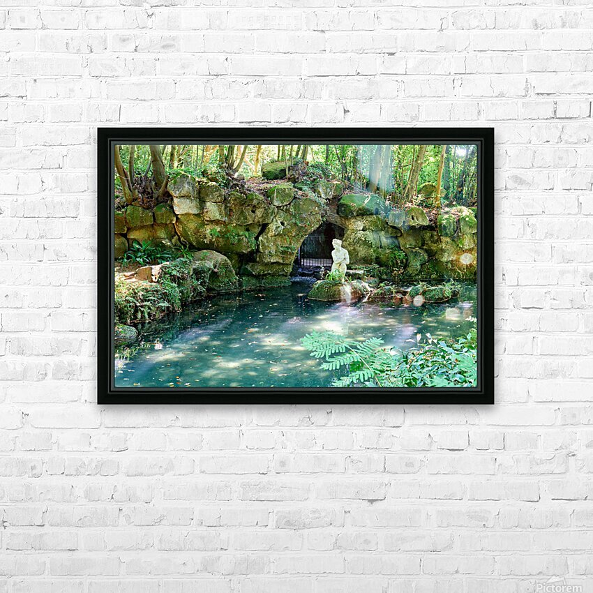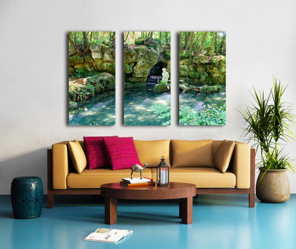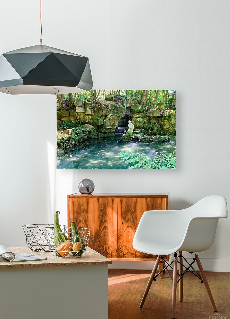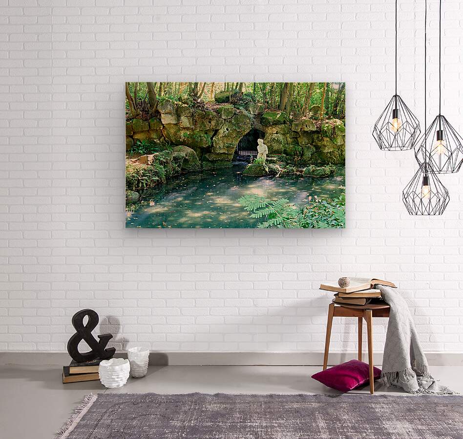 Water flows quietly in the bath of Venus surrounded by green trees in the Royal Palace of Caserta. A statue sits by the water.
