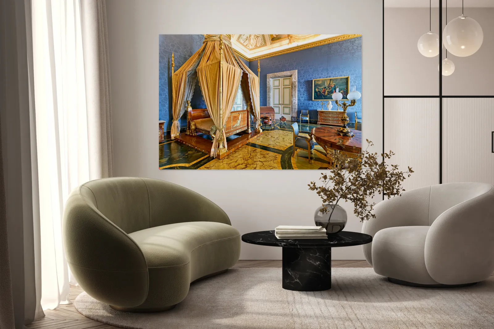 Explore the bedroom of King Francis II in the Royal Palace of Caserta. This room features ornate furniture and historical decorations.
