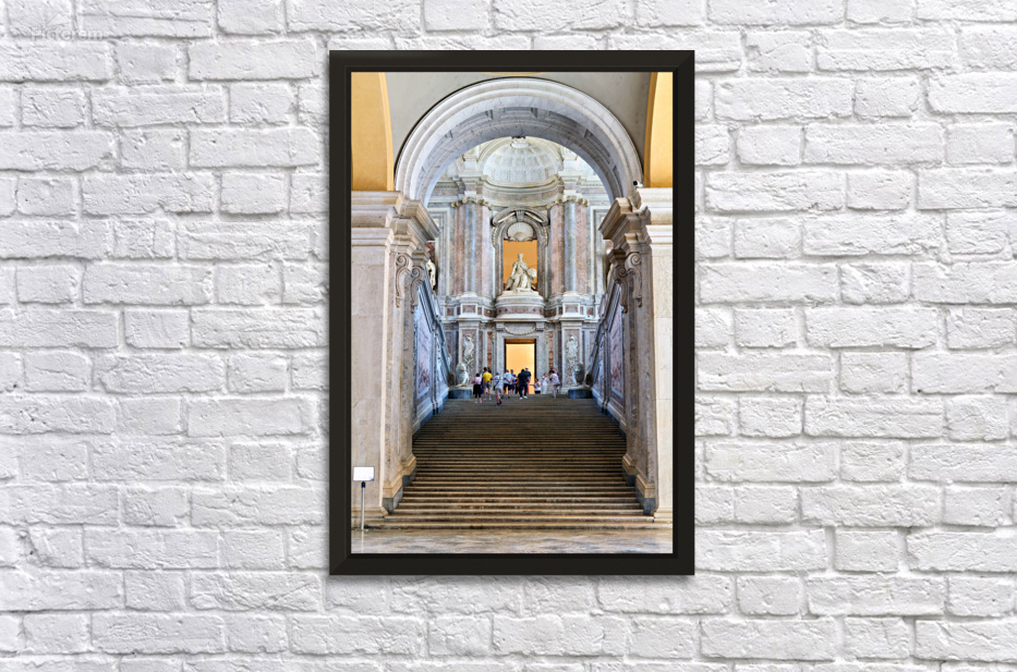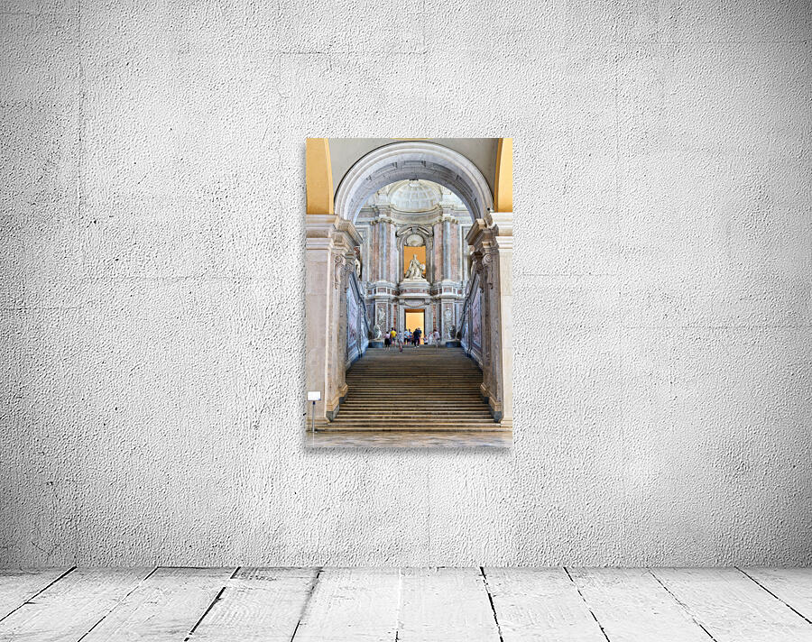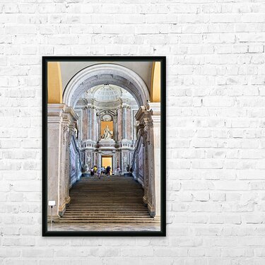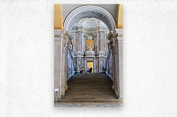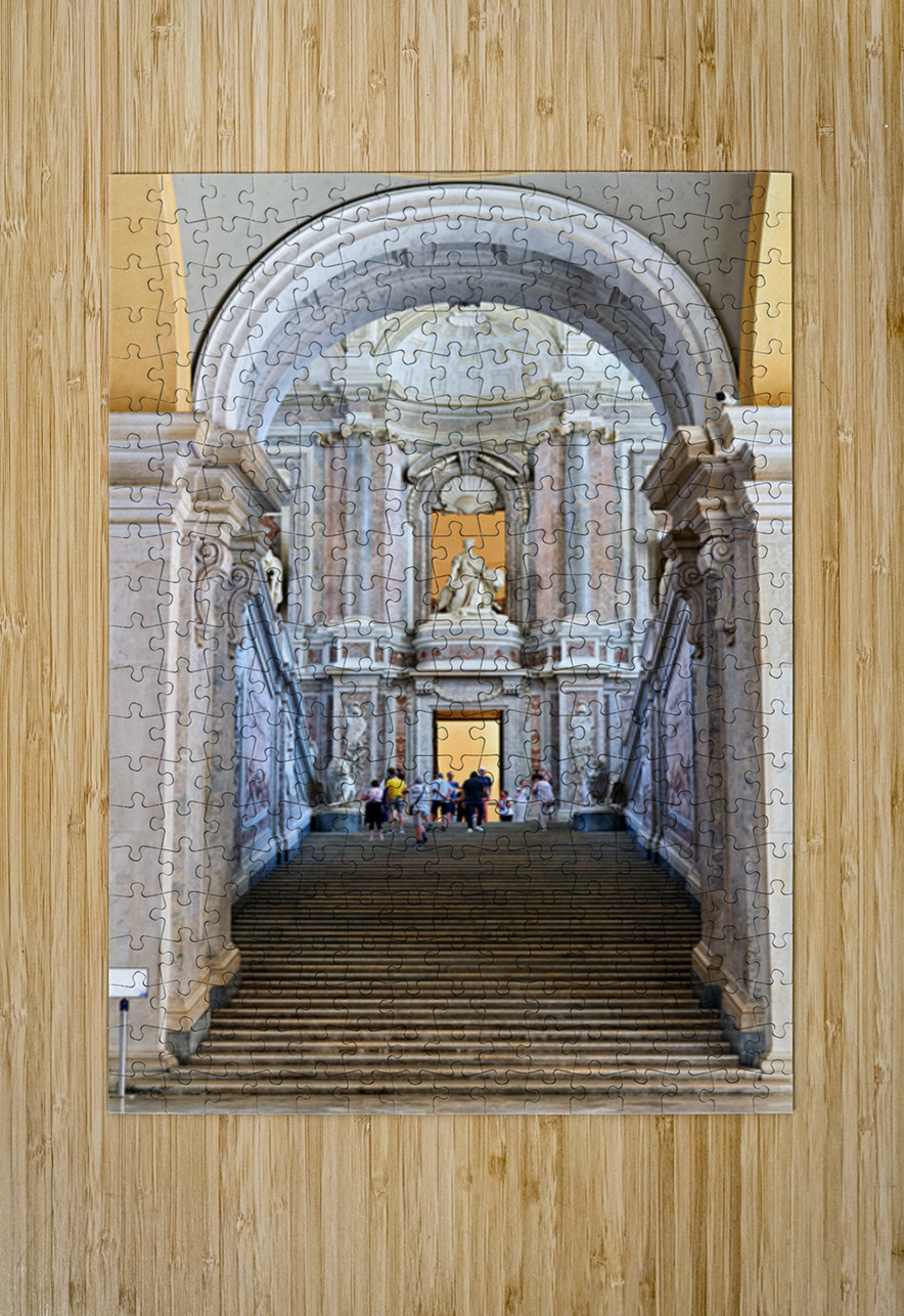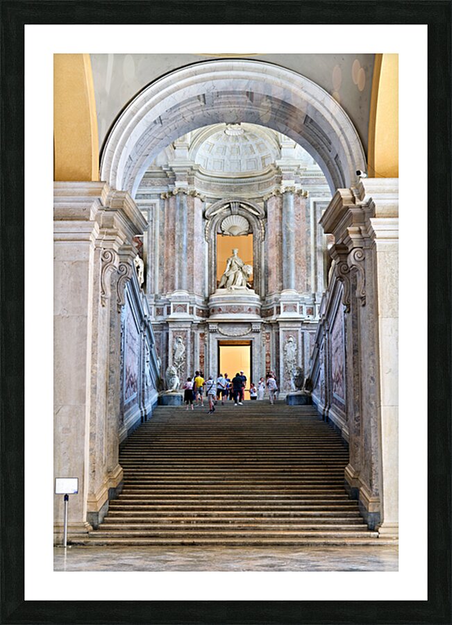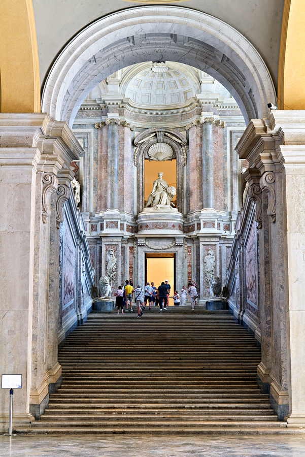 Visitors walk down the grand staircase at the entrance of the Royal Palace in Caserta Campania. The architecture is impressive.