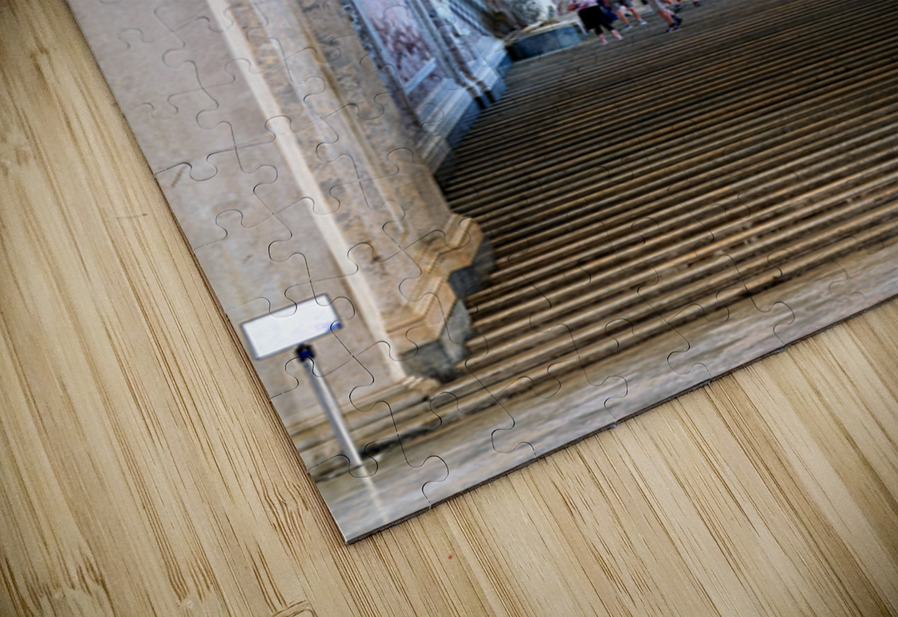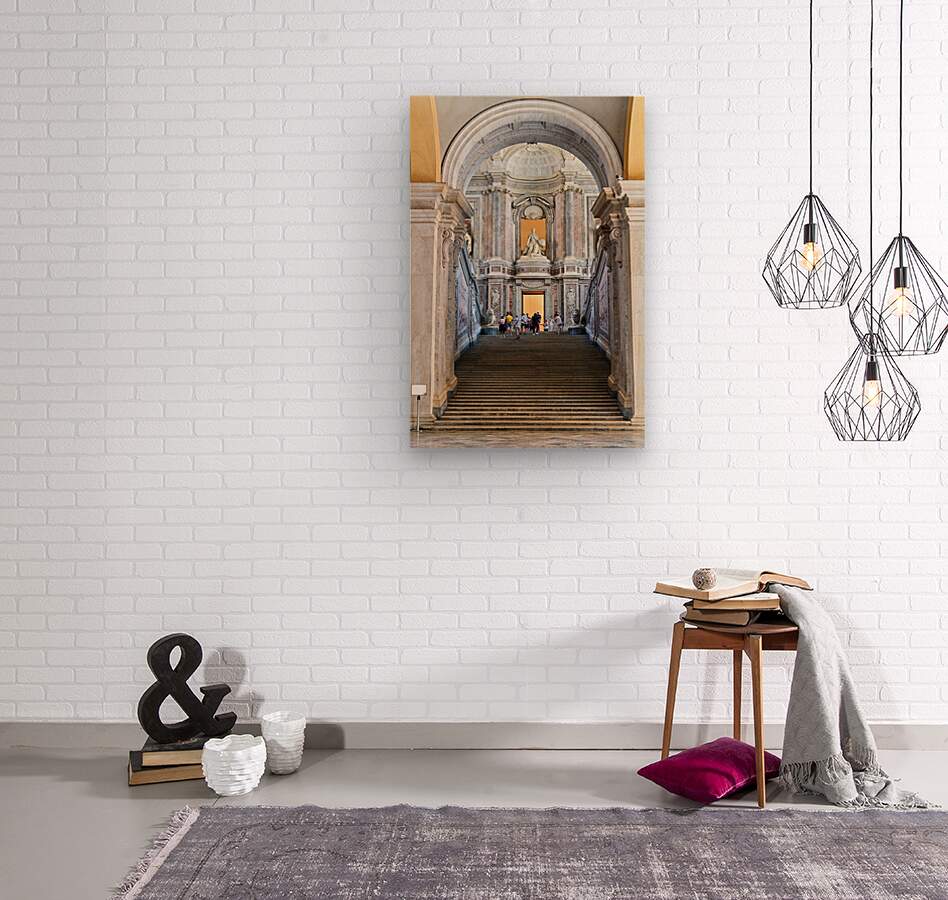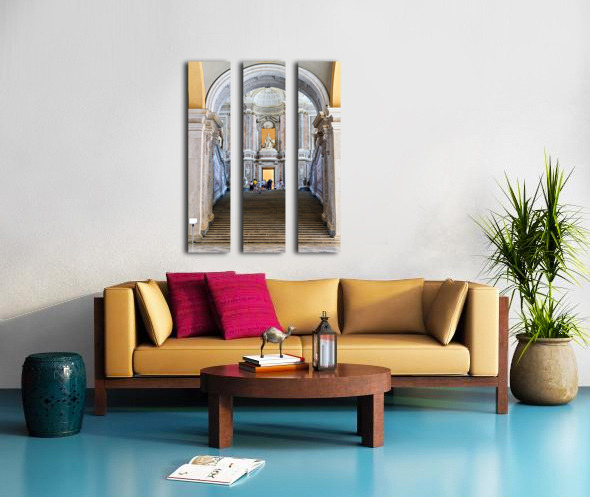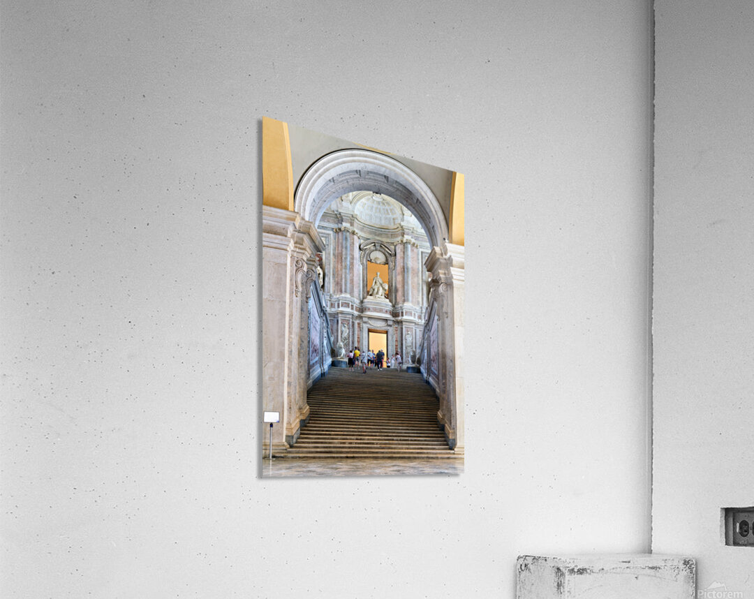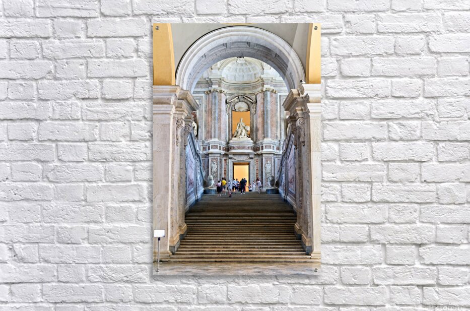 Visitors walk down the grand staircase at the entrance of the Royal Palace in Caserta Campania. The architecture is impressive.