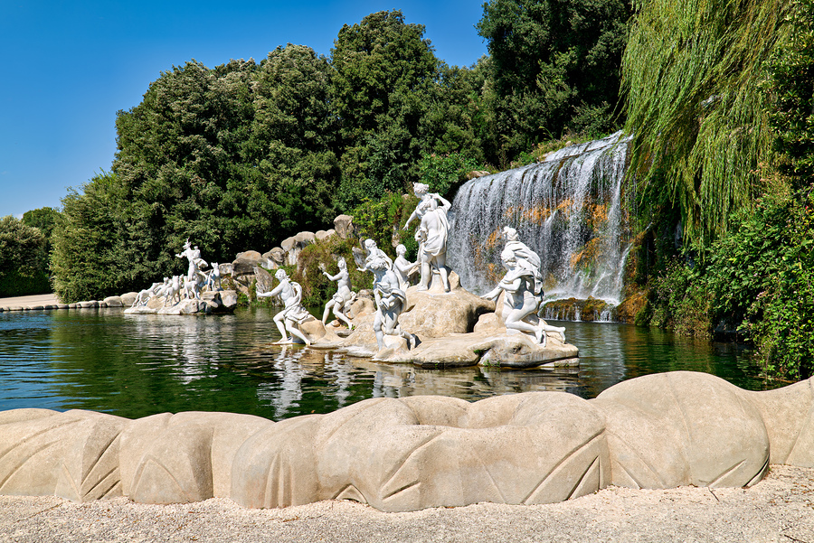 Visitors can see the fountain of Diana and Actaeon at the Royal Palace in Caserta Italy. The fountain has statues and water flowing.