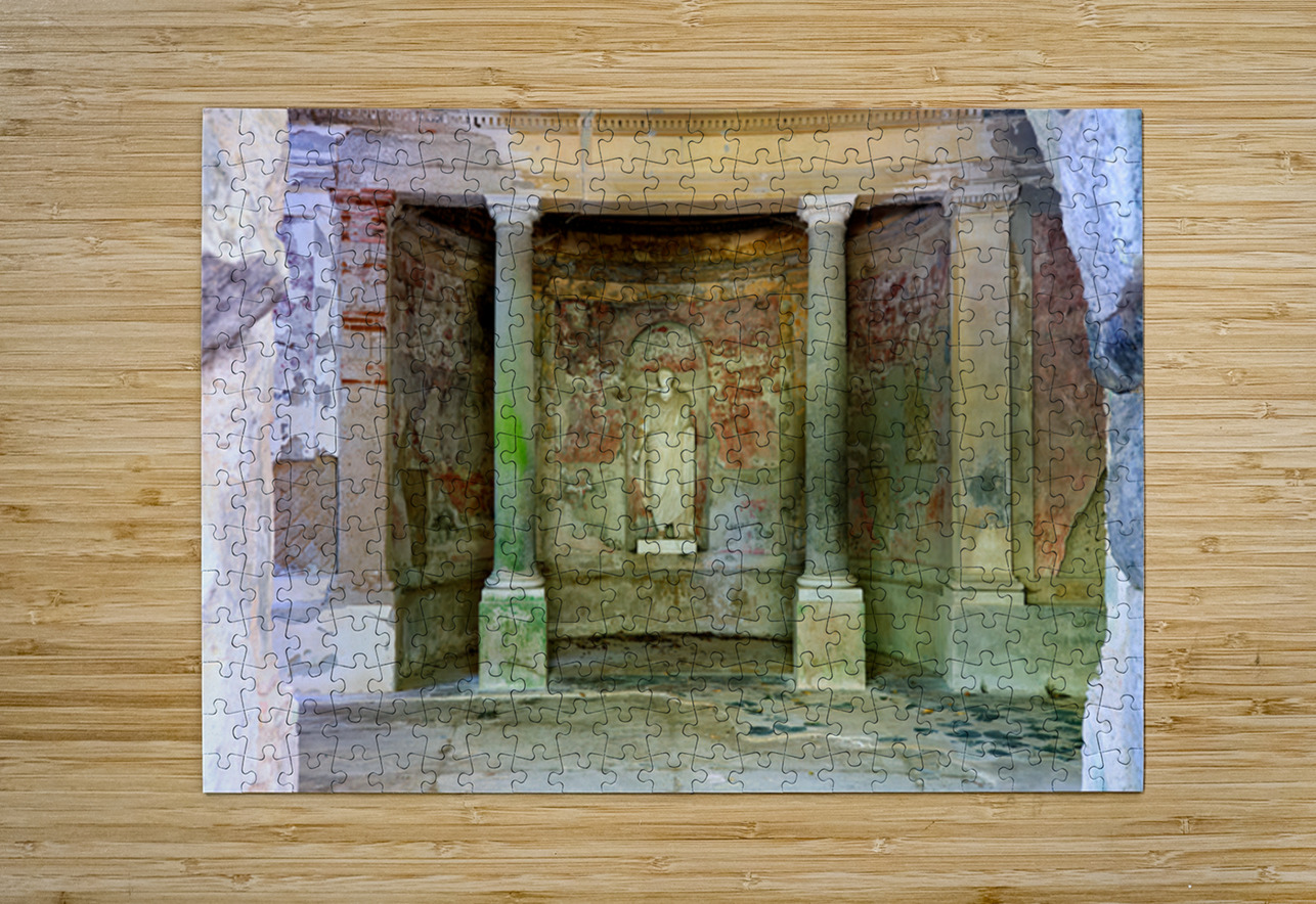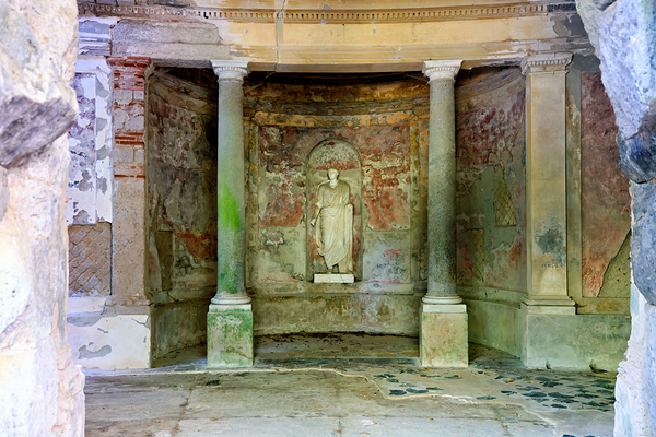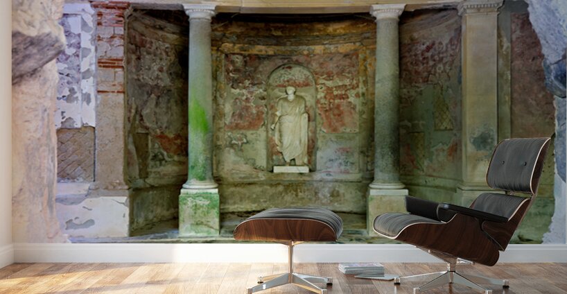 Visitors view the Cryptoporticus at the Bath of Venus in the Royal Palace in Caserta Italy. Old walls and a statue are part of the scene.