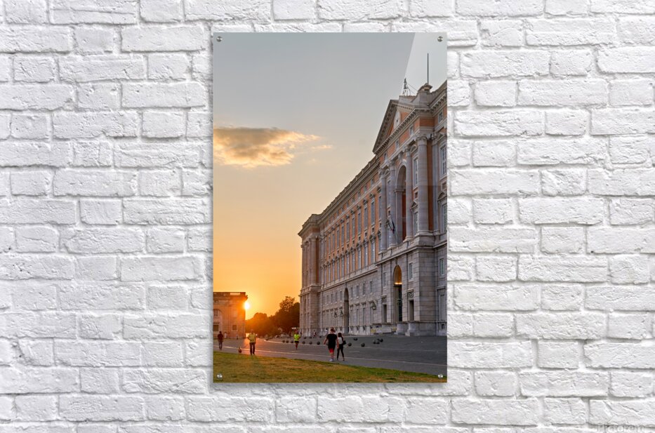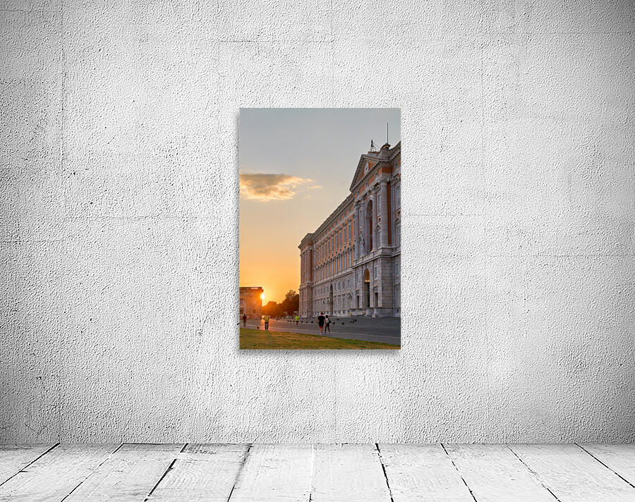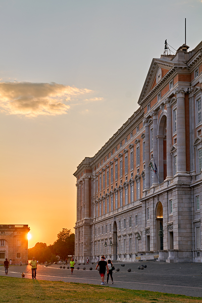People walk near the Royal Palace of Caserta as the sun sets behind the building in Campania. The scene captures daily life at dusk.
