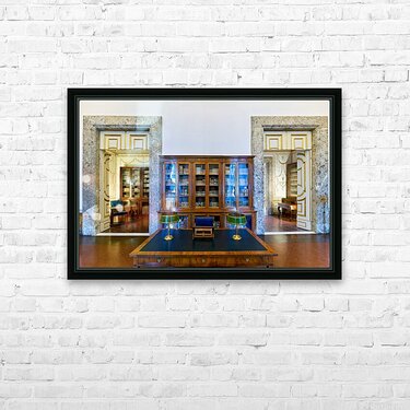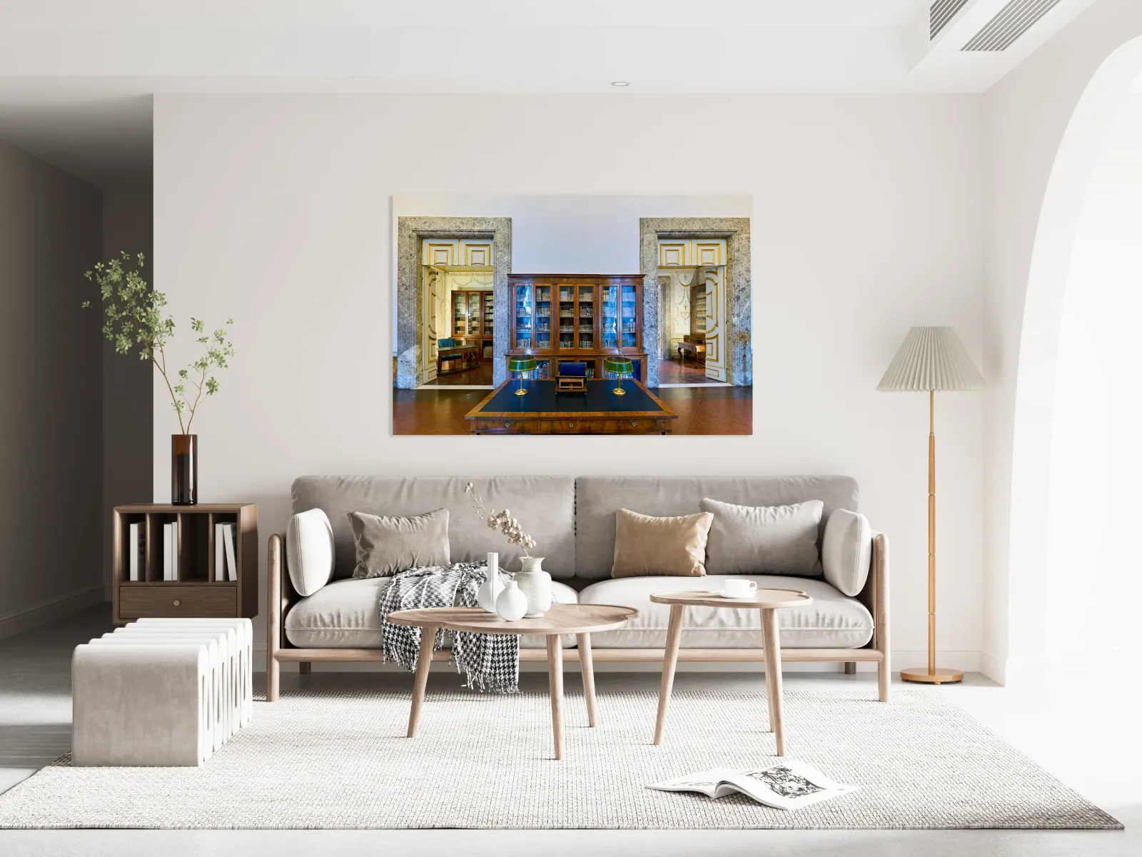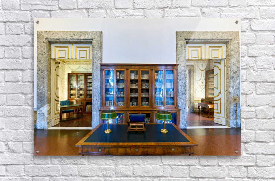 Visitors view books and furniture in the Palatine Library at the Royal Palace in Caserta Campania Italy during daylight hours.