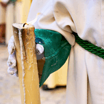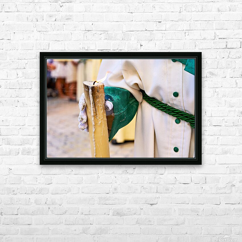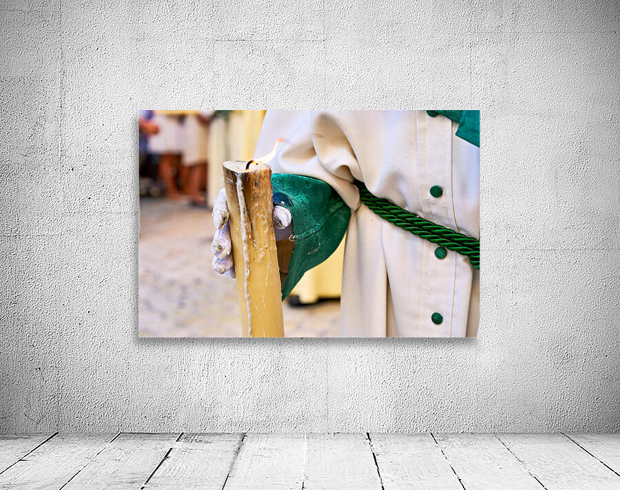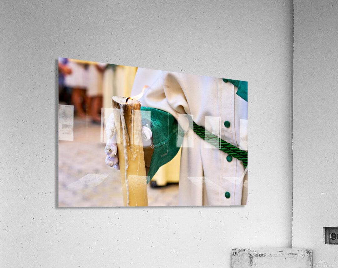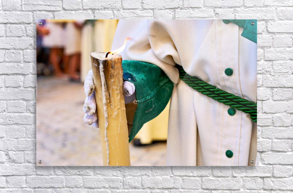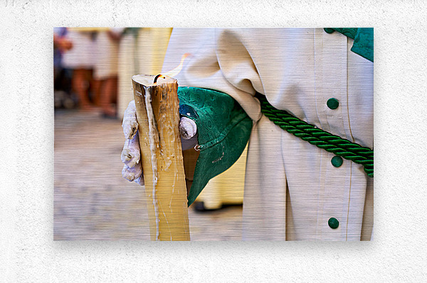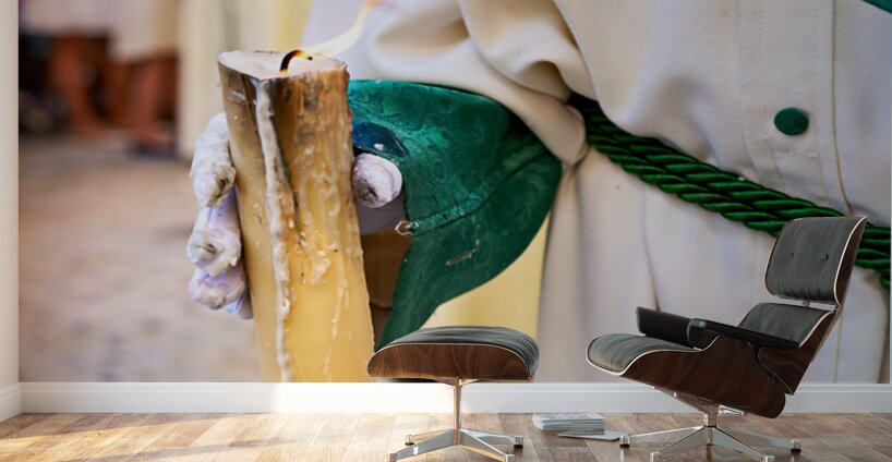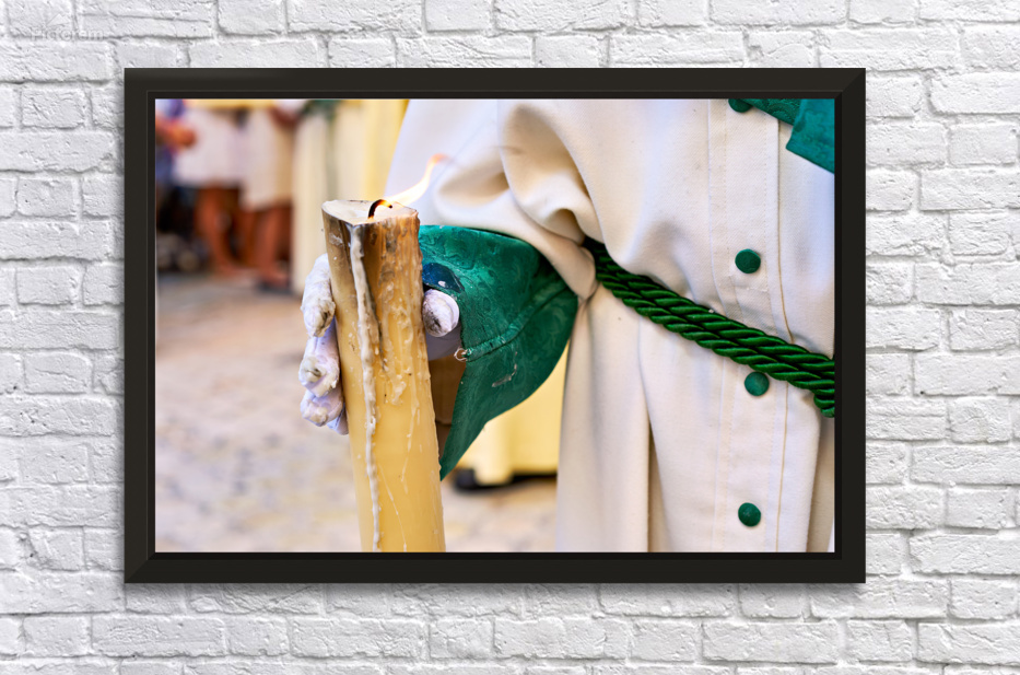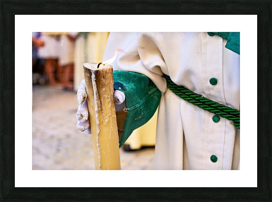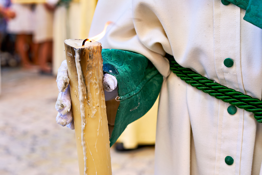 Participants hold lit candles during the Easter Holy Week procession in Malaga Andalusia. The event features traditional rituals and costumes.