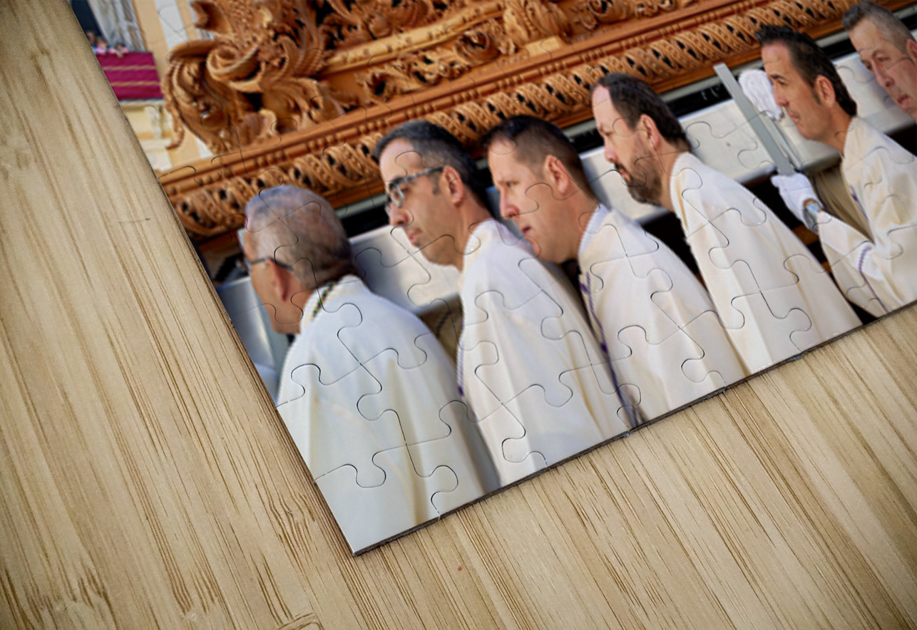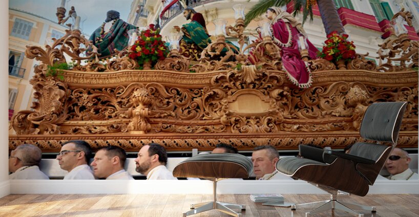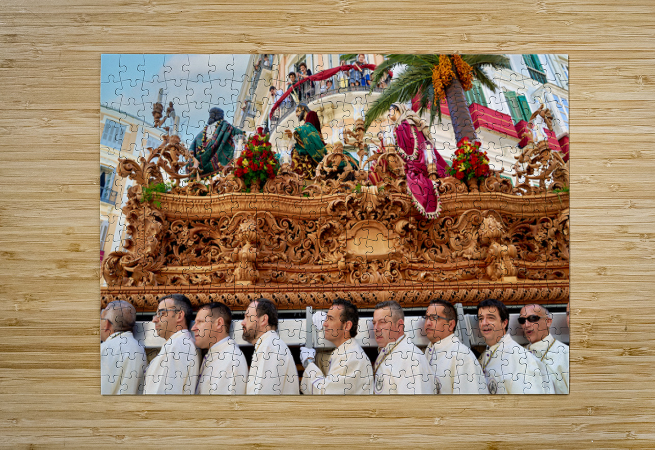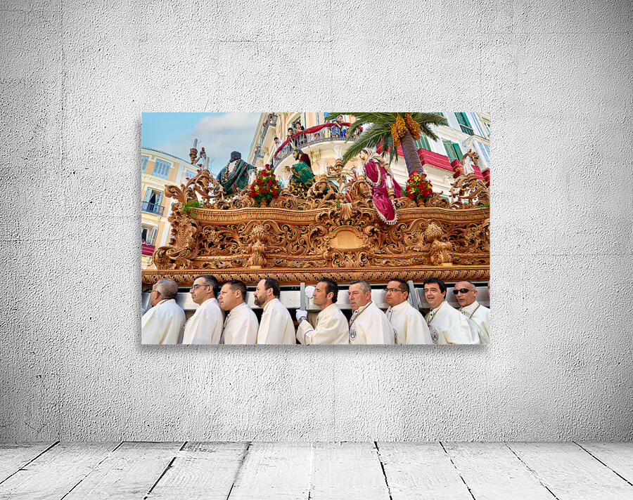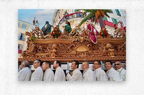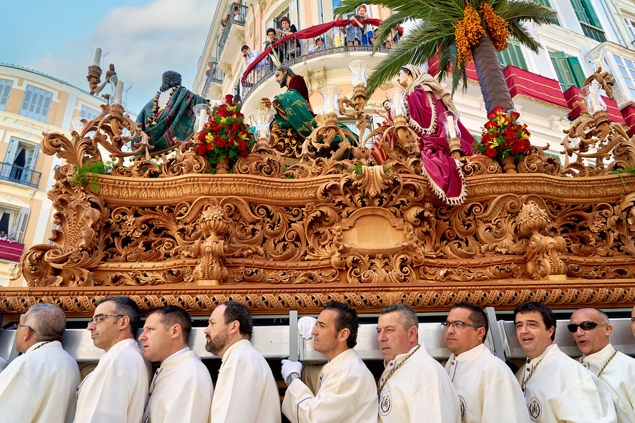 People participate in processions for Easter Holy Week in Malaga Spain. They carry ornate wooden floats through the streets.