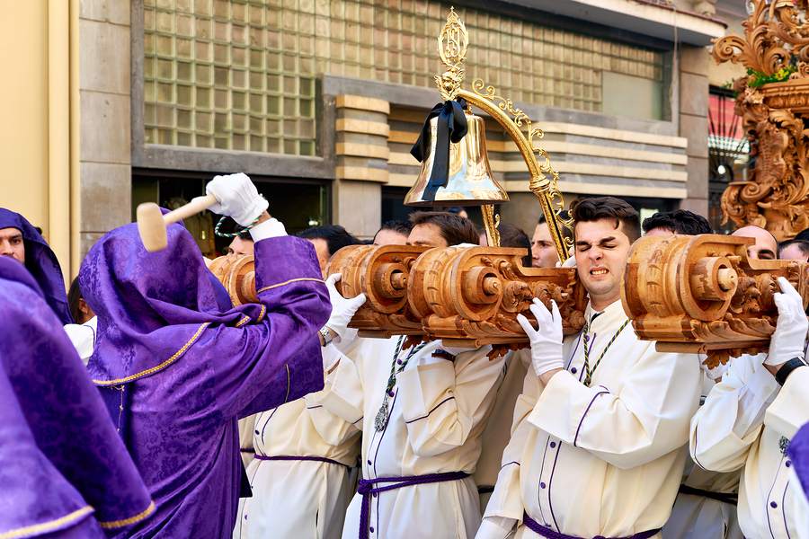 People carry a large religious float during the Easter Holy Week processions in Malaga Andalusia. This event shows deep traditions and faith.