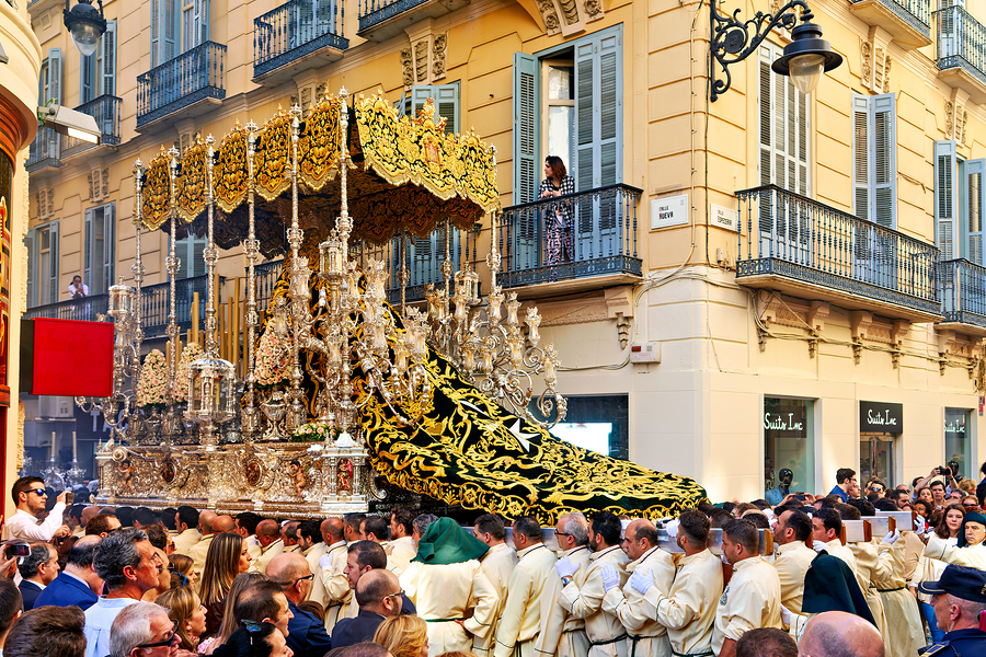 Large religious float moves through streets of Malaga during Easter Holy Week. Many people watch and participate in the procession.