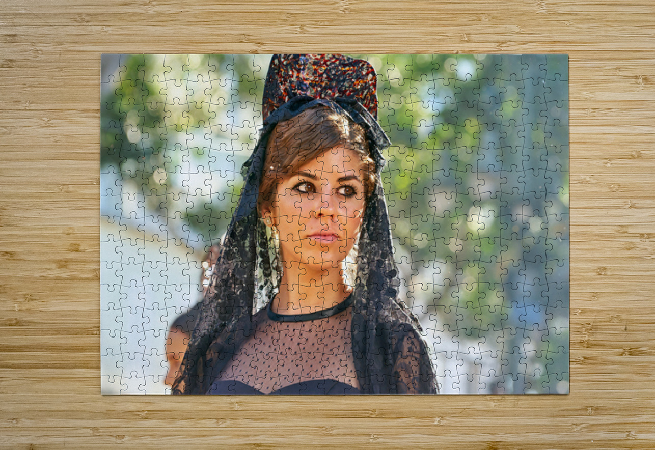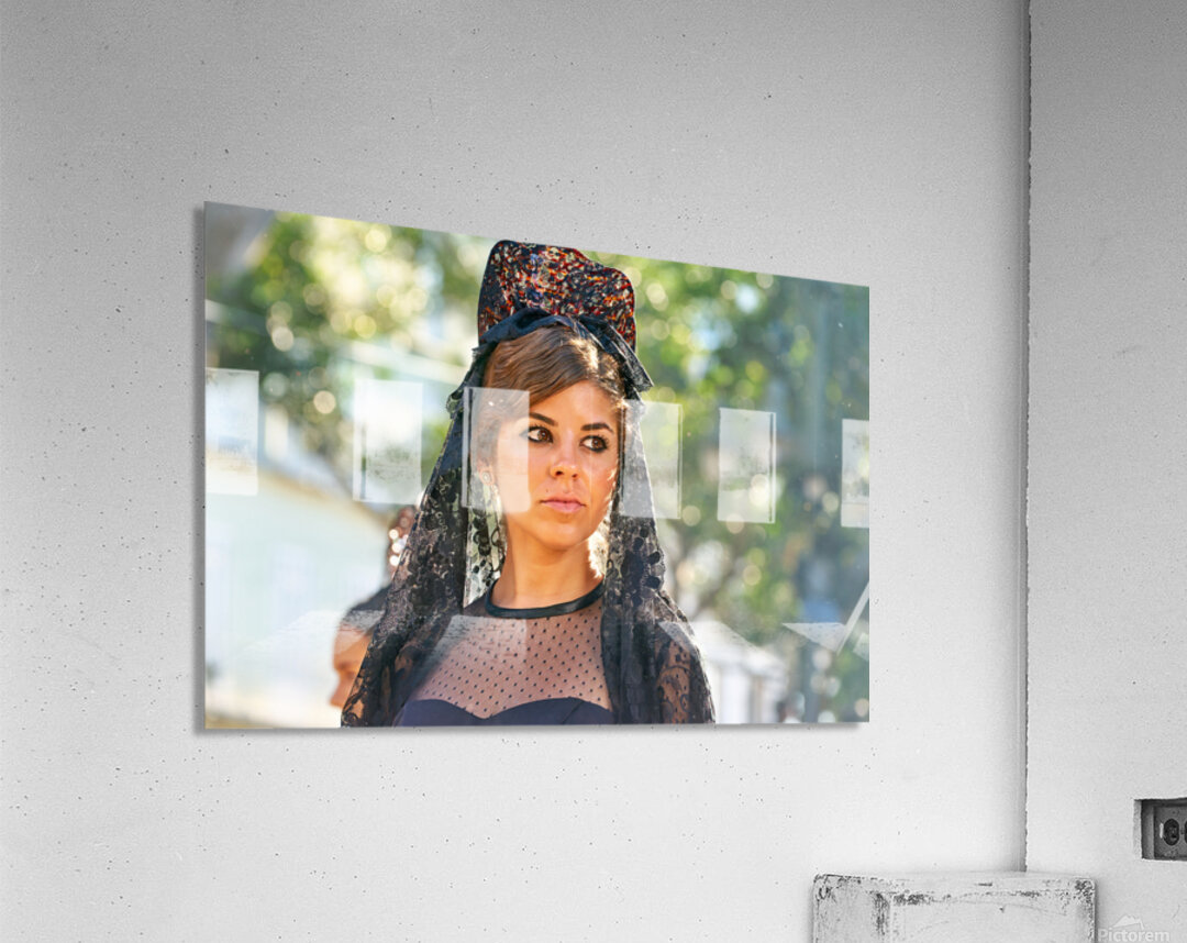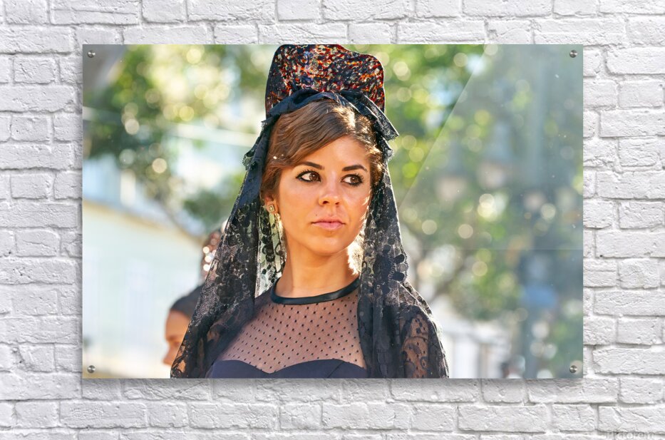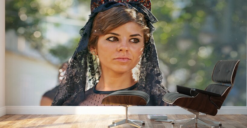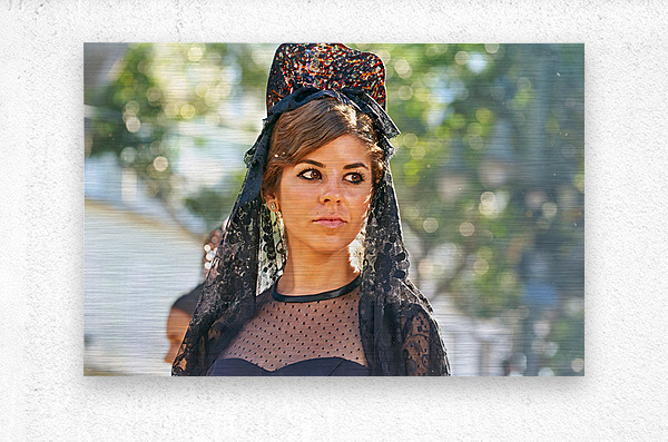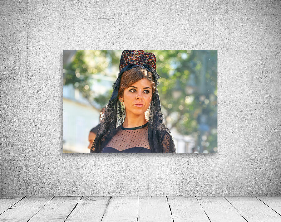 People walk through the streets of Malaga Spain taking part in the Easter Holy Week events. Traditional outfits are worn by many participants.