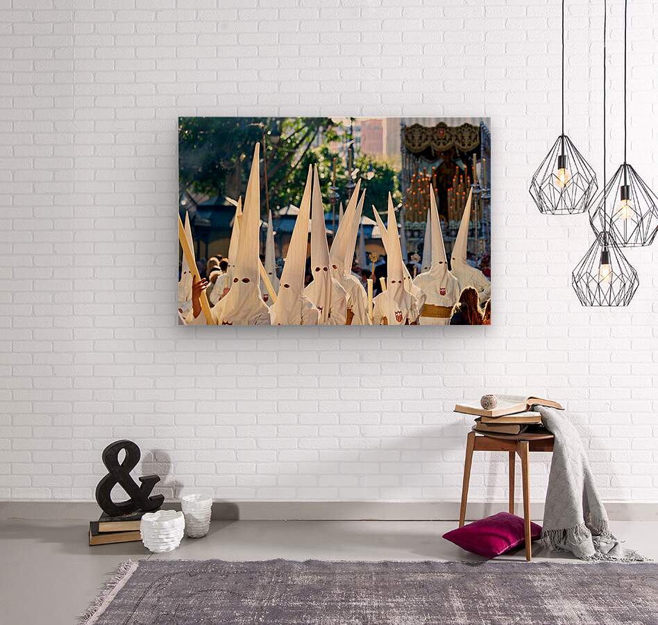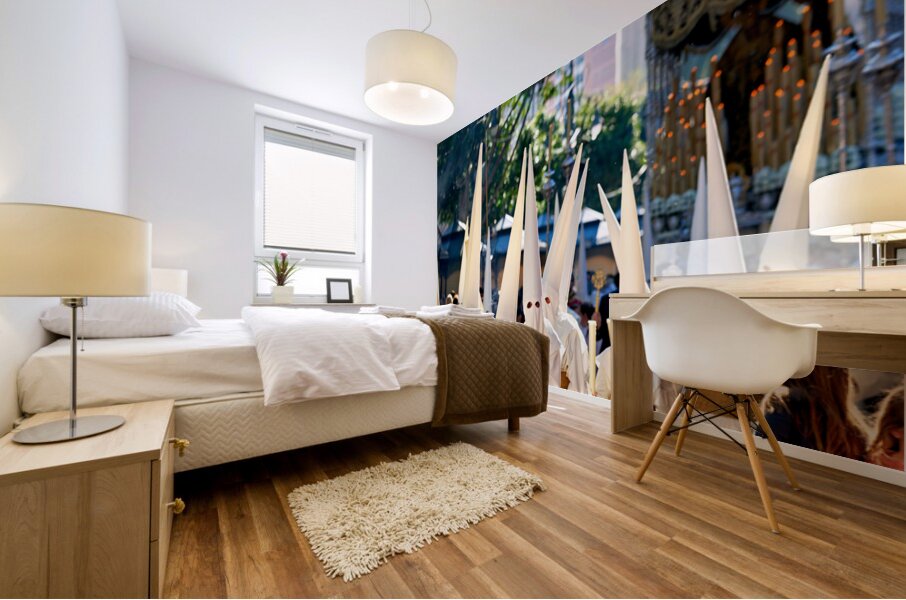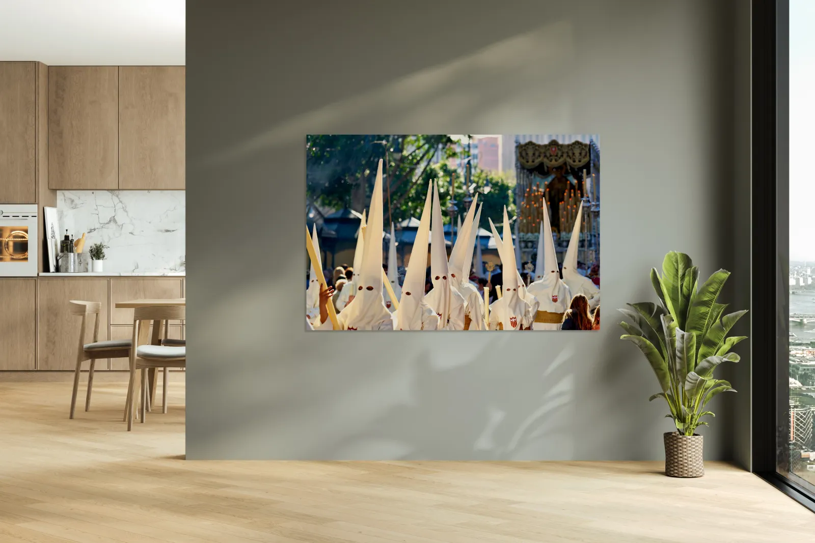 People walk in a procession wearing white robes and cone hats. This event takes place in Malaga Spain during Easter Holy Week.