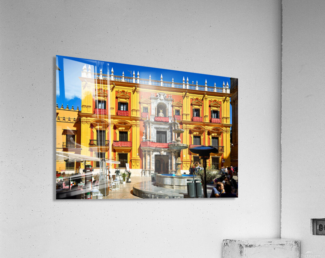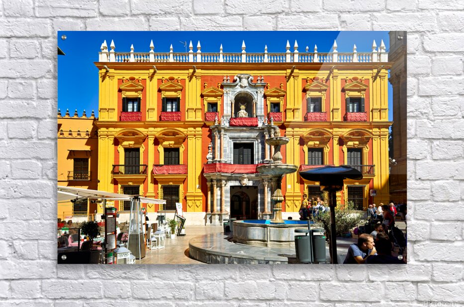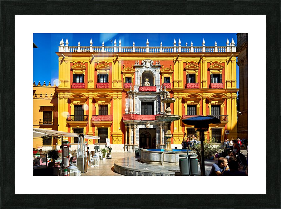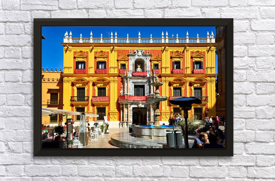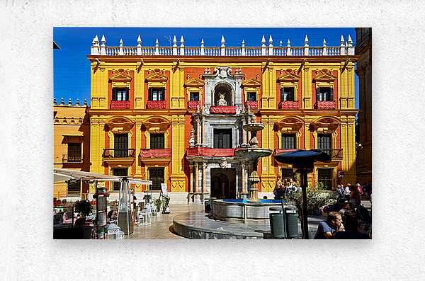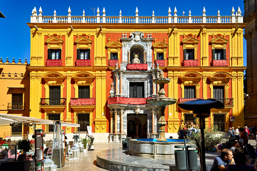Tourists gather around a fountain in Malagas historic downtown. The sun shines on the vibrant buildings and lively atmosphere.
