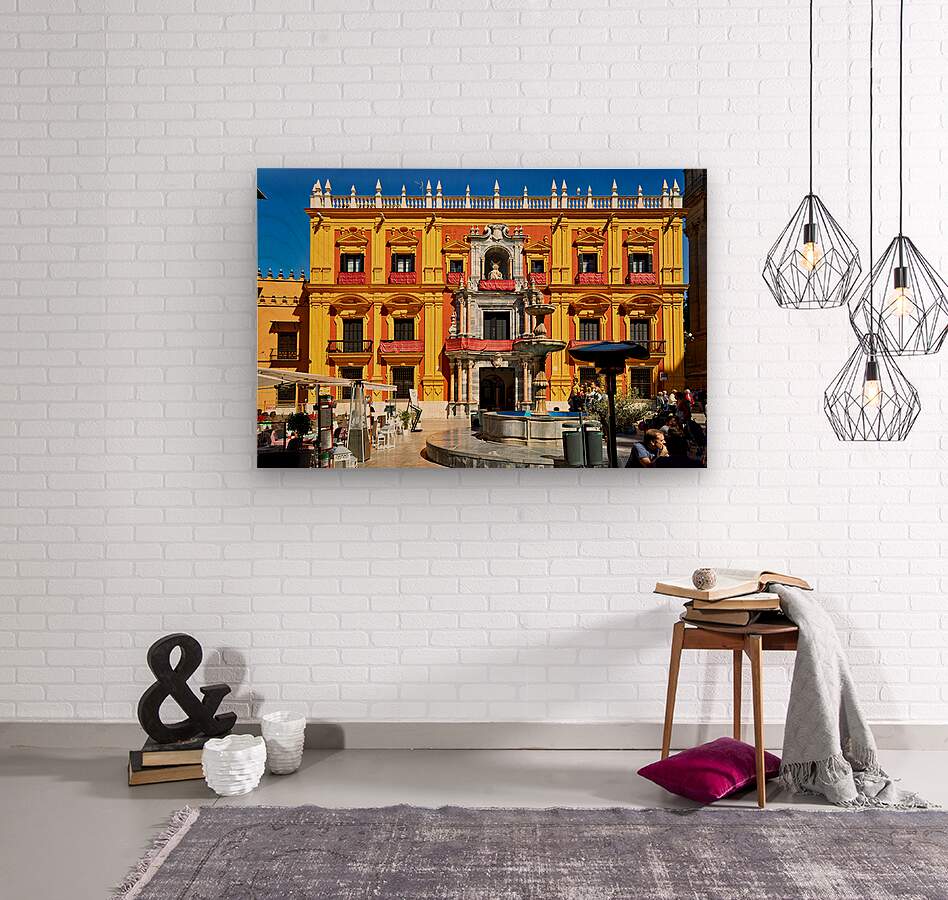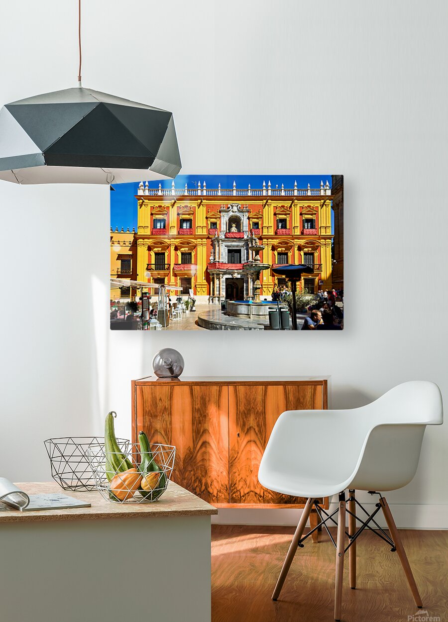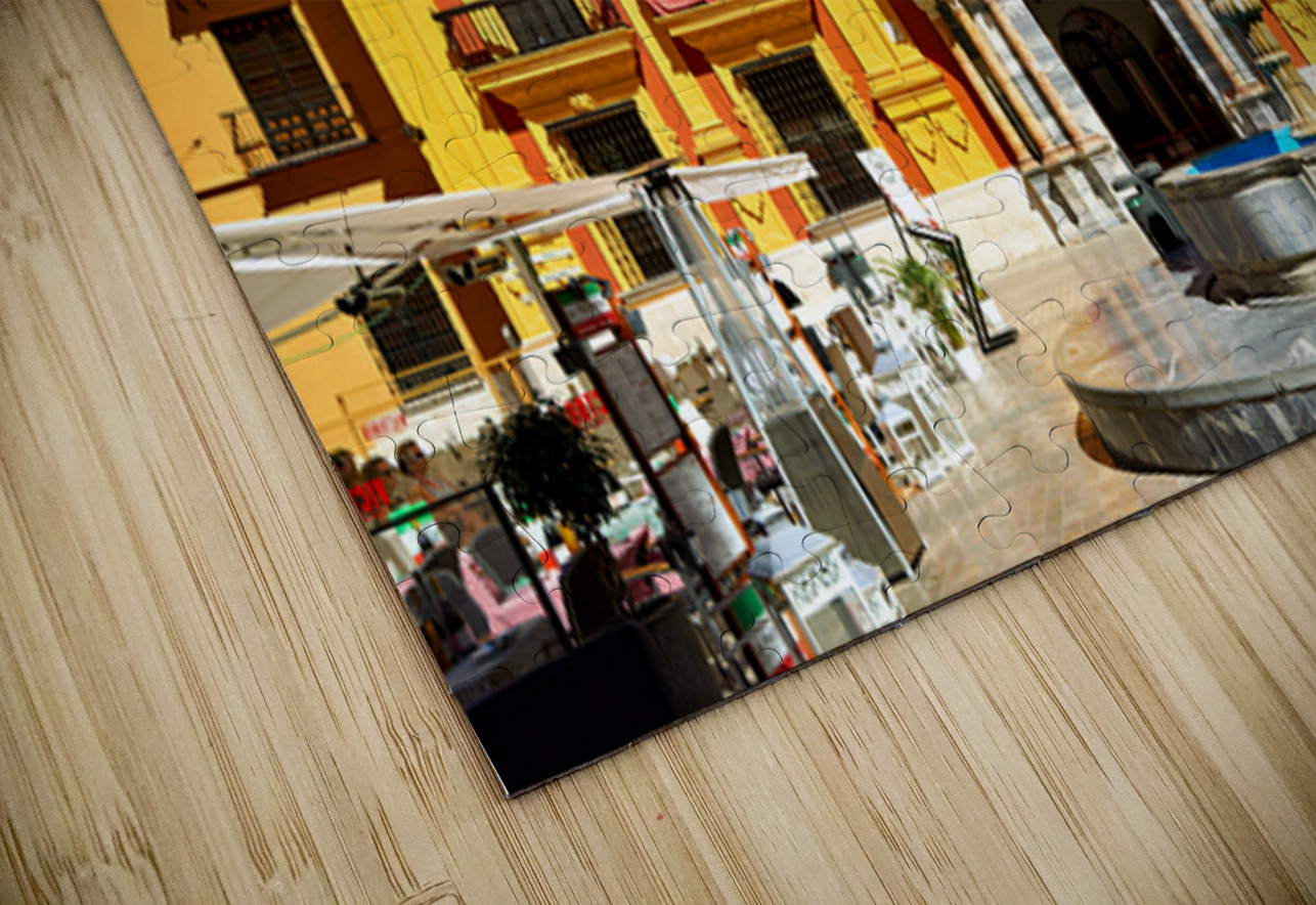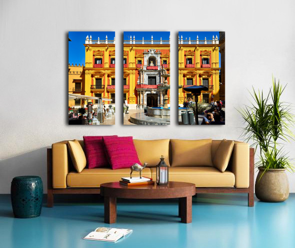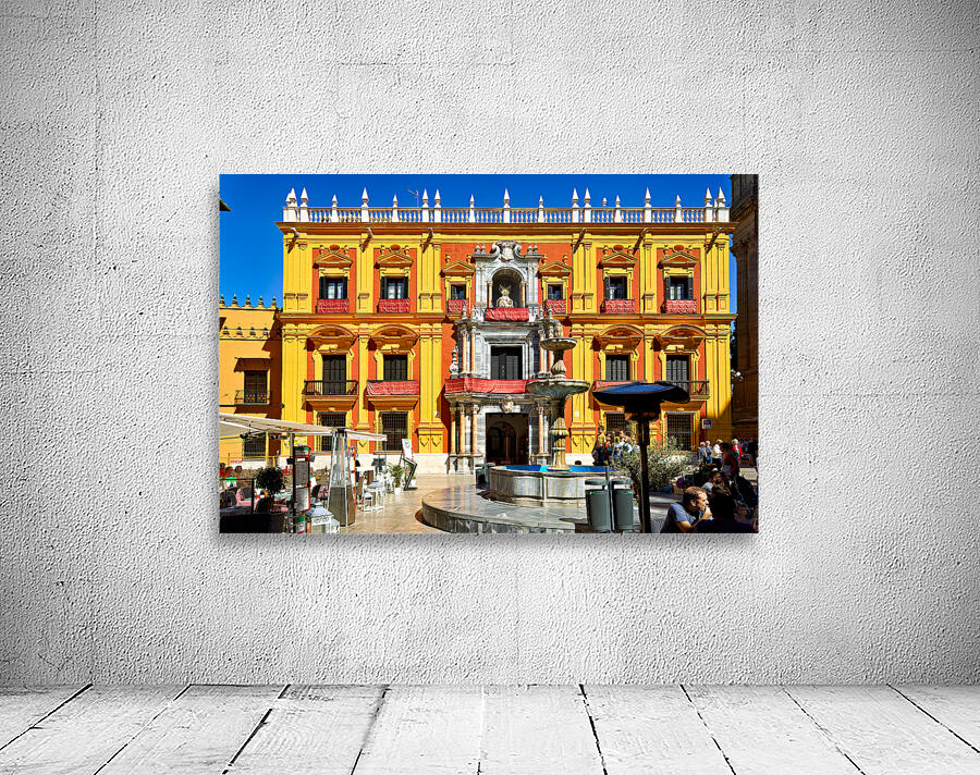Tourists gather around a fountain in Malagas historic downtown. The sun shines on the vibrant buildings and lively atmosphere.