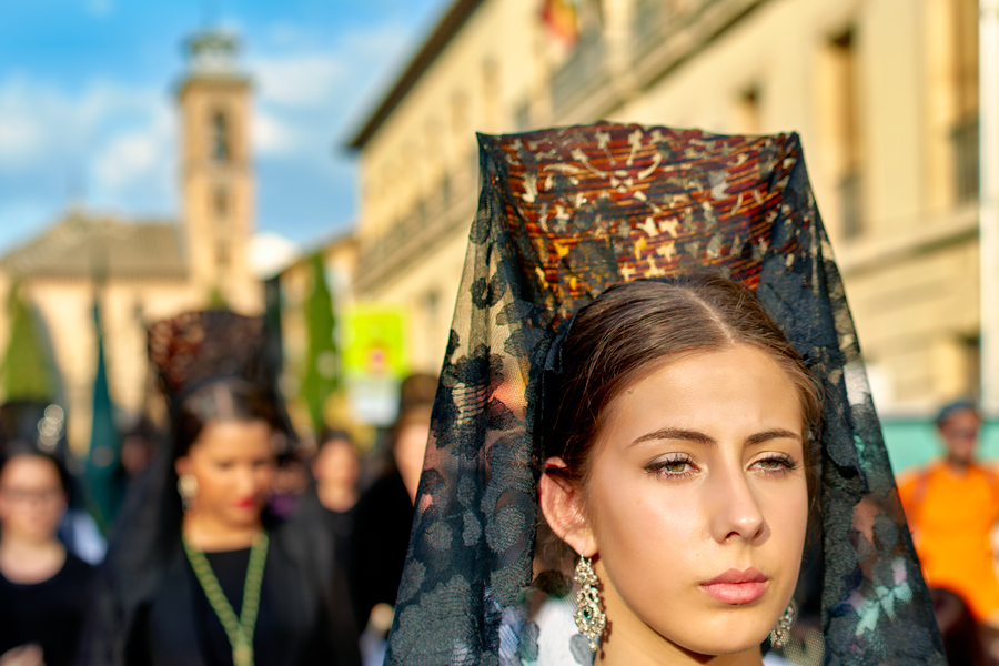 People take part in processions for Easter Holy Week in Granada Spain. They wear traditional clothing and carry religious items through the streets.