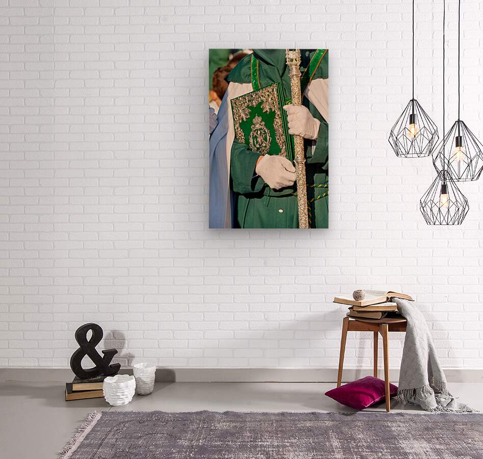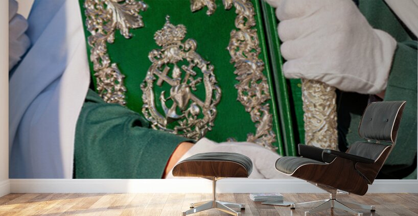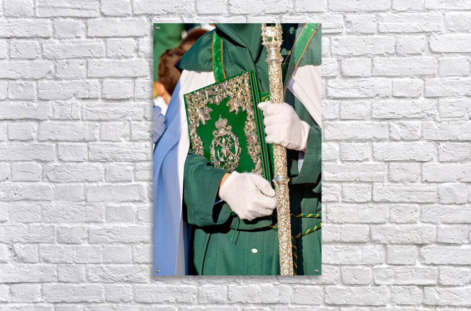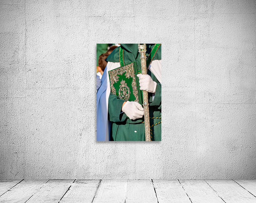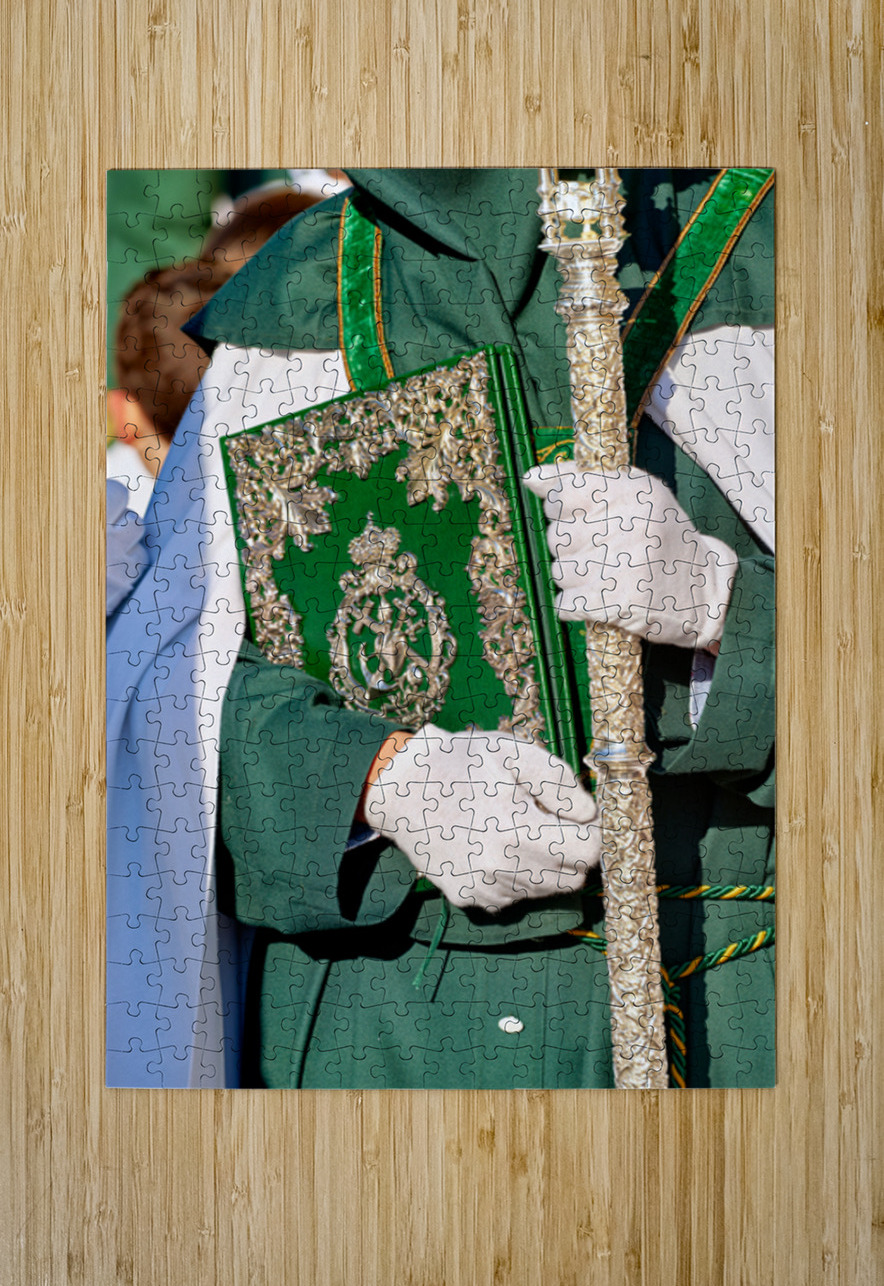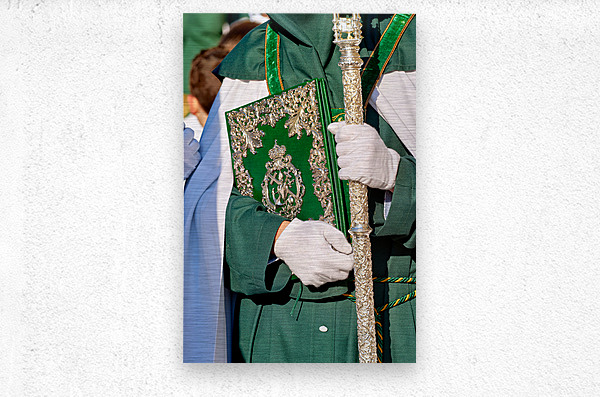 During Easter Holy Week in Granada people participate in processions. A figure holds a book and a staff while dressed in a robe.