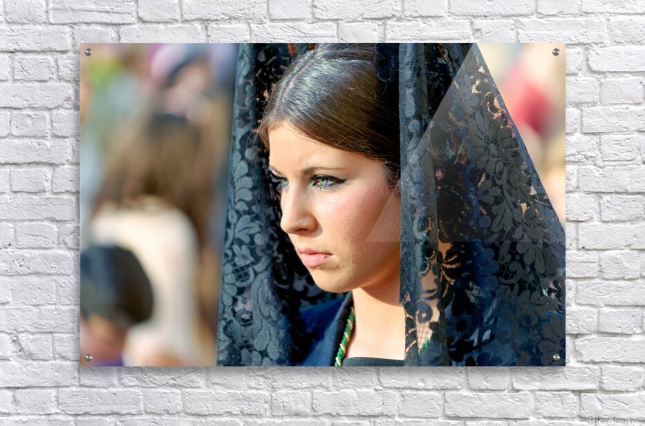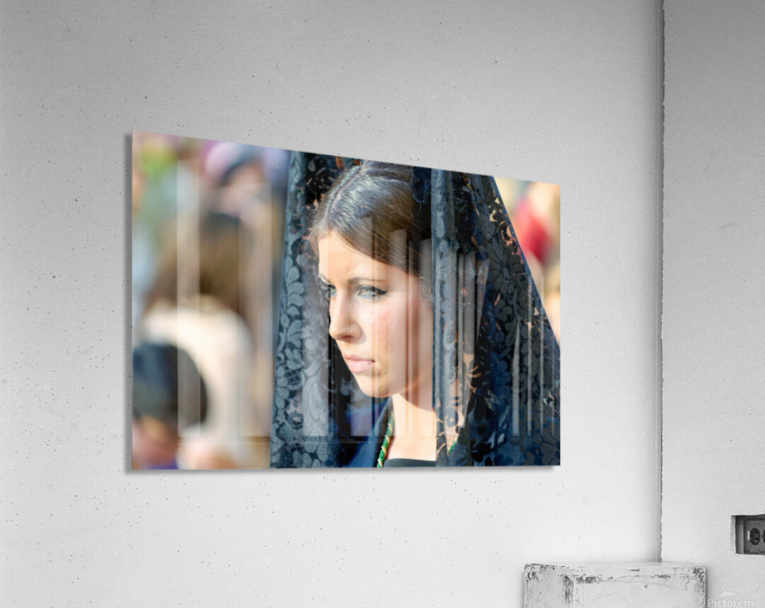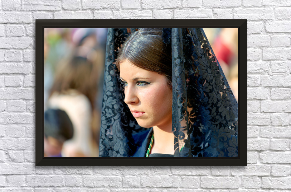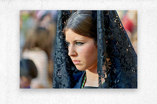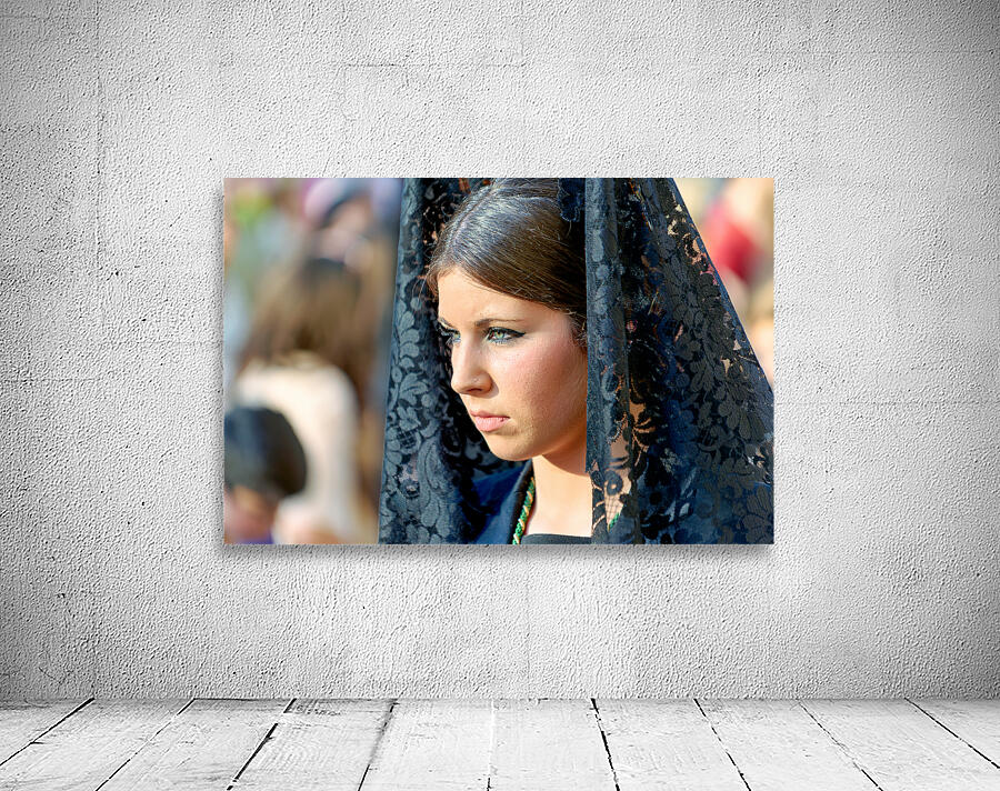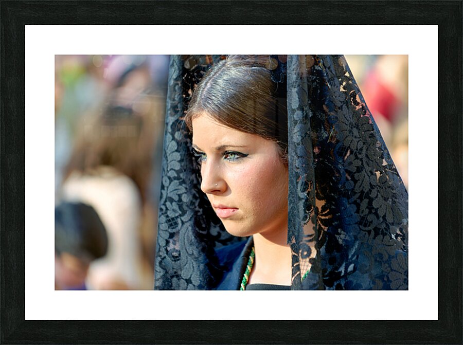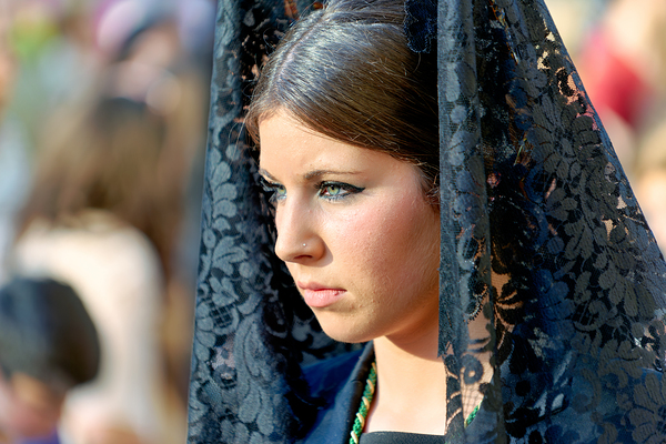 During Easter Holy Week in Granada people participate in processions wearing traditional attire. A woman stands among the crowd deep in thought.