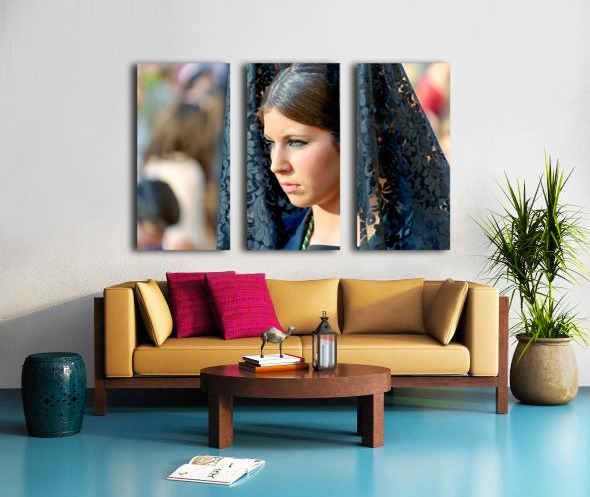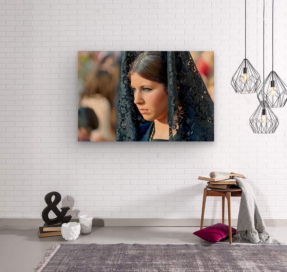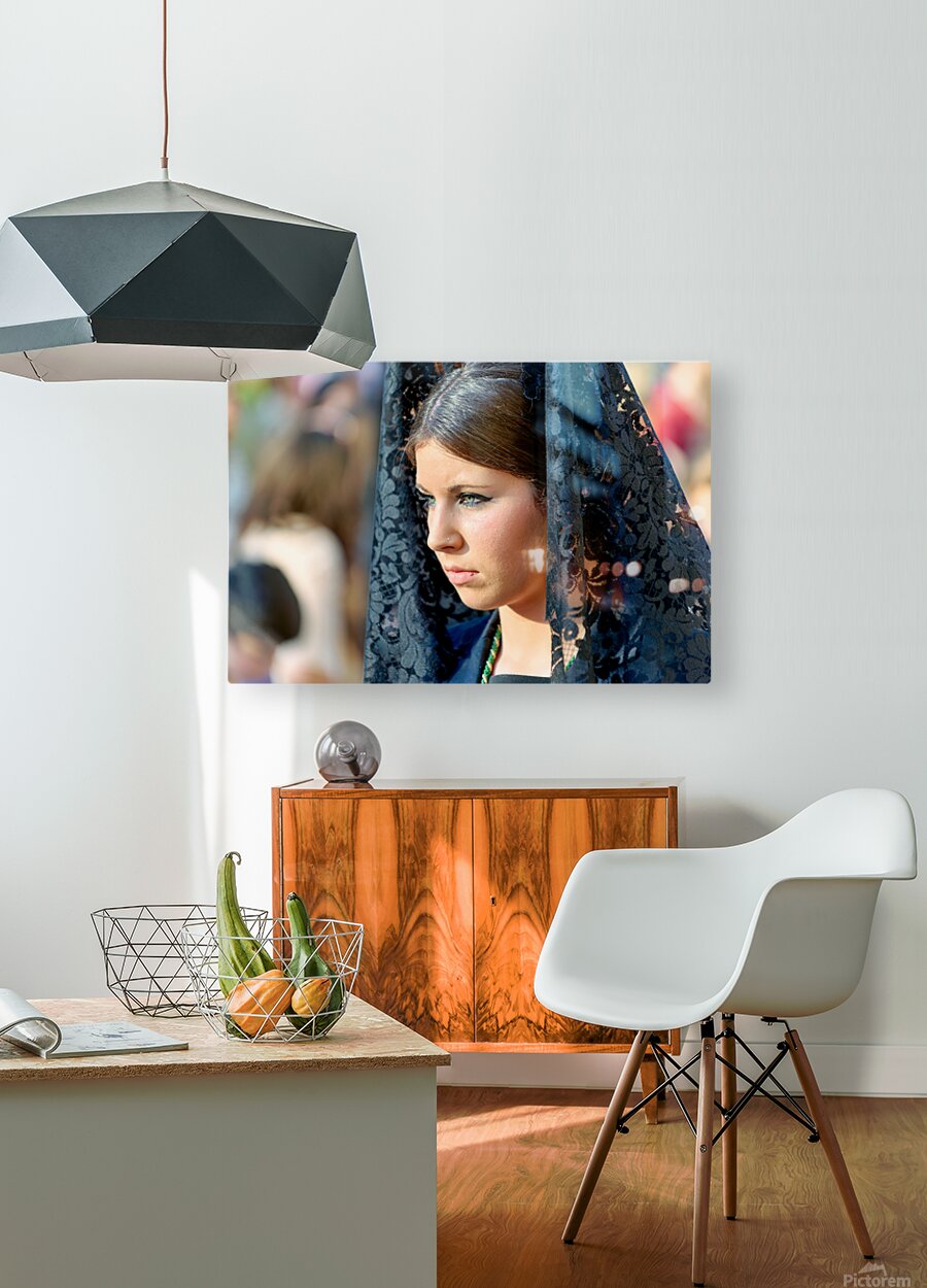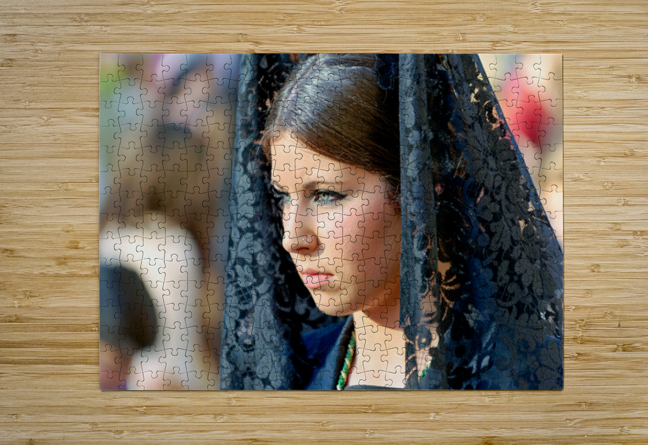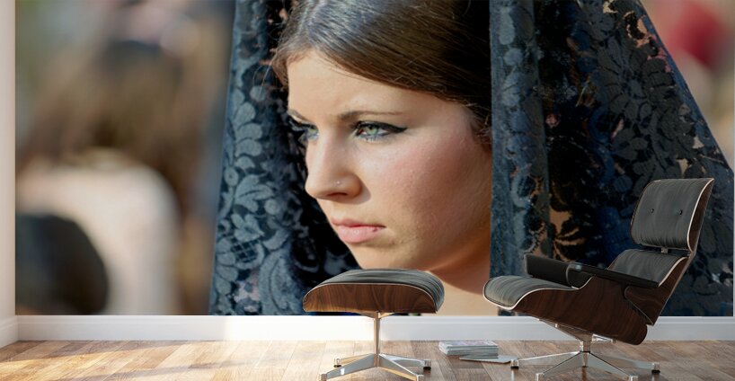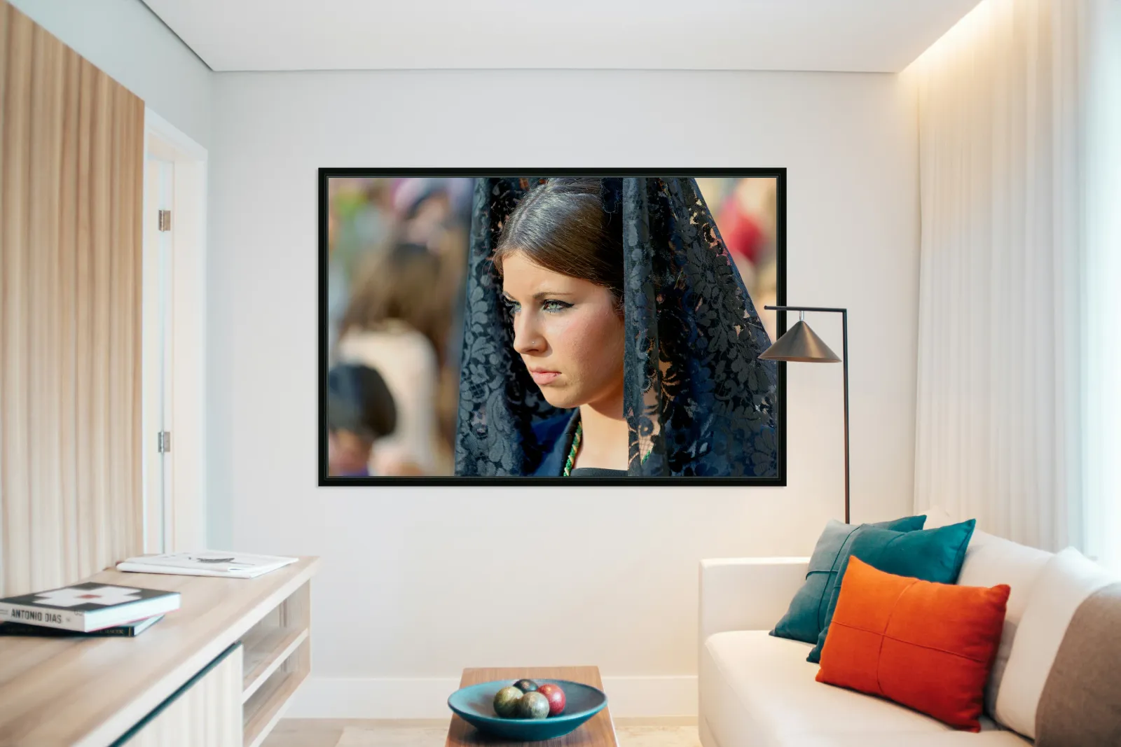 During Easter Holy Week in Granada people participate in processions wearing traditional attire. A woman stands among the crowd deep in thought.