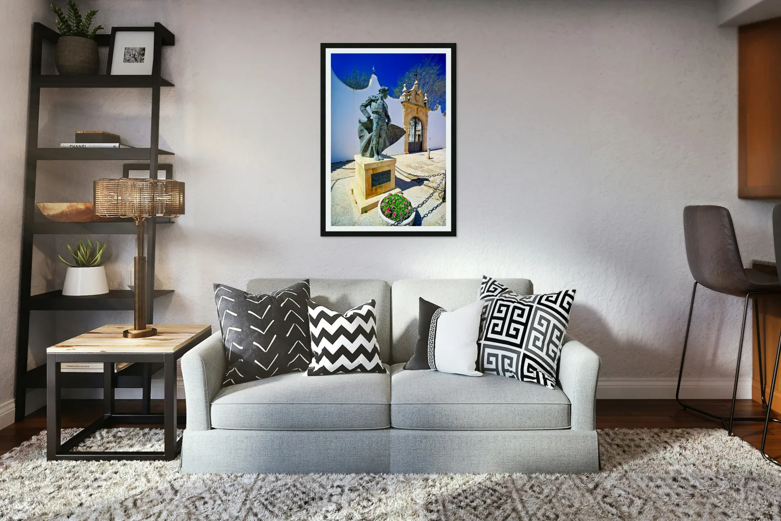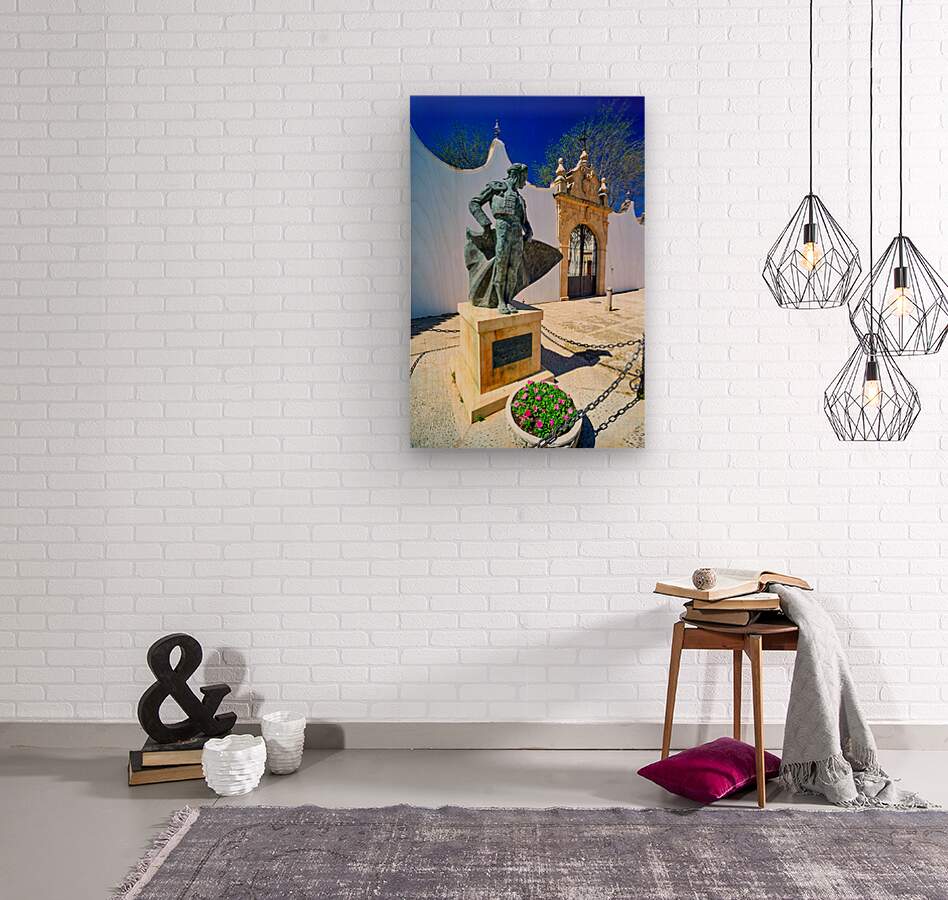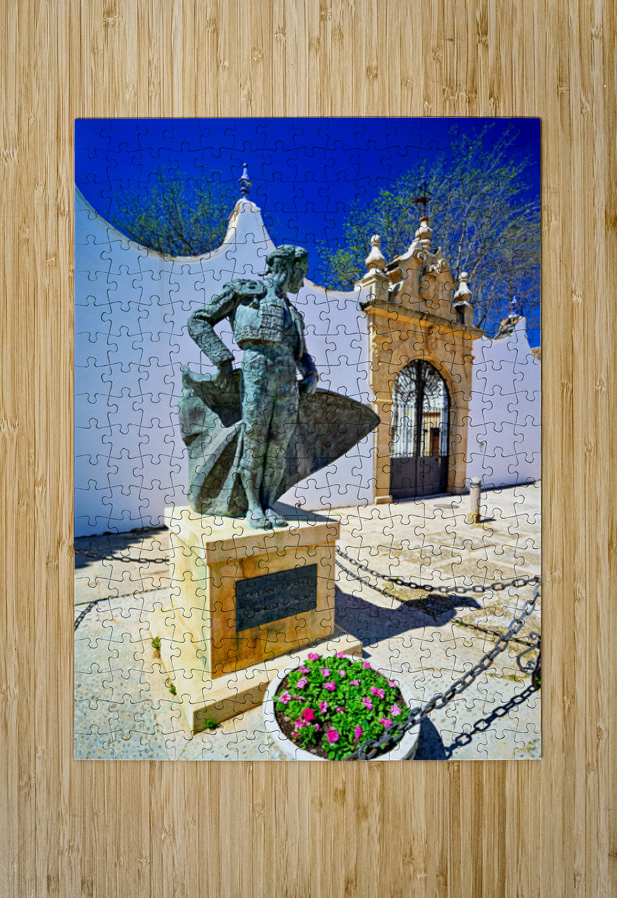 The entrance to the bullring in Ronda shows a statue of a matador. Bright flowers and a clear sky frame the scene.